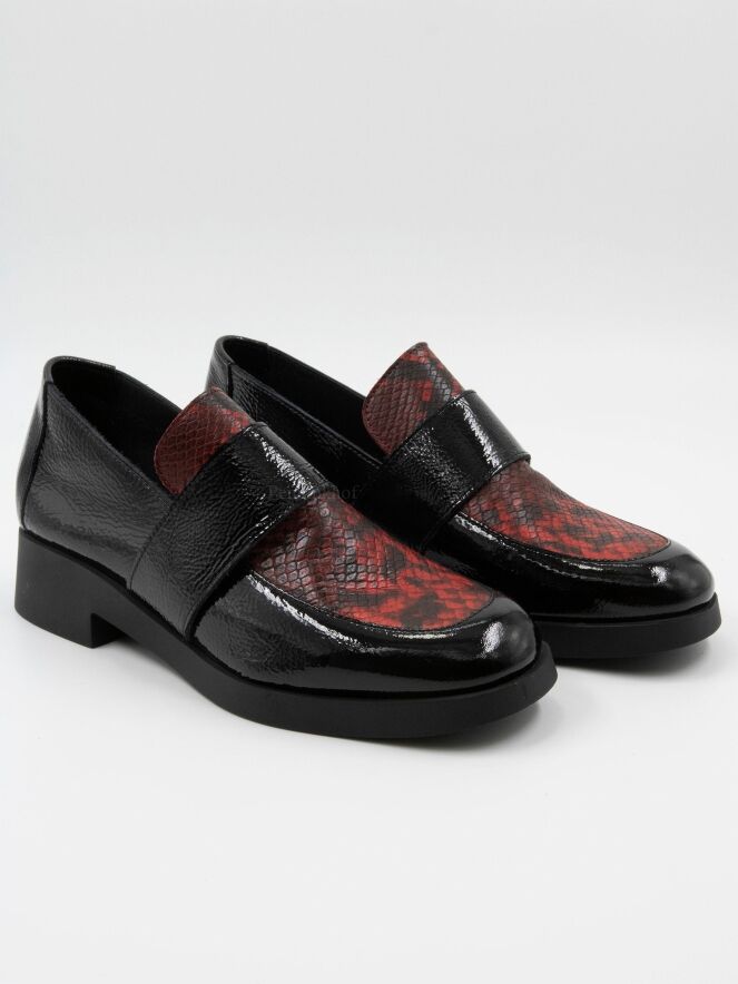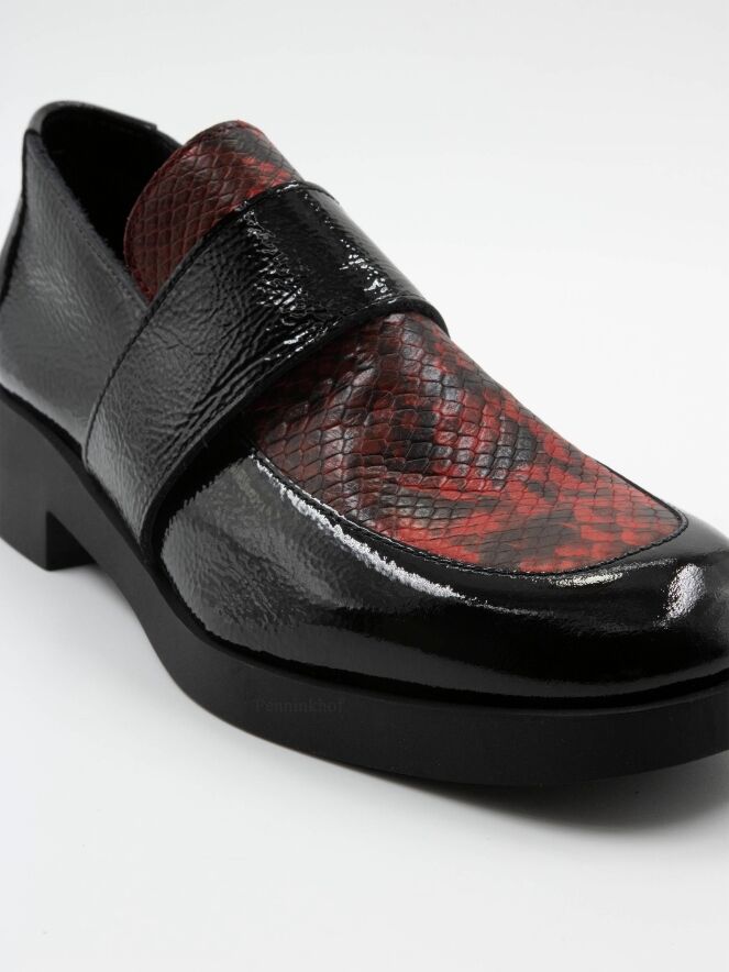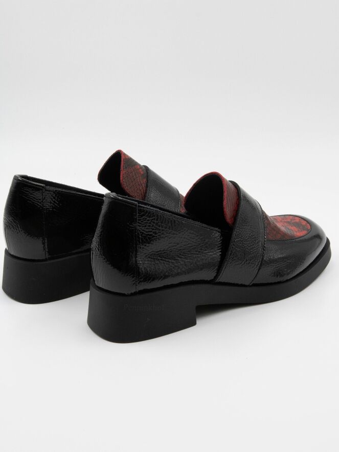 Une chaussure plate à talon court d'Arche en cuir verni noir. L'avant-pied et la languette de la chaussure sont imprimés d'un reptile rouge. L'avant-pied est traversé par une lanière en cuir verni noir.