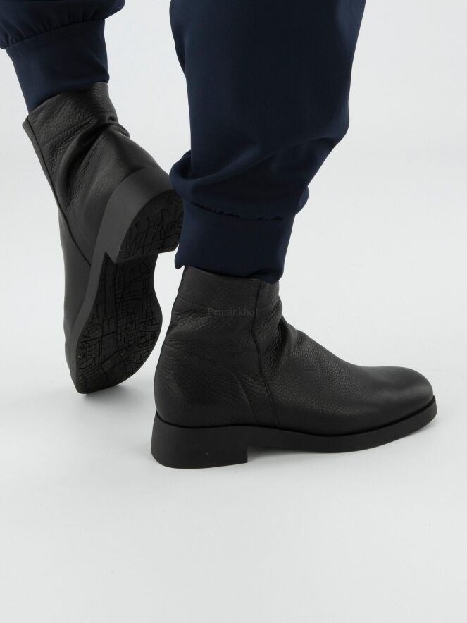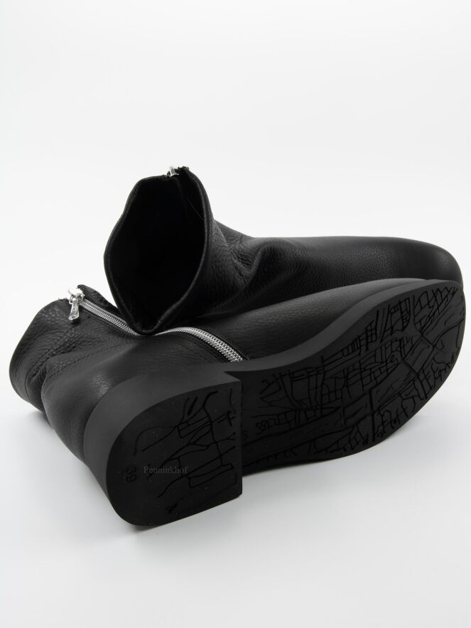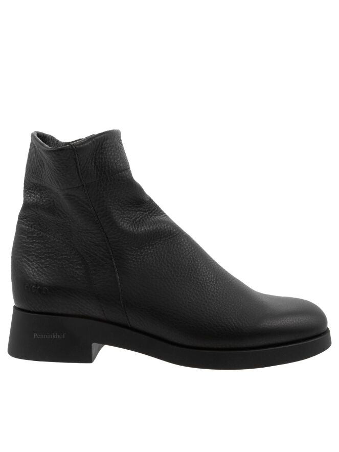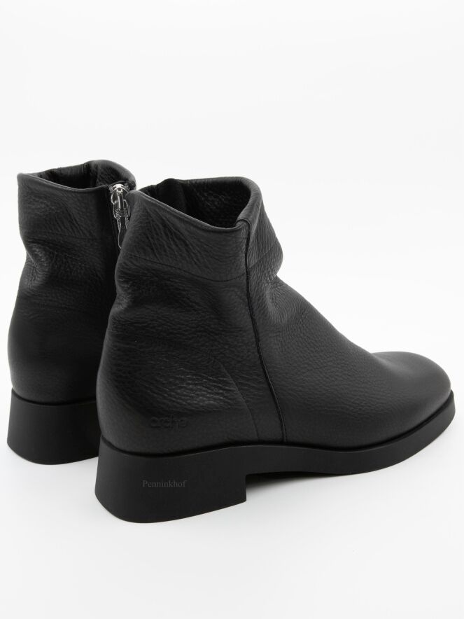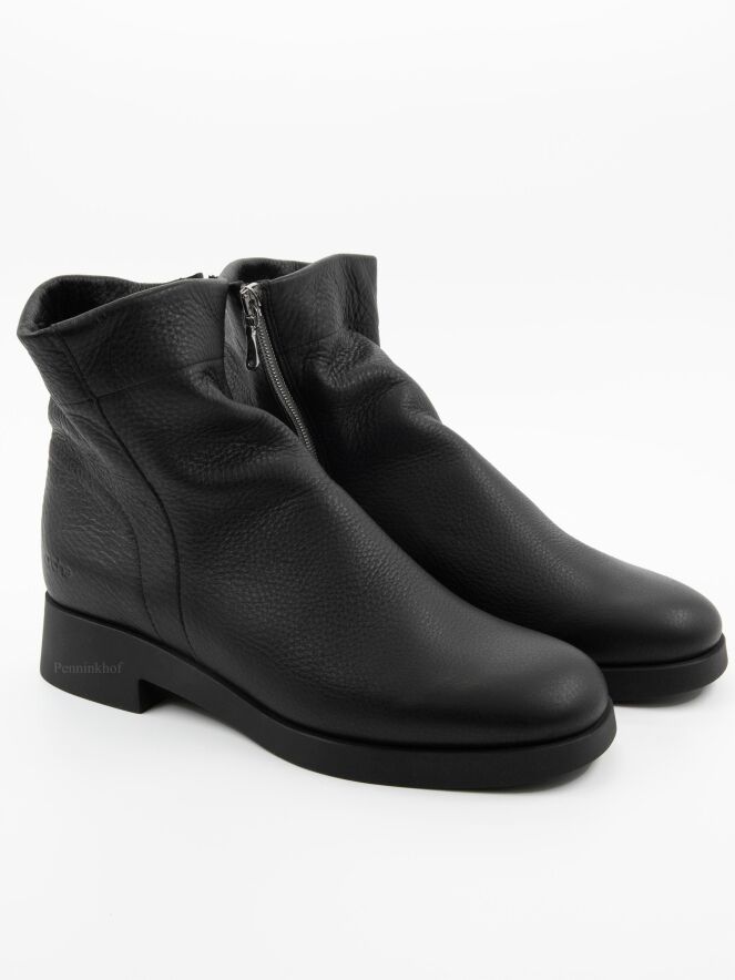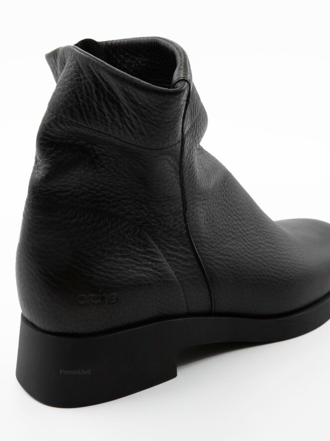Une bottine courte de Arche en couleur noire. La botte a un bout rond et une fermeture éclair argentée sur l'extérieur de la tige. L'intérieur n'est pas doublé.
