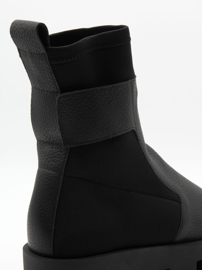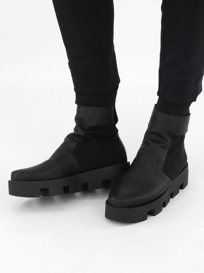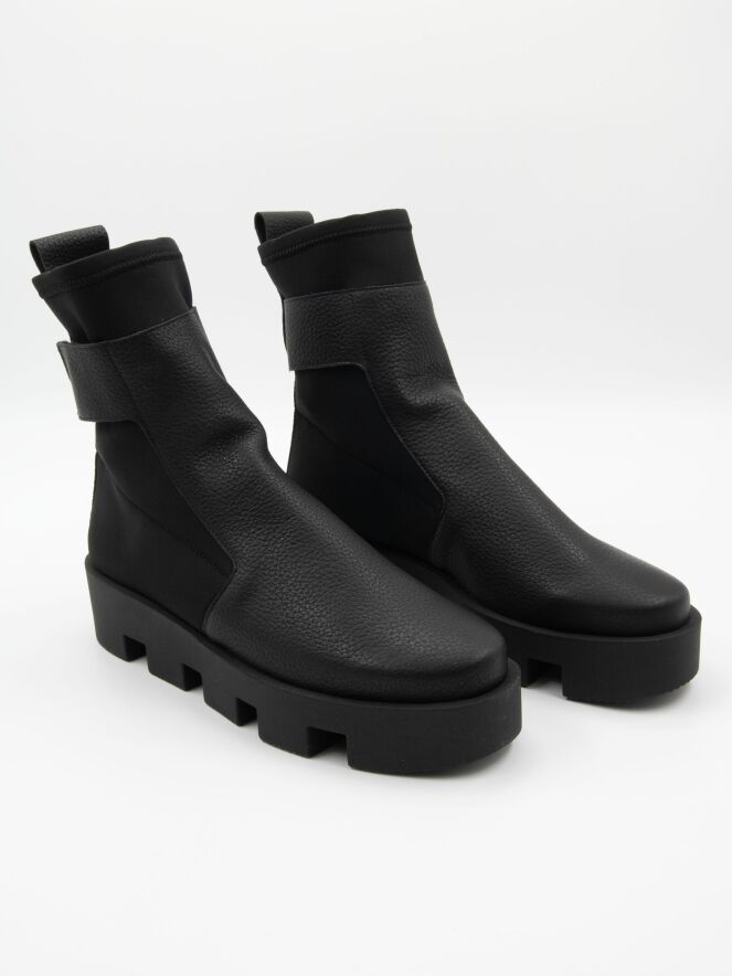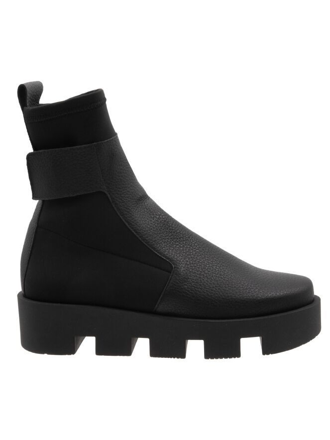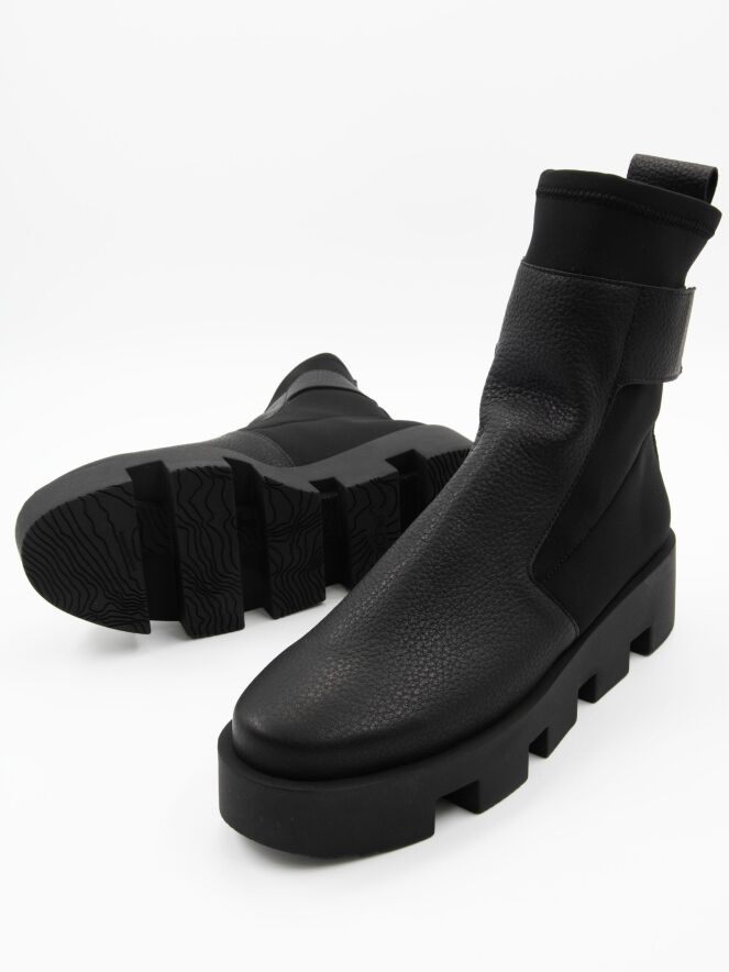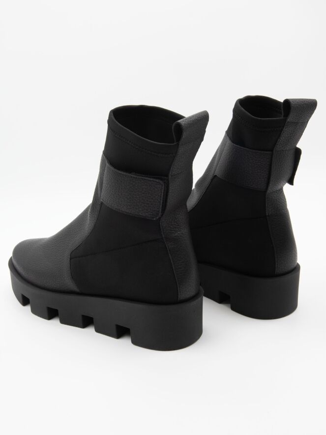 Une bottine d'Arche en noir. La tige comprend une chaussette élastique recouverte de cuir à l'avant et à l'arrière, et autour de la cheville, il y a une large bande ajustable avec du Velcro. La semelle est grossièrement crantée.
