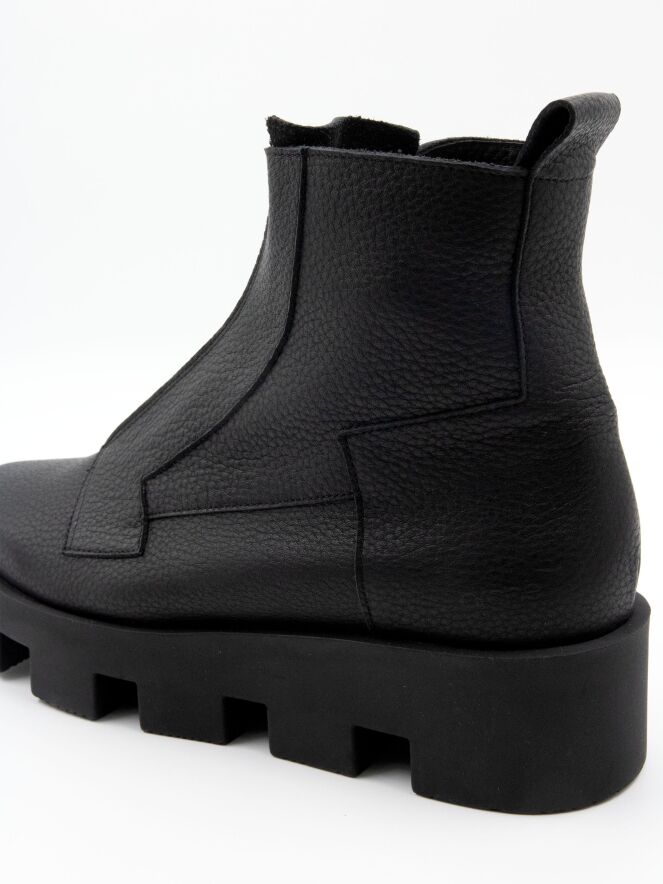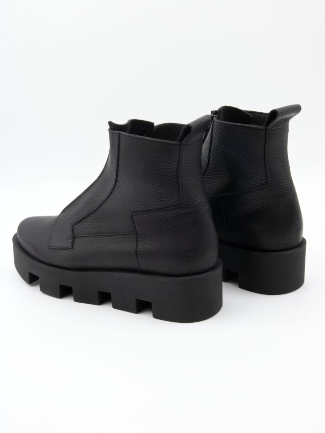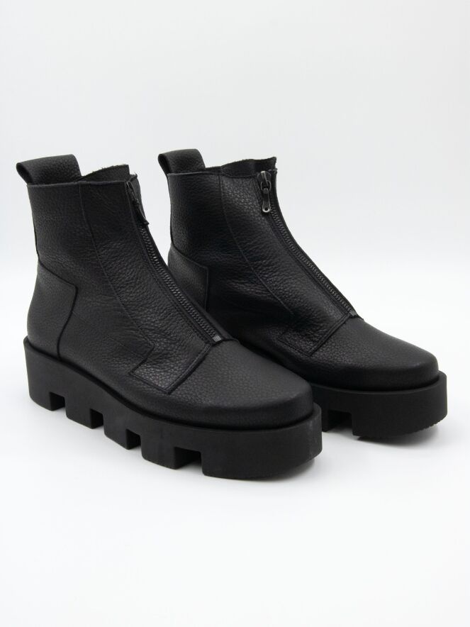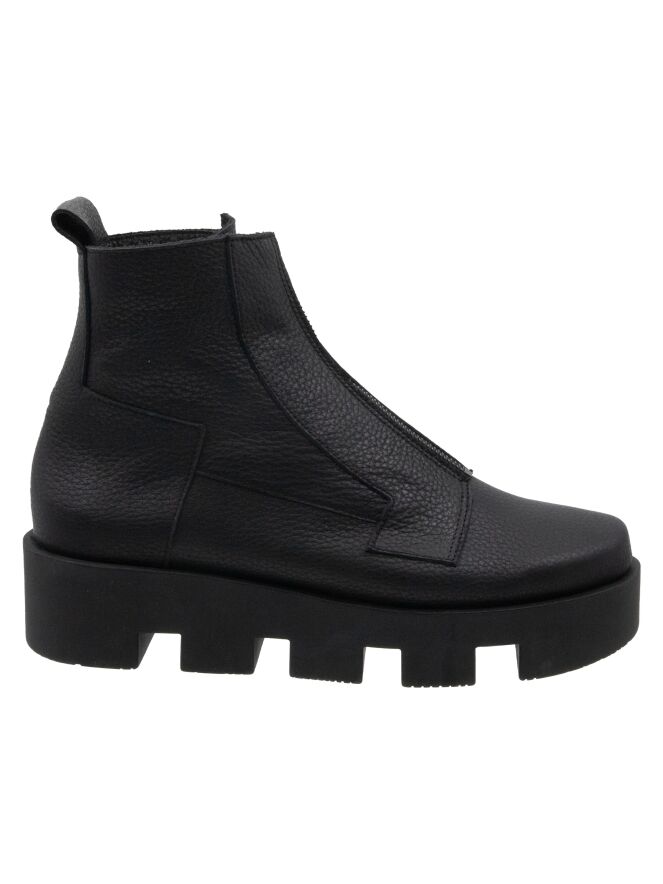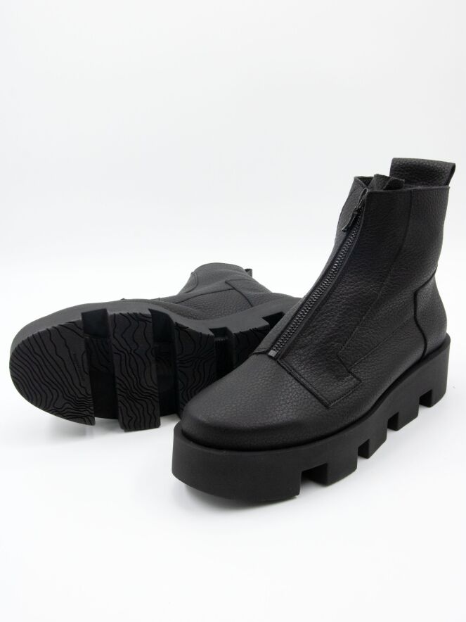 Une bottine de Arche de couleur noire. Une fermeture éclair noire traverse l'avant-pied. Des coutures décoratives sont présentes à plusieurs endroits. La semelle en latex est crantée en blocs. L'intérieur est non doublé.