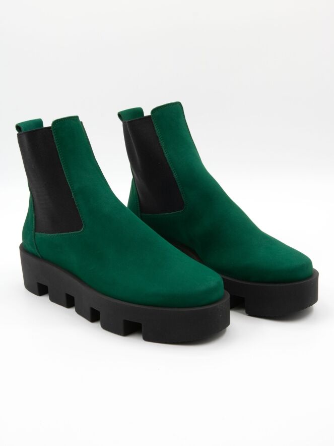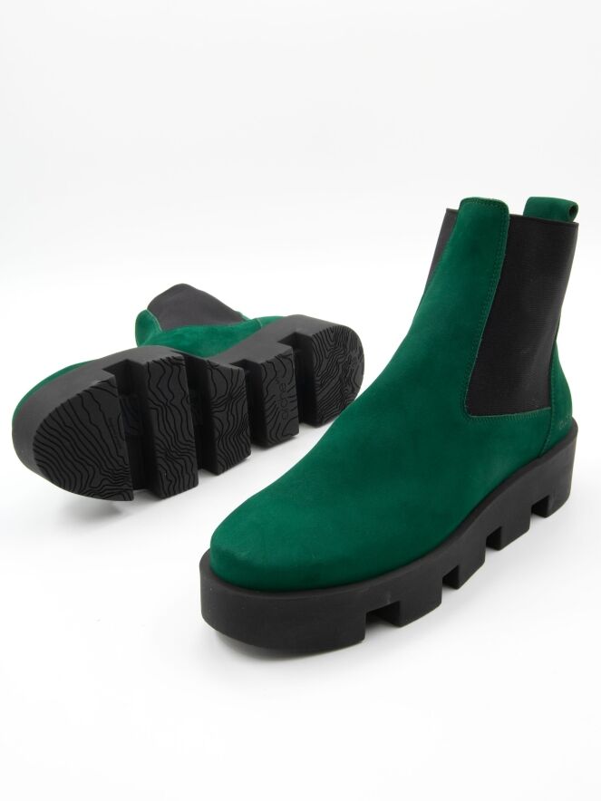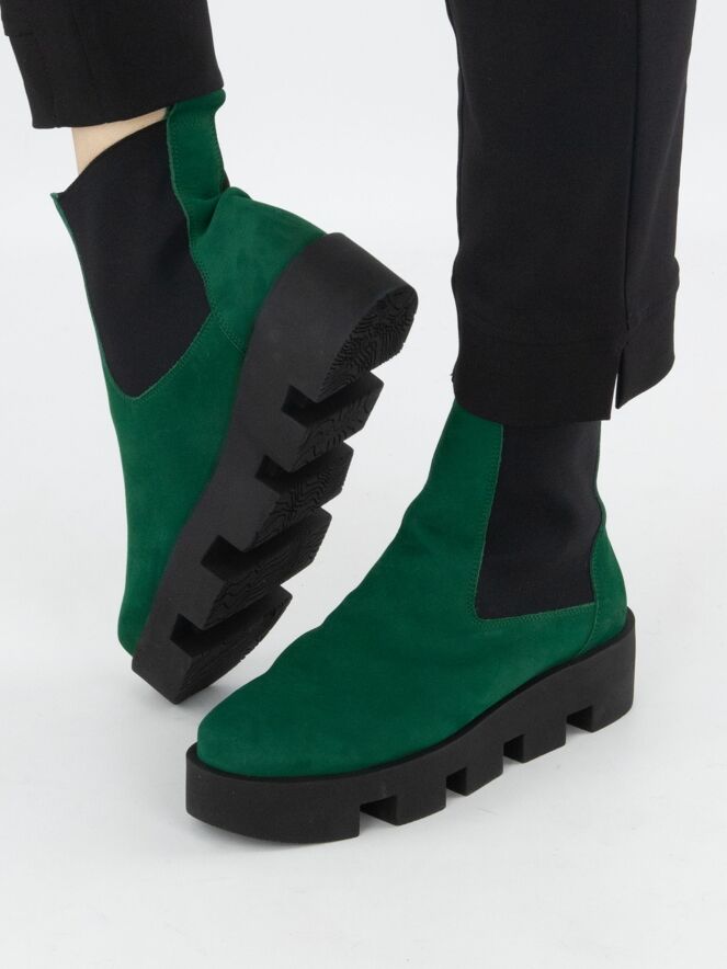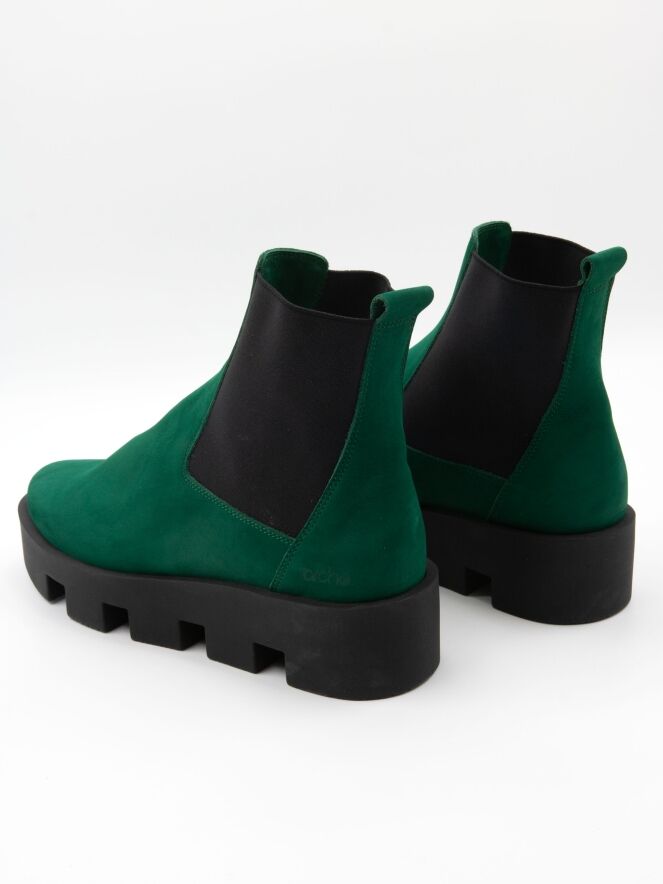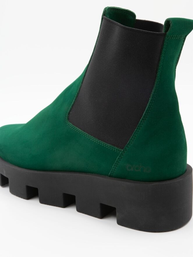 Une bottine d'Arche en couleur verte. Les côtés de la tige sont dotés d'élastique noir finement côtelé. La semelle est grossièrement dentelée.