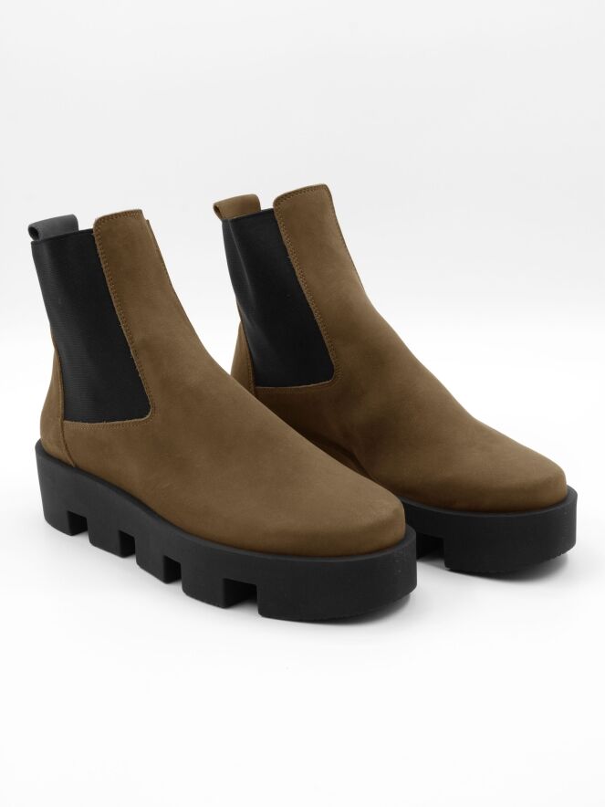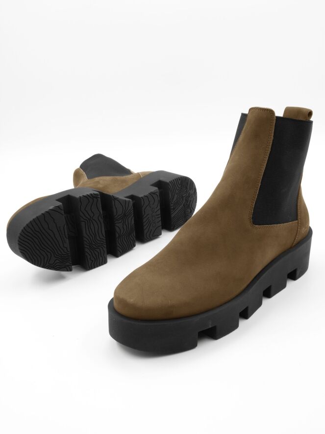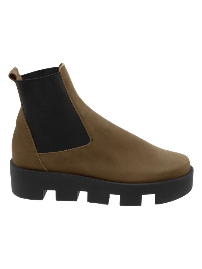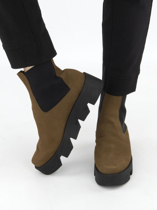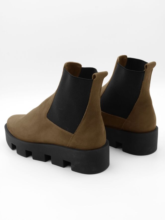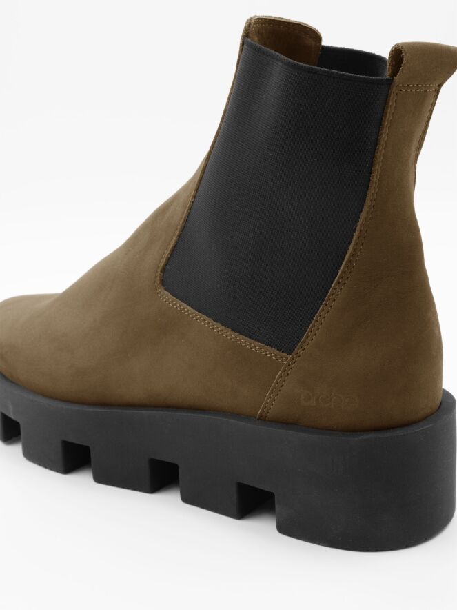 Une bottine d'Arche en couleur camel. Les côtés de la tige comportent un élastique noir finement côtelé. La semelle est grossièrement dentelée.
