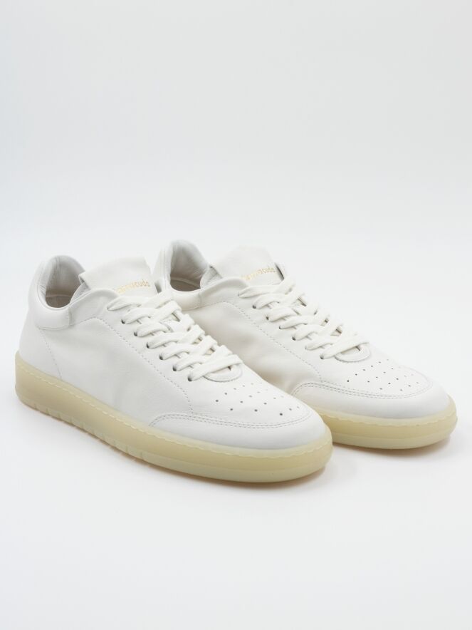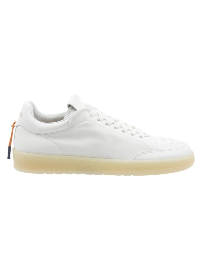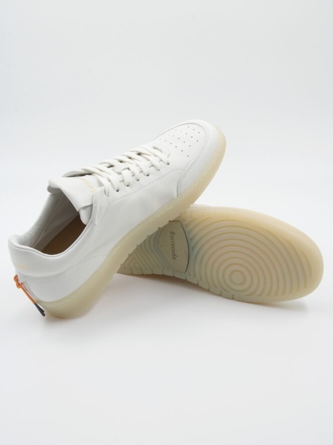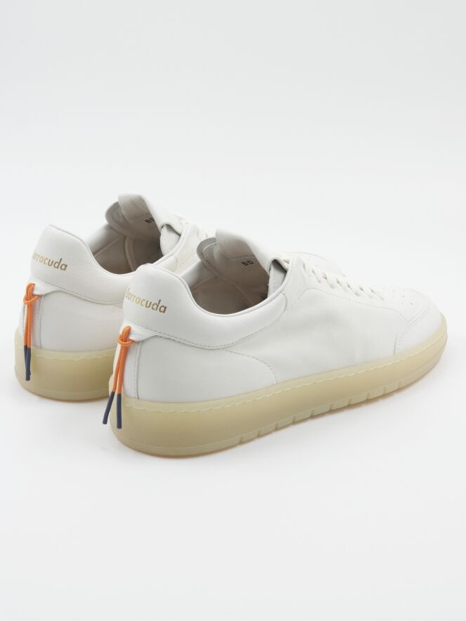 Un basket de Barracuda dans le coloris blanc La semelle du basket est de couleur neutre. Sur l'avant-pied, le cuir est perforé. Le basket est doublé de cuir à l'intérieur.