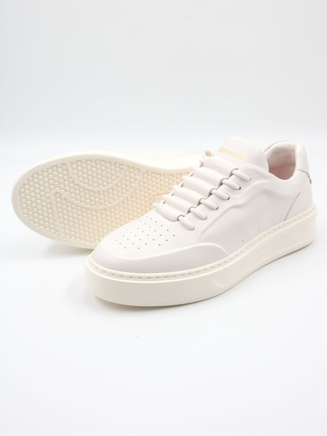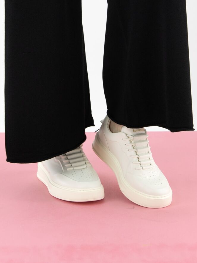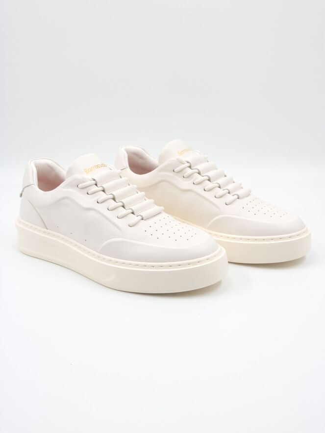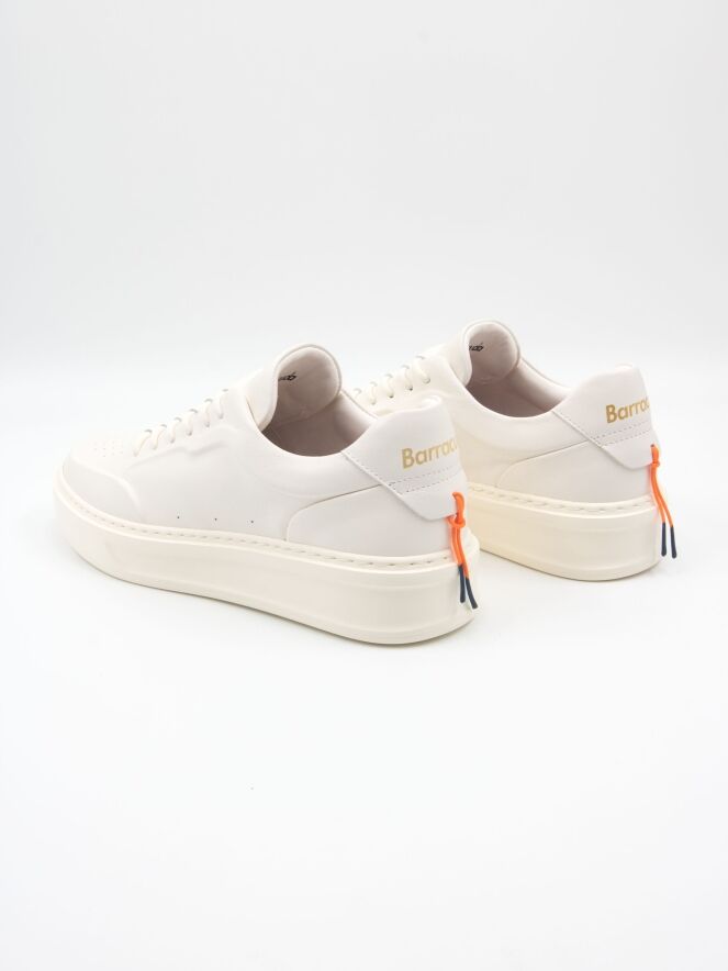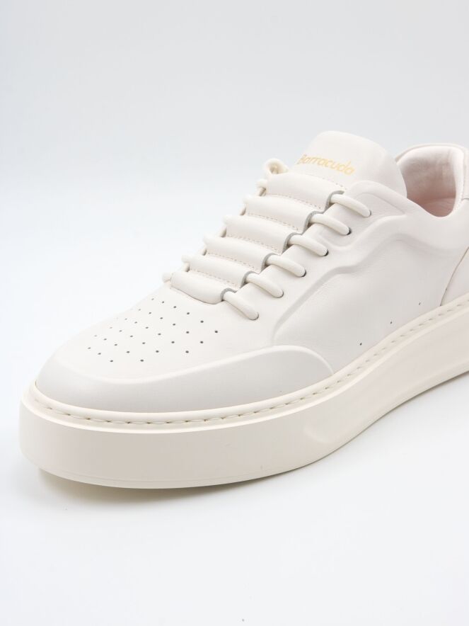 Une sneaker de luxe de Barracuda en blanc. L’avant du pied et les côtés sont perforés. Une couture blanche longe le bord de la semelle blanche. L’intérieur est doublé de cuir.