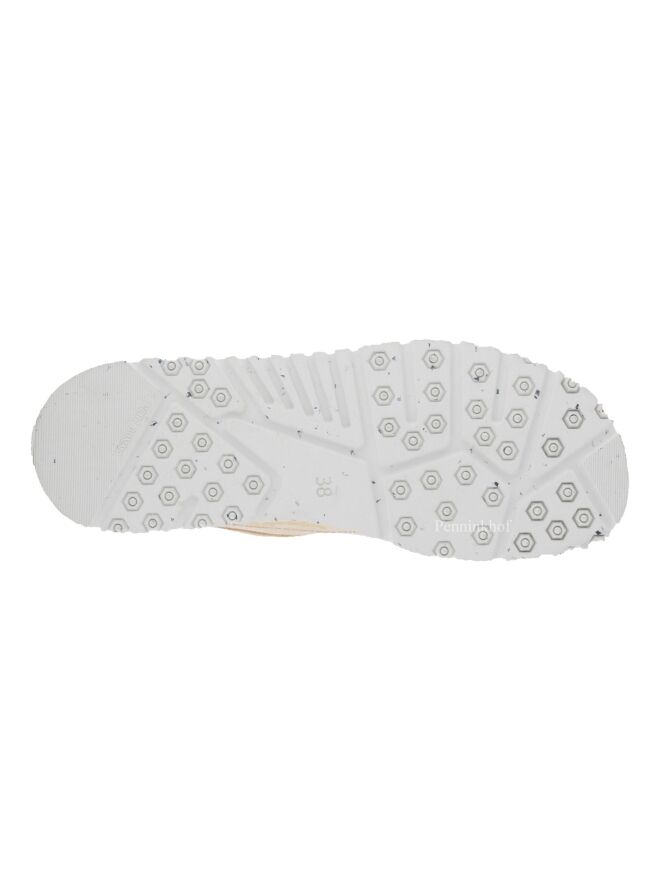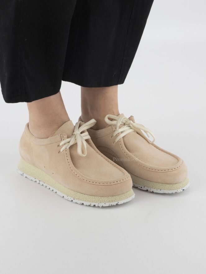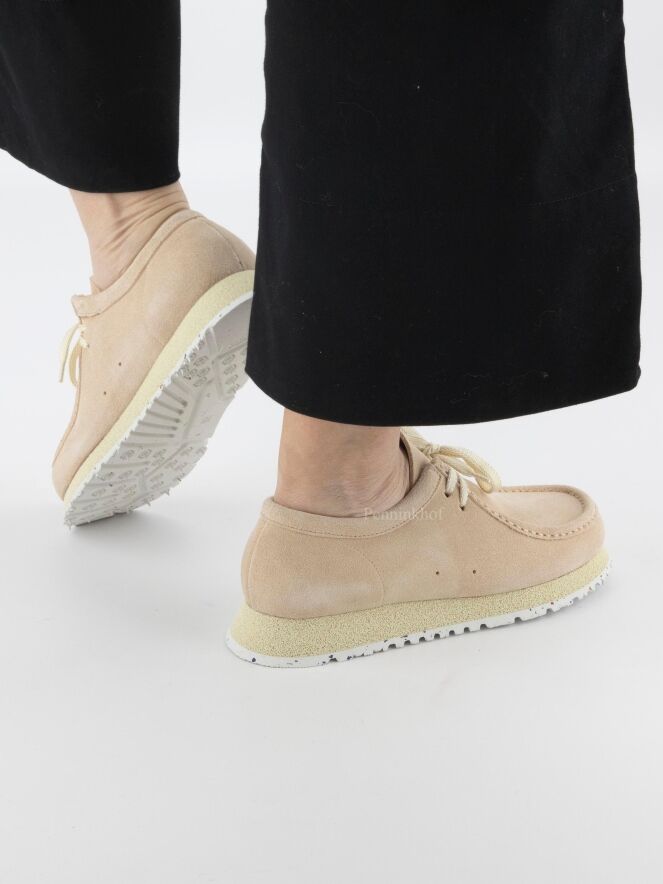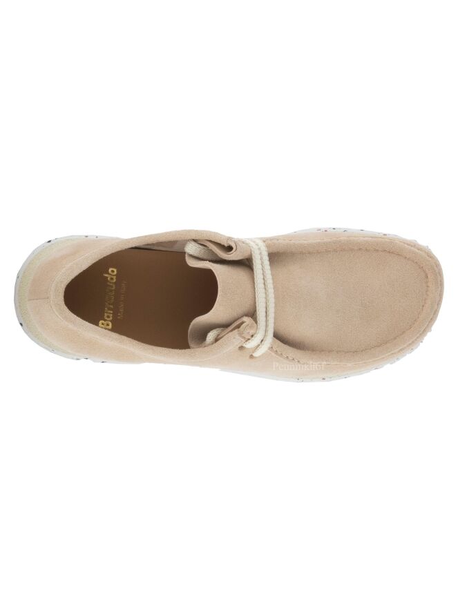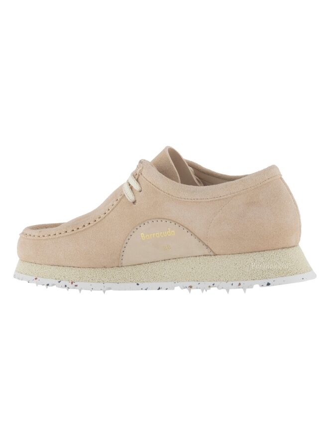 Chaussure à lacets de la marque Barracuda, dans un coloris rose tendre. La marque est inscrite en lettres dorées sur un empiècement en cuir de forme demi-lune à l'intérieur de la chaussure. La semelle est construite en deux couches, l'une beige et l'autre blanc crème à mouchetis noir. L'intérieur est doublé de cuir.