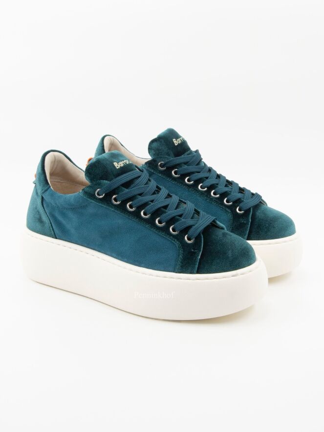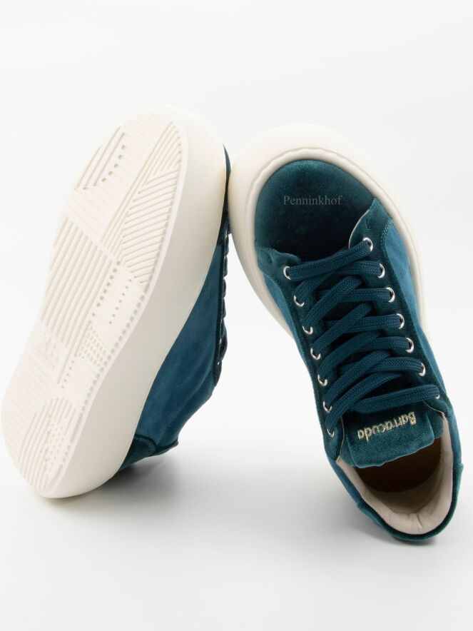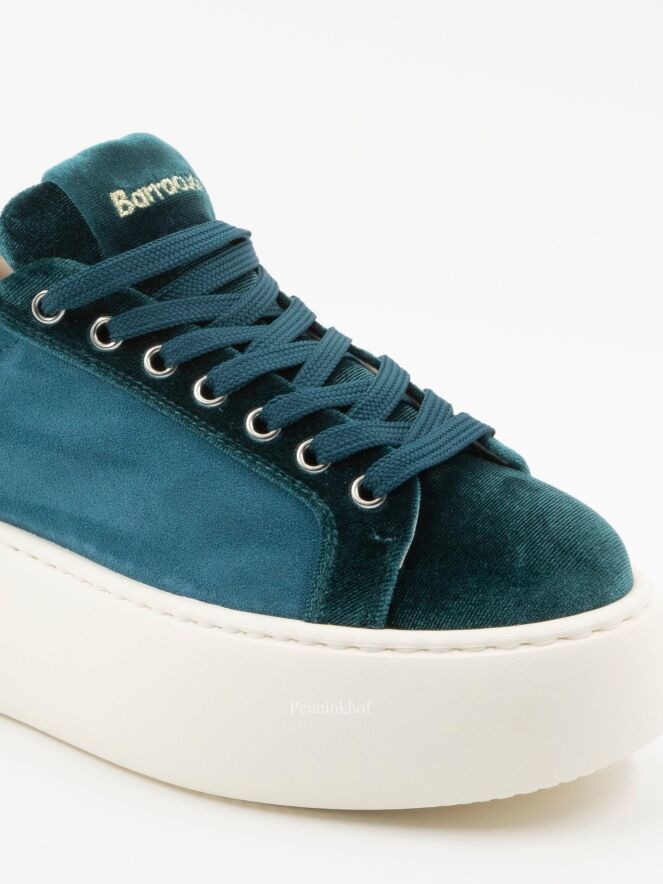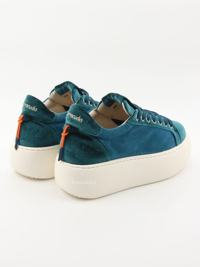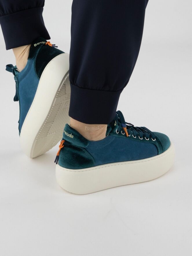 Basket de luxe Barracuda de couleur bleu pétrole. L'embout, le talon et le lacet sont en velours. La semelle compensée est de couleur blanc crème. Le basket est doublé à l'intérieur.
