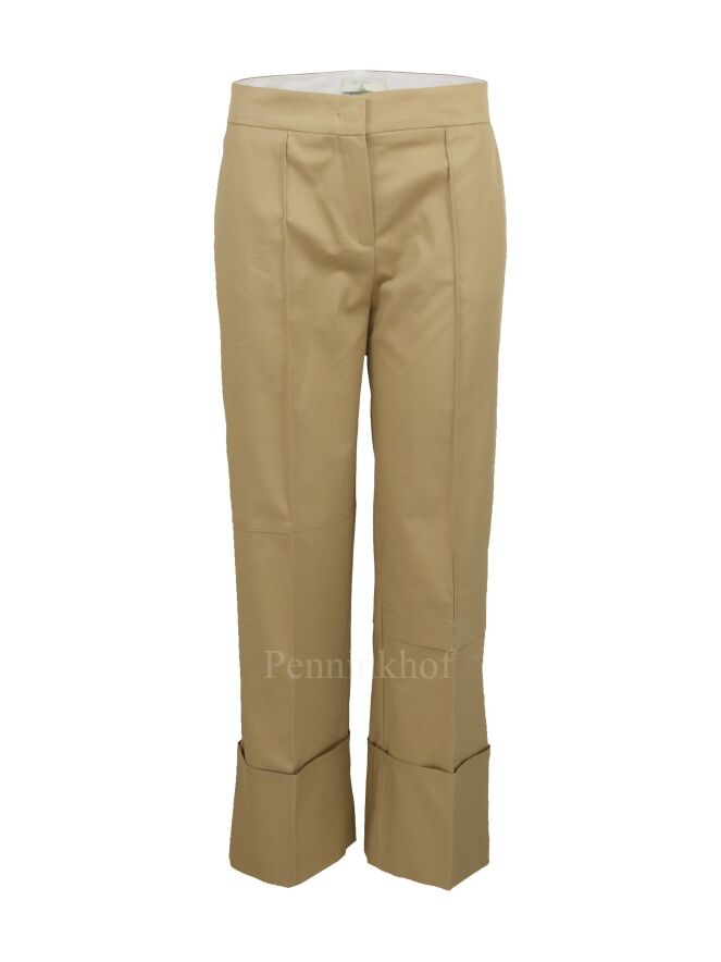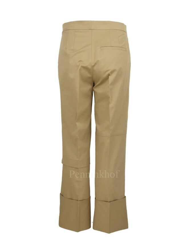 Pantalon blanc de la marque Beatrice B., de couleur chamois. Sous le genou gauche, un pli cousu imite un revers. Le bas des jambes présente de très larges revers de 15 cm. Le pantalon est équipé de poches fendues. Lavage à la main.