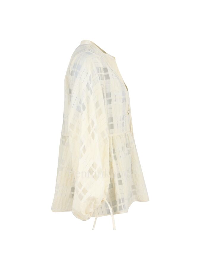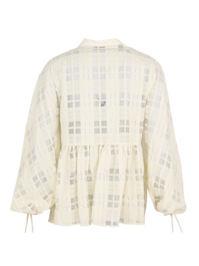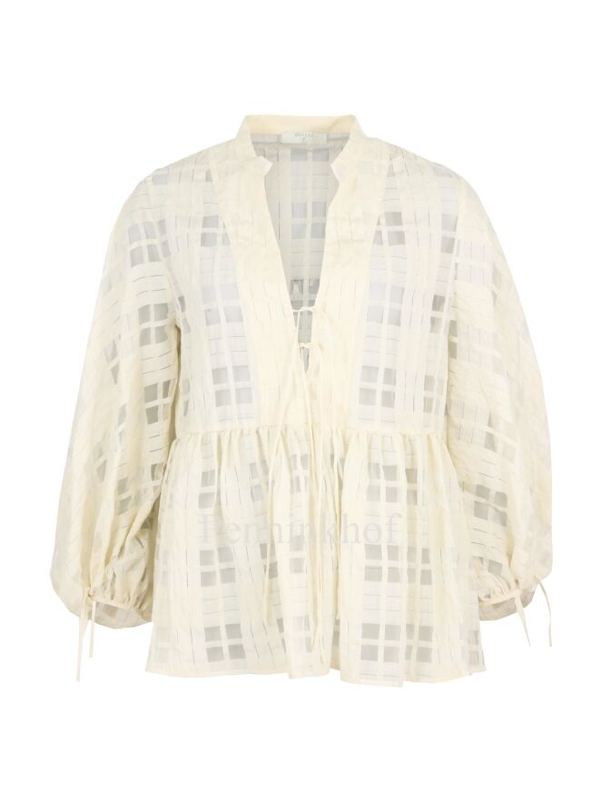 Chemise transparente à manches bouffantes de la marque Beatrice B., de couleur blanc crème. Le tissu est structuré en bandes horizontales et verticales formants des carreaux transparents. Une fronce à la taille provoque des plis qui apportent du volume. L'échancrure profonde du du col est reliée par deux fins cordons crème descendant presque jusqu'au bas de la chemise Ces cordons sont également présents aux extrémités des manches. Ce modèle n'est pas doublé. Lavage à la main.