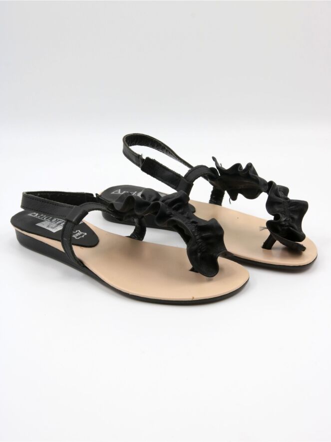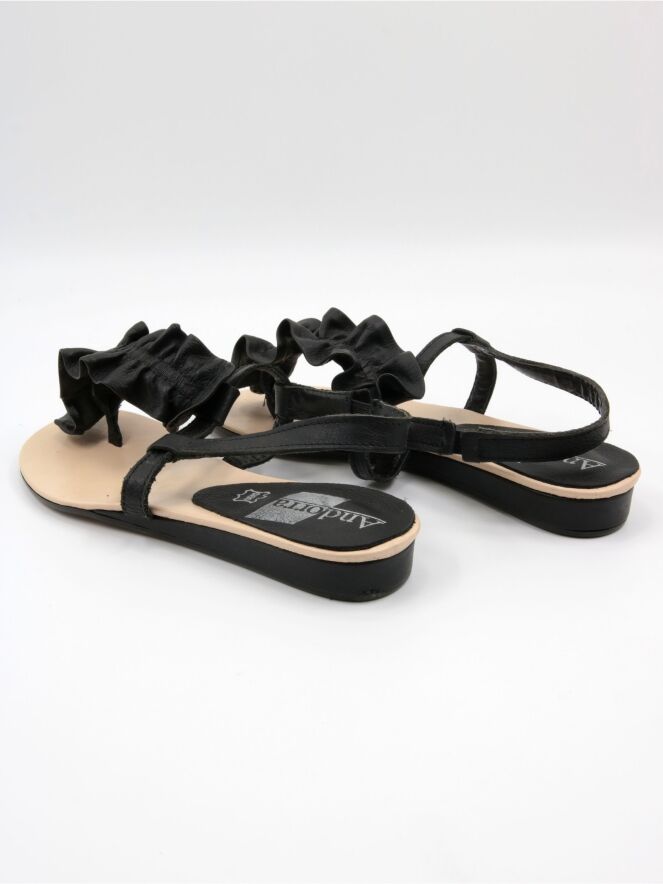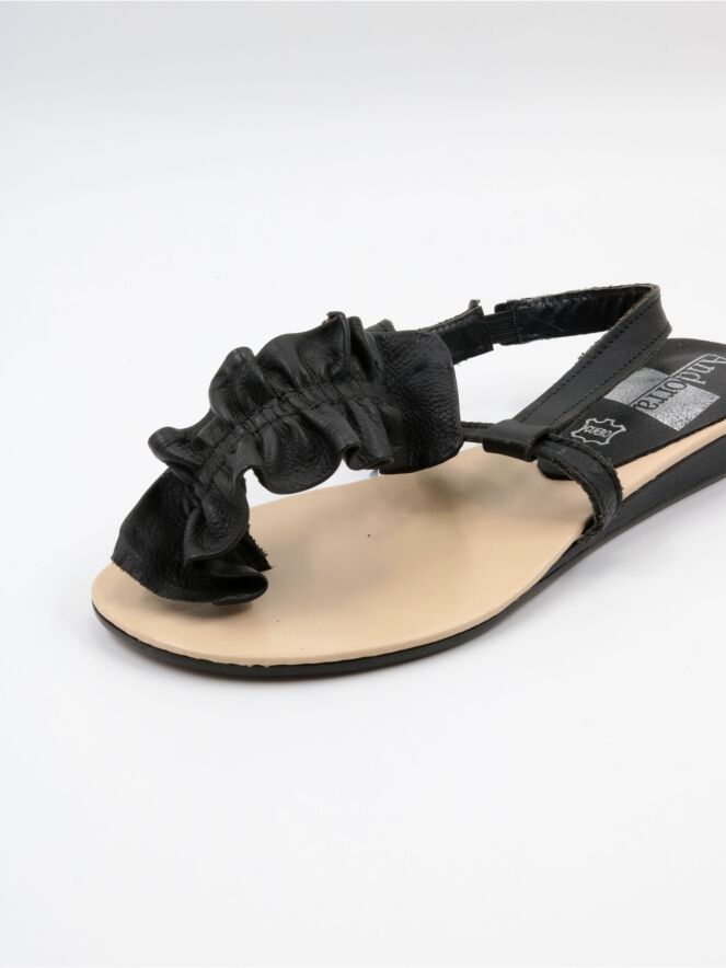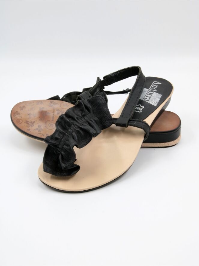 Une sandale à enfiler de Calmoda en noir. Une large bride froncée et piquée traverse l’avant du pied. La bride au talon comporte un élastique sur le côté extérieur.