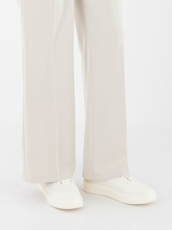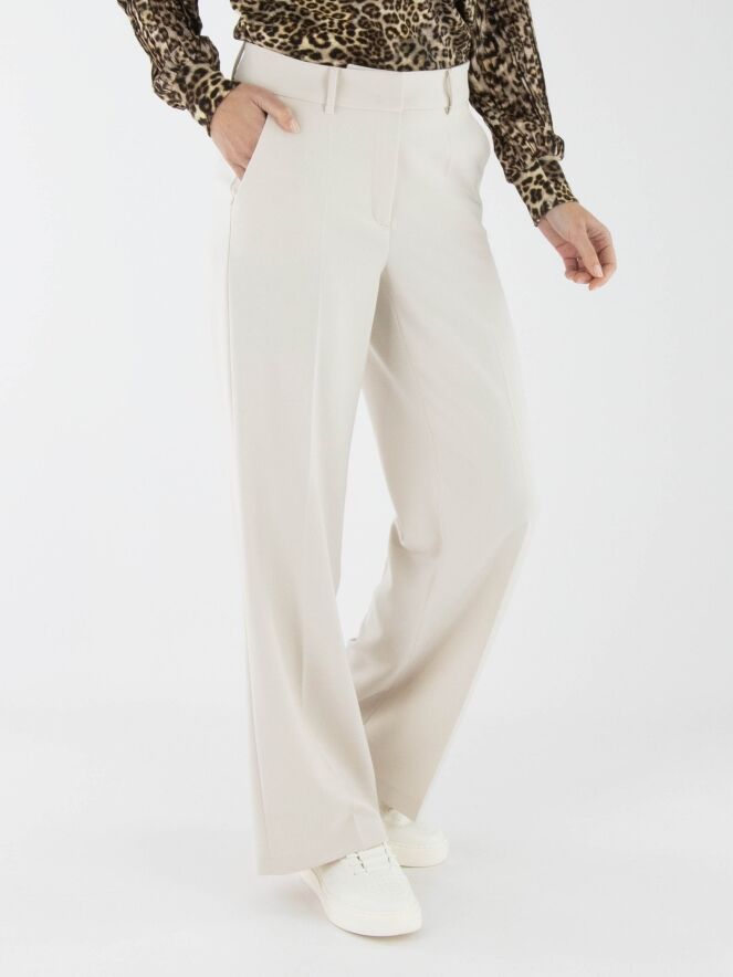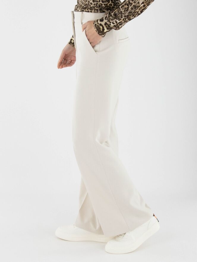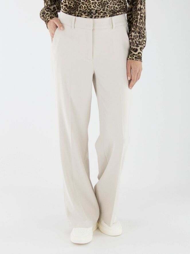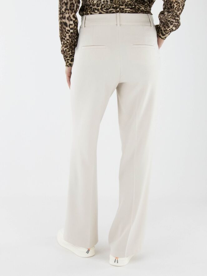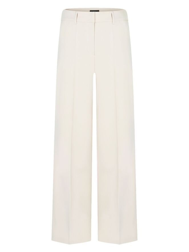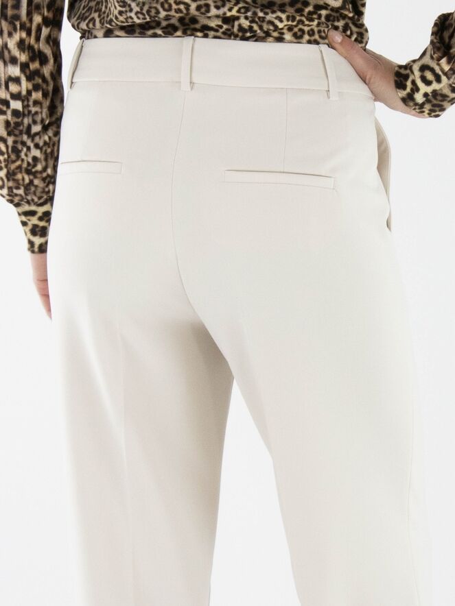 Un pantalon droit luxueux de Cambio de couleur blanc crème. Une pliure marquée traverse le centre des jambes. Le pantalon dispose de poches latérales et doit être lavé à la main.