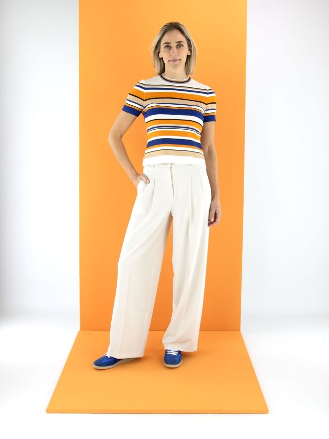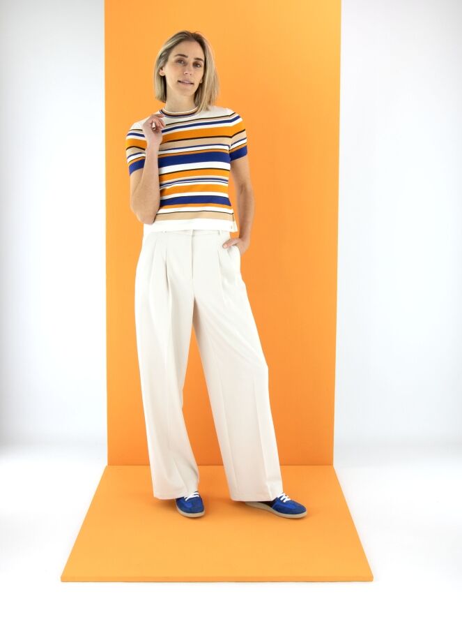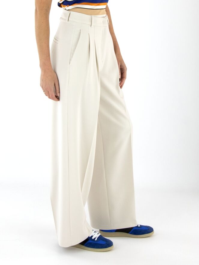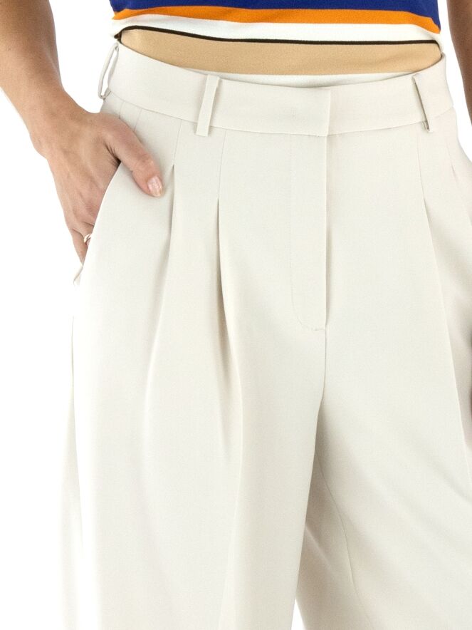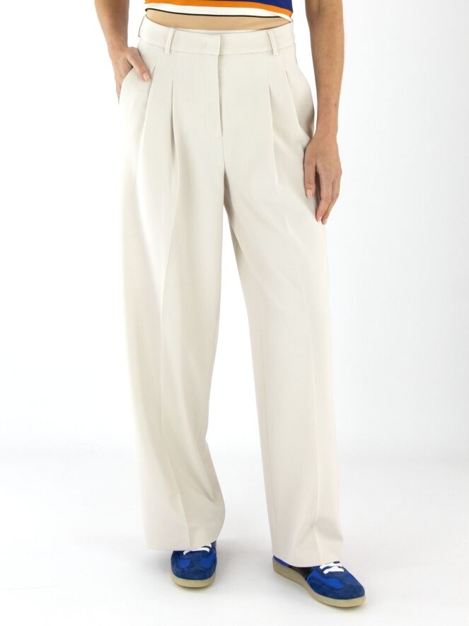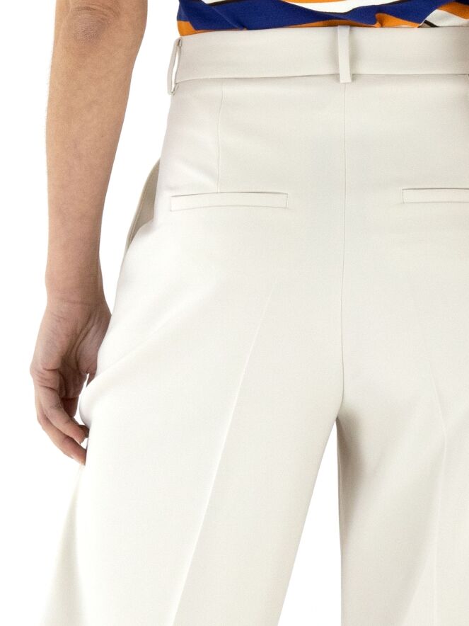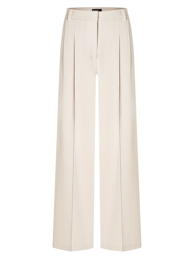 Un pantalon ample de Cambio de couleur beige. La taille est dotée de plusieurs plis. Une pliure marquée traverse le centre des jambes. Le pantalon dispose de poches latérales et doit être lavé à la main.