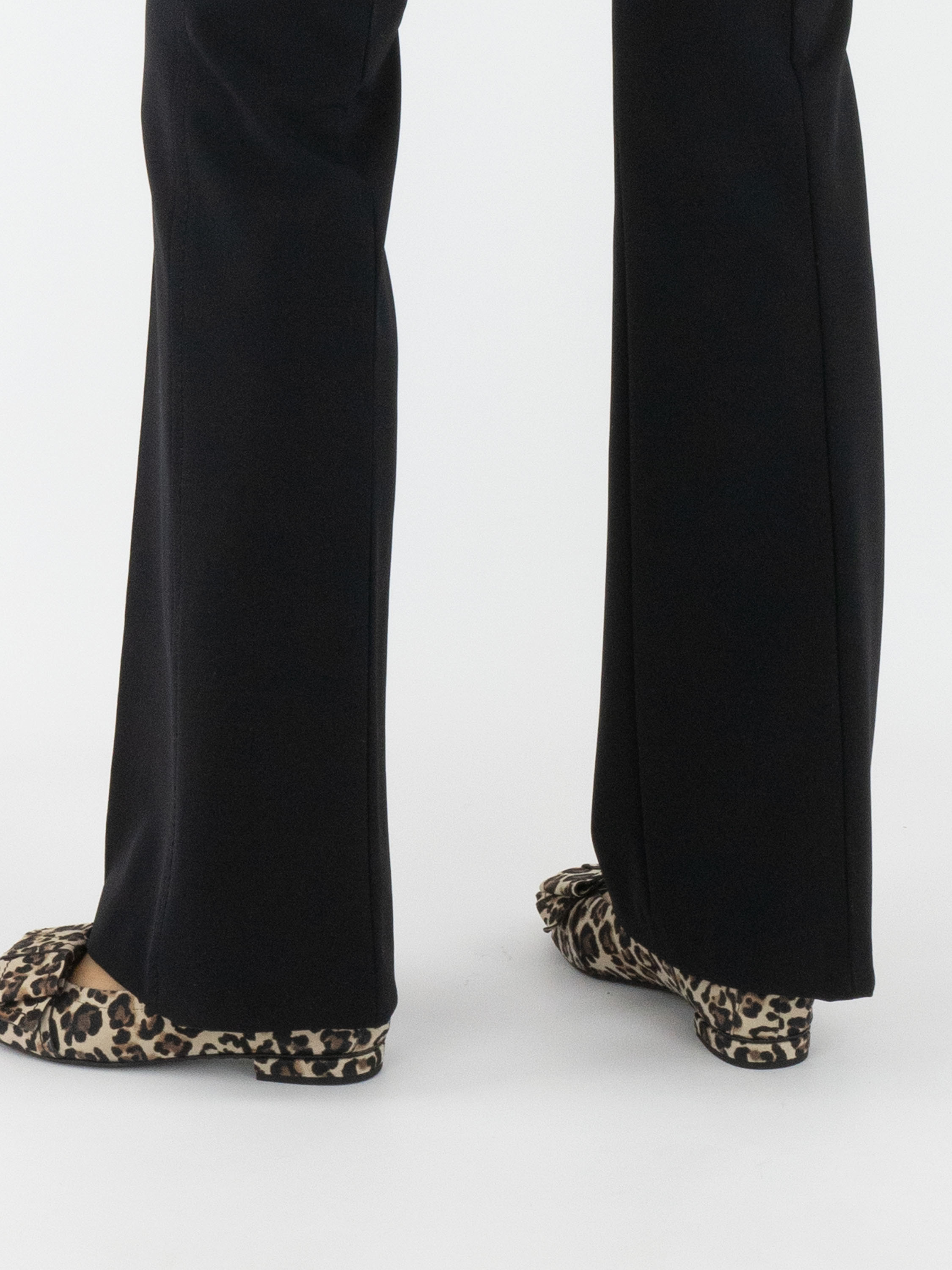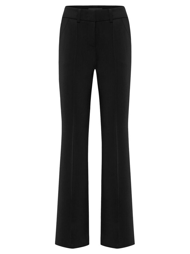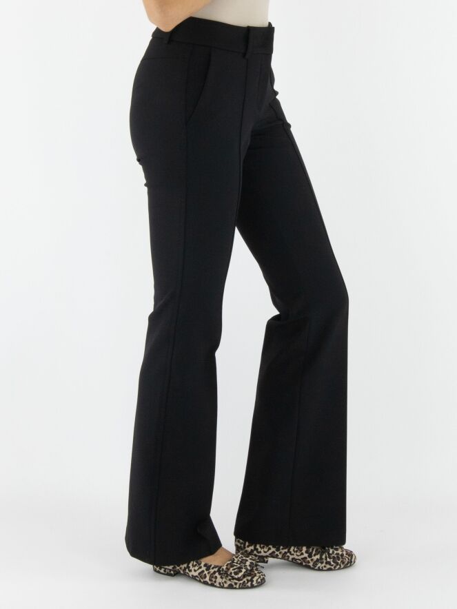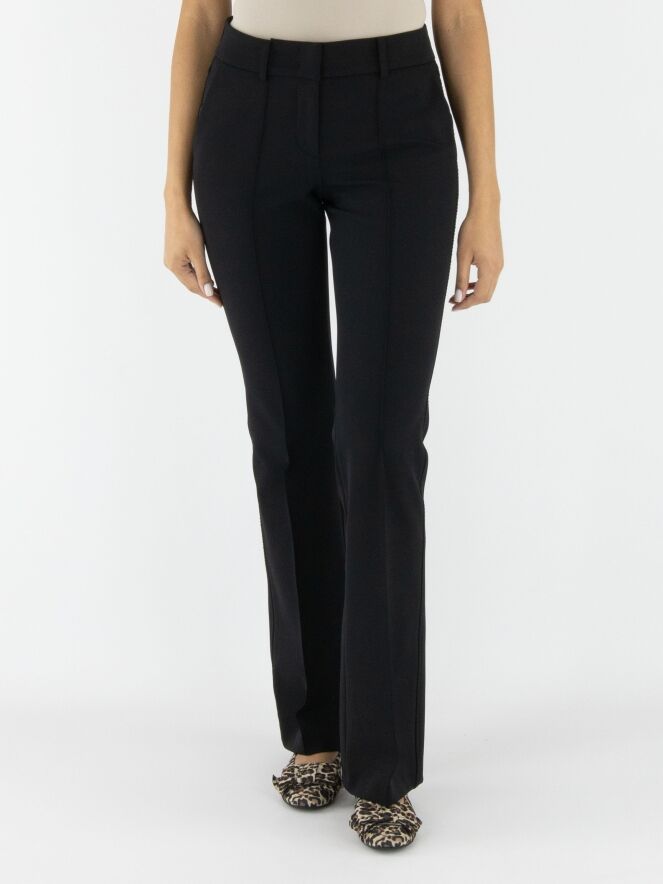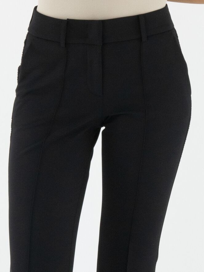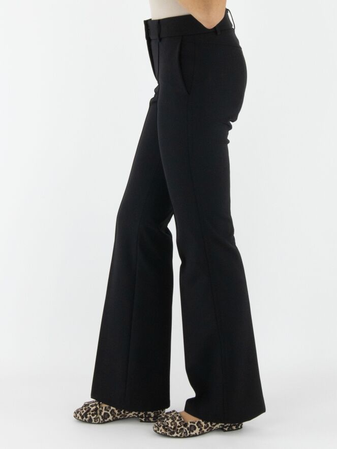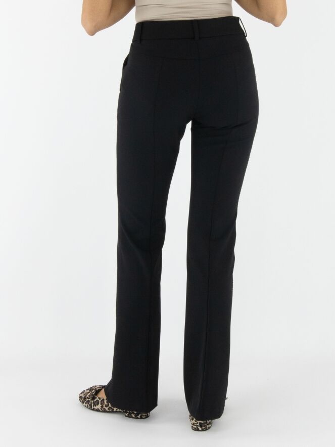 Un pantalon évasé de Cambio de couleur noire. Une couture traverse le centre des jambes. Sur les côtés, un fil décoratif noir est visible. Le pantalon a des poches fendues et peut être lavé à 30 degrés.