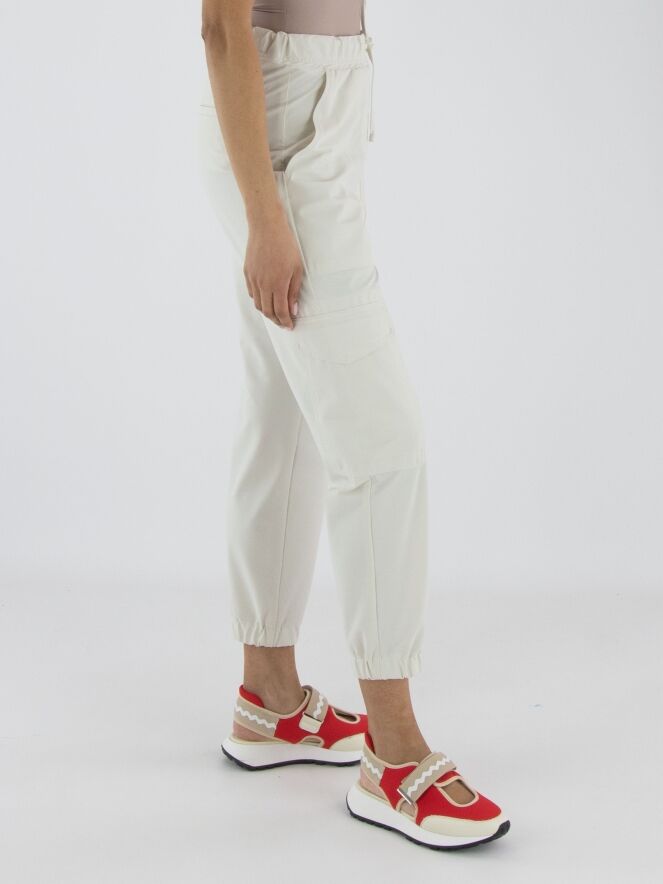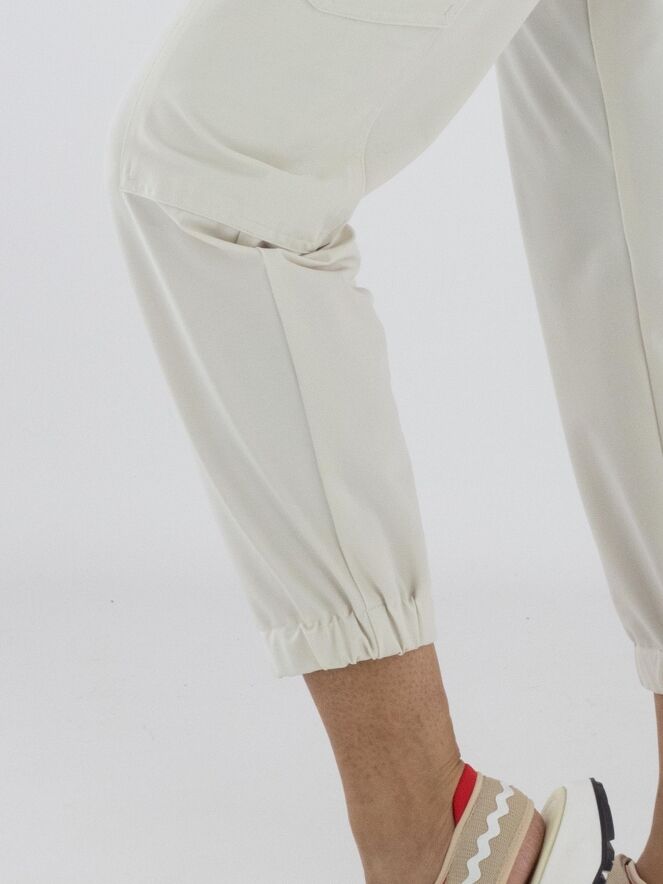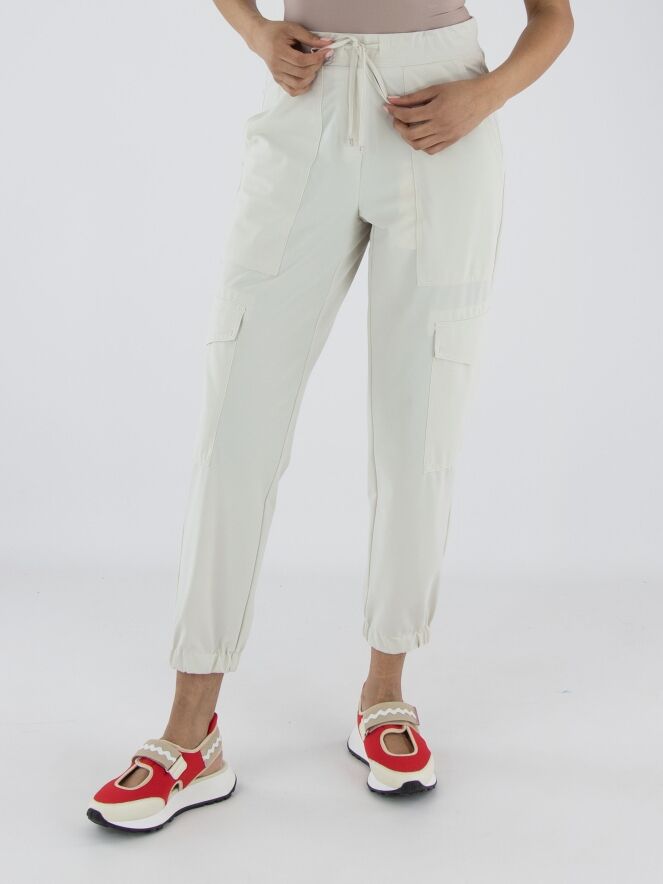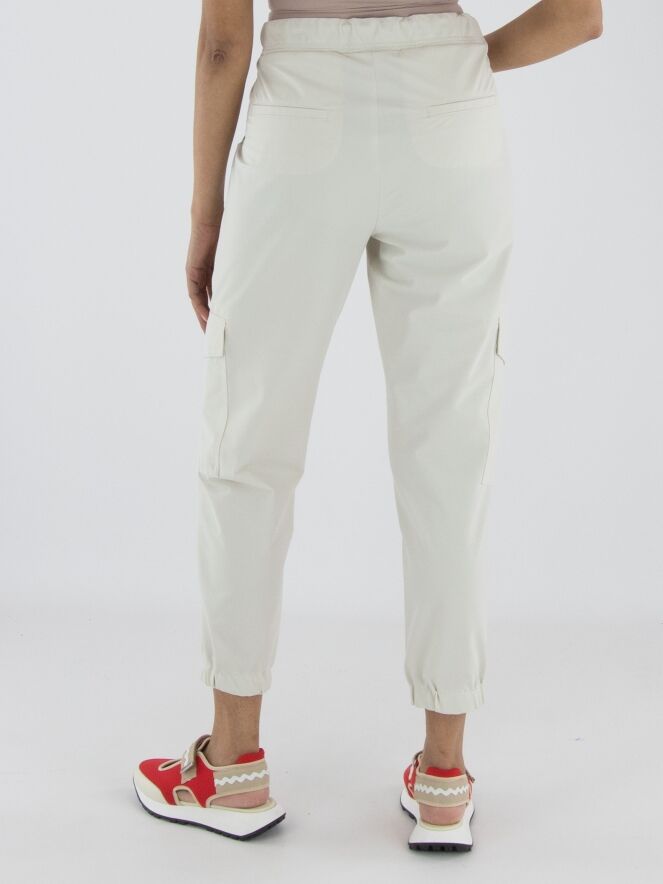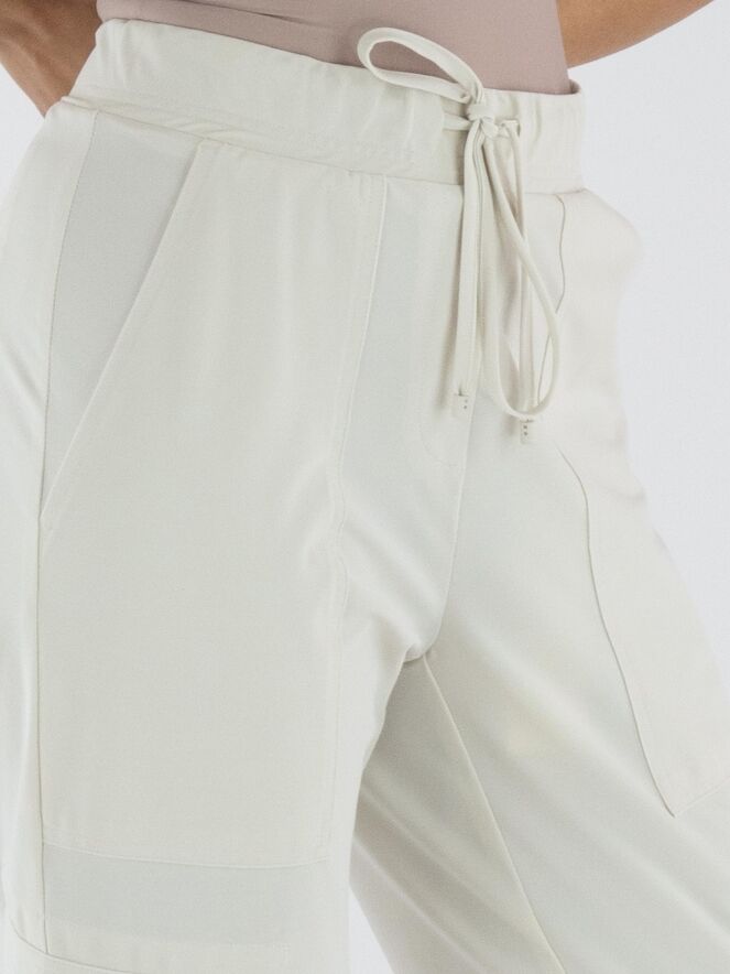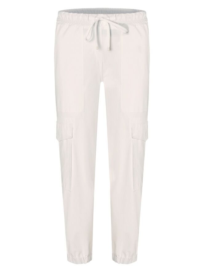 Un pantalon cargo jogging de Cambio en blanc cassé. La taille est dotée d’une bande élastique avec un cordon intégré dans une finition tunnel. Le pantalon possède des poches latérales ainsi que des poches supplémentaires au niveau des genoux. Les bas de jambes sont finis avec un poignet élastique plissé. Ce pantalon peut être lavé à 30 degrés.