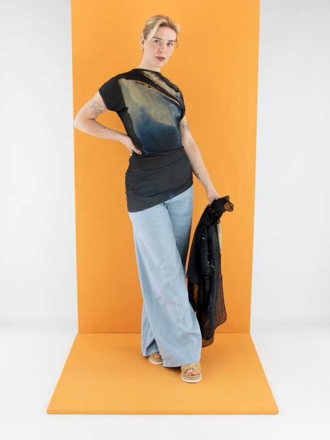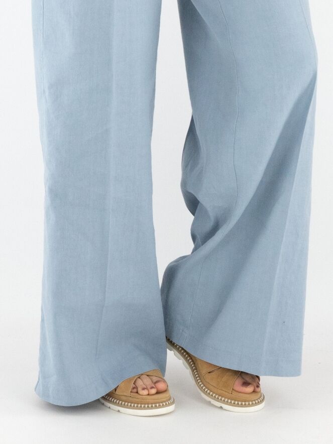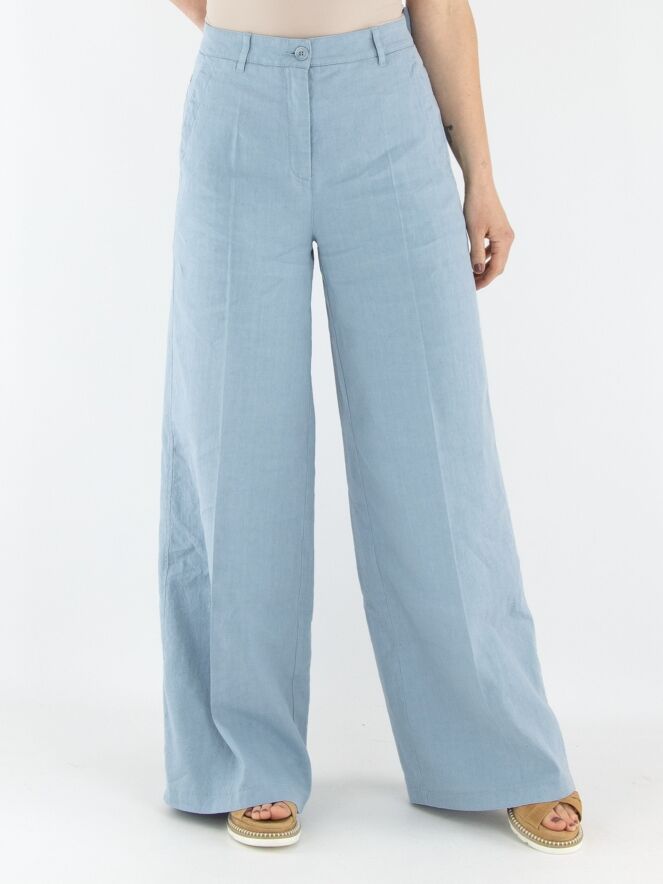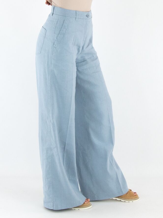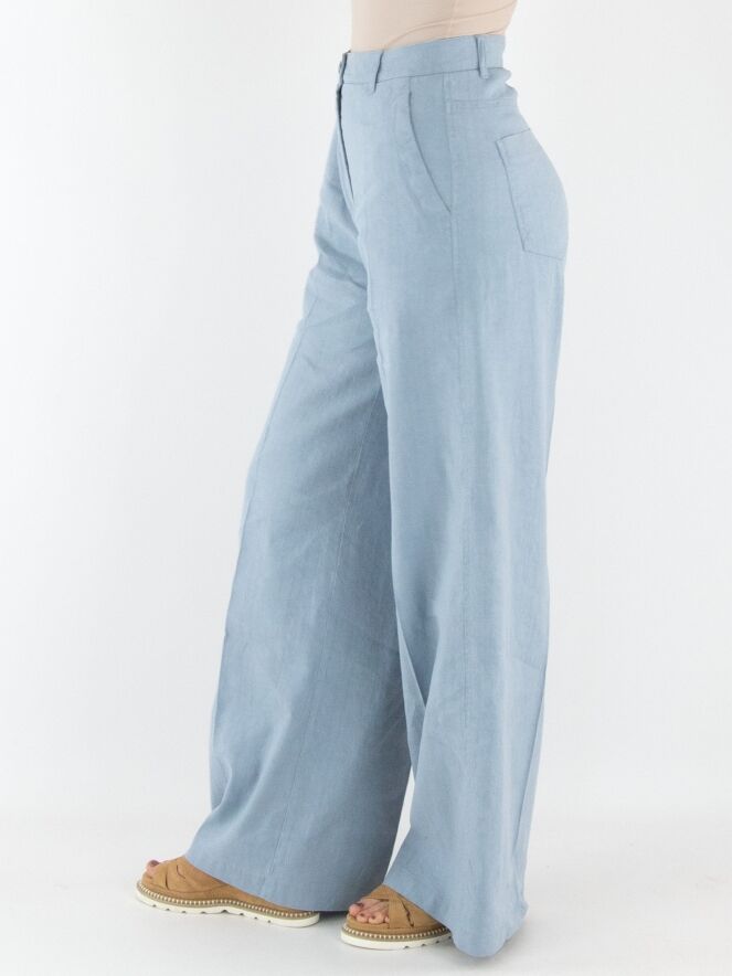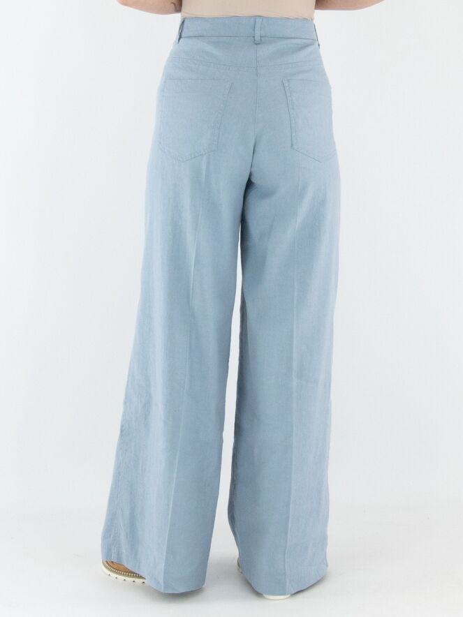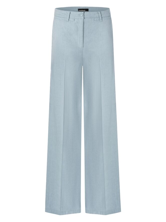 Un pantalon de Cambio en bleu pastel. Ce pantalon possède des poches latérales et un pli marqué au centre des jambes, à l’avant comme à l’arrière. Ce pantalon doit être lavé à la main.