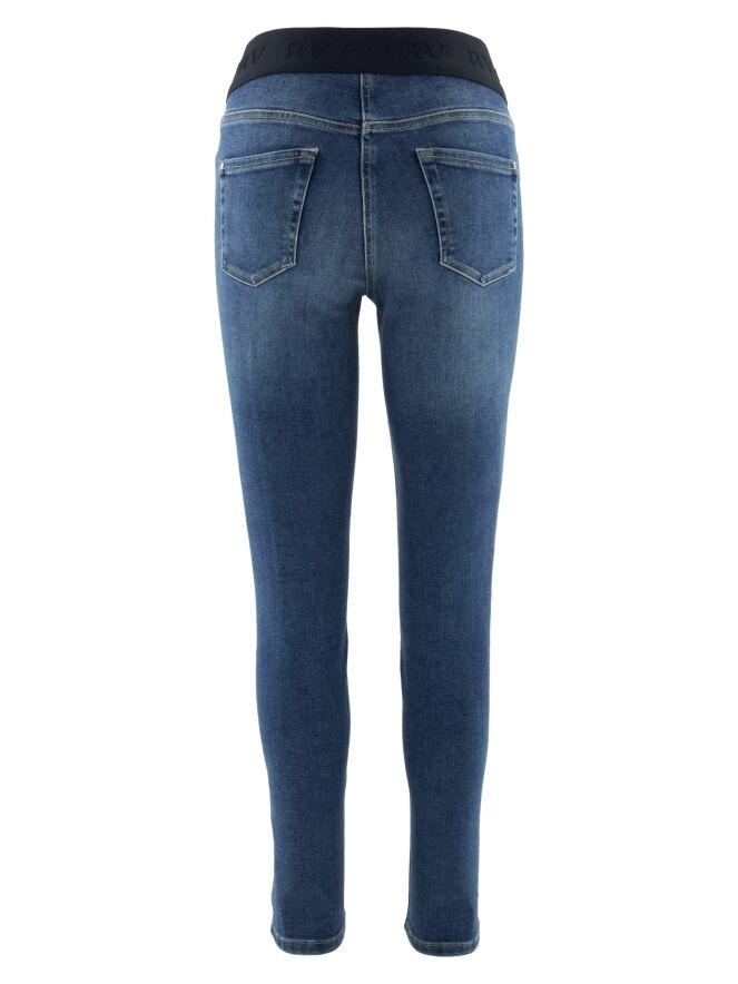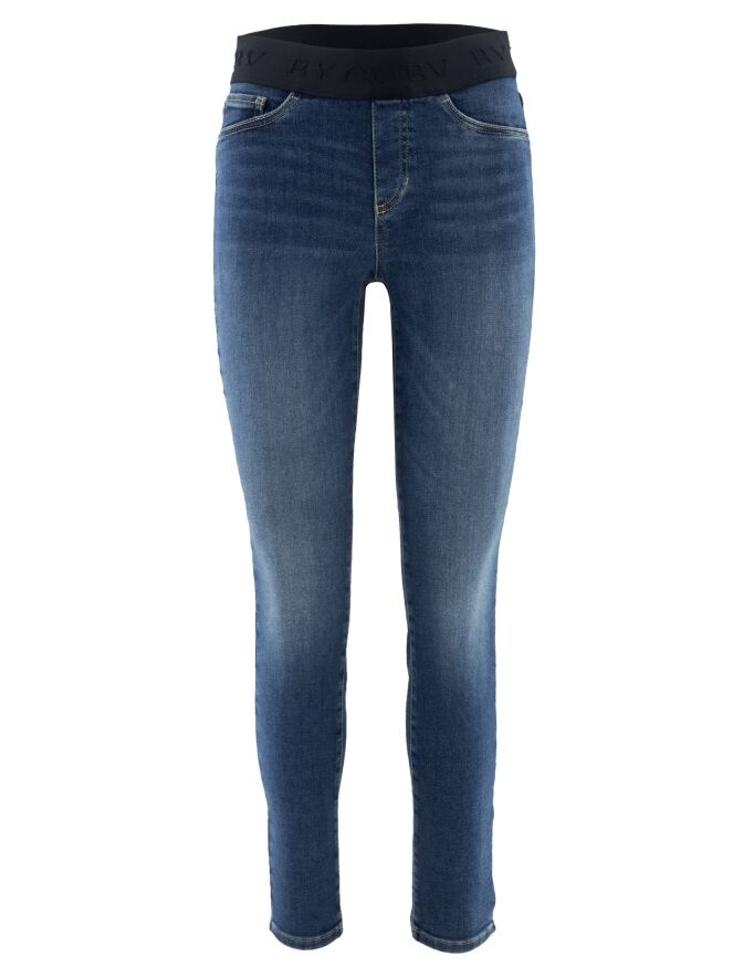 Un jean de Cambio dans une couleur denim basique. Il est doté d'une bande élastique noire à la taille. Le jean suit un style 5 poches et peut être lavé à 30 degrés.
