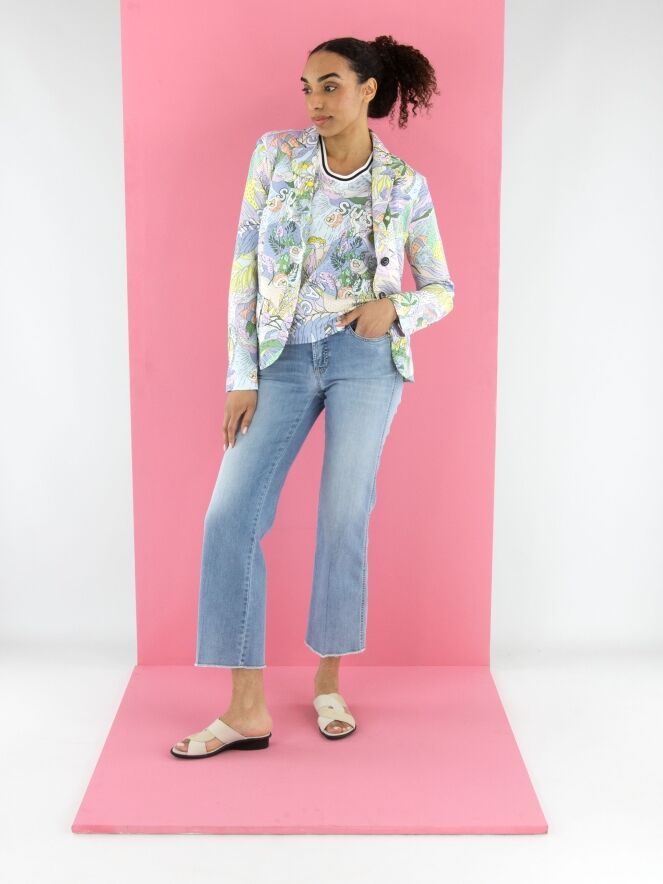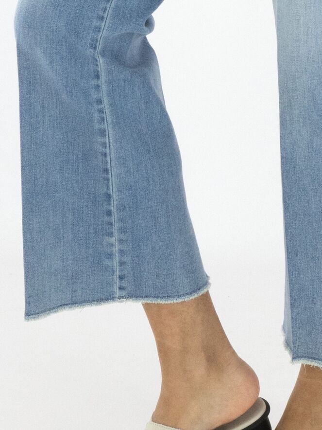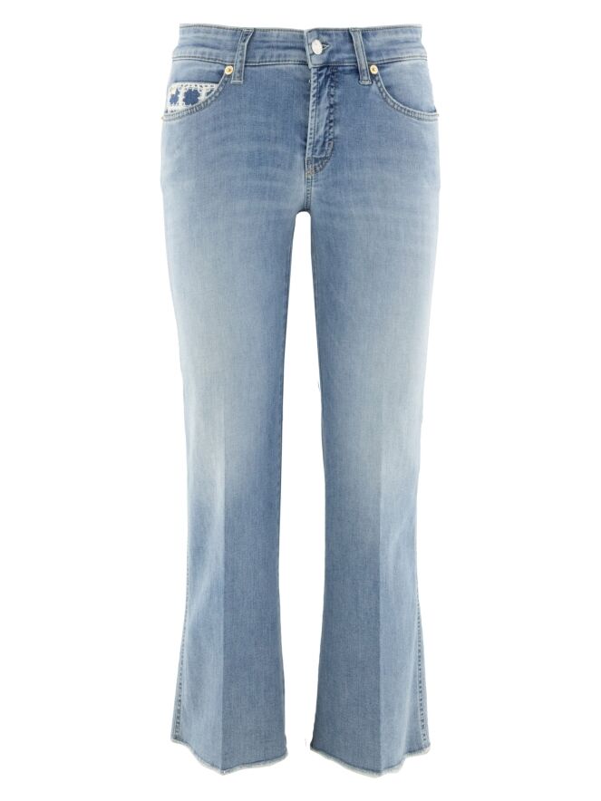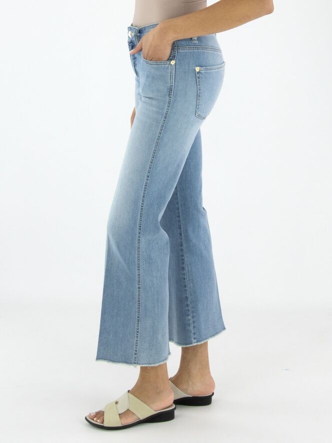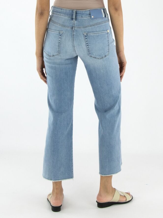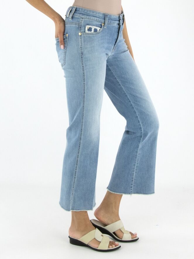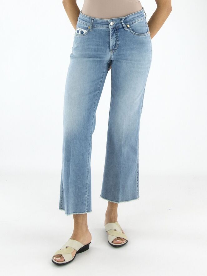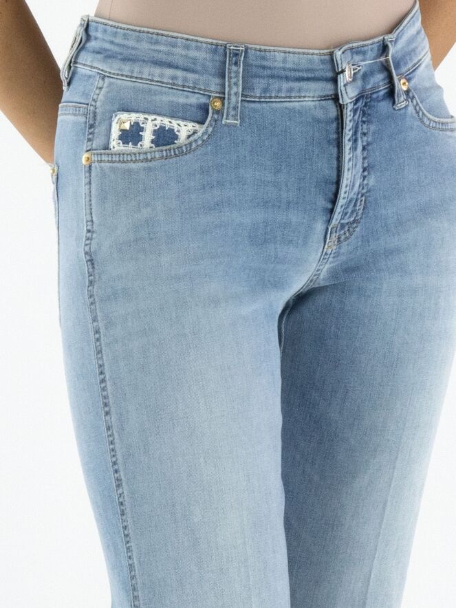 Un jean délavé de Cambio dans une teinte denim clair. Ce pantalon a une coupe 5 poches, et la cinquième poche est ornée d'un motif en blocs cousu en blanc. L'ourlet au bas des jambes est subtilement effiloché. Ce jean peut être lavé à 30 degrés.