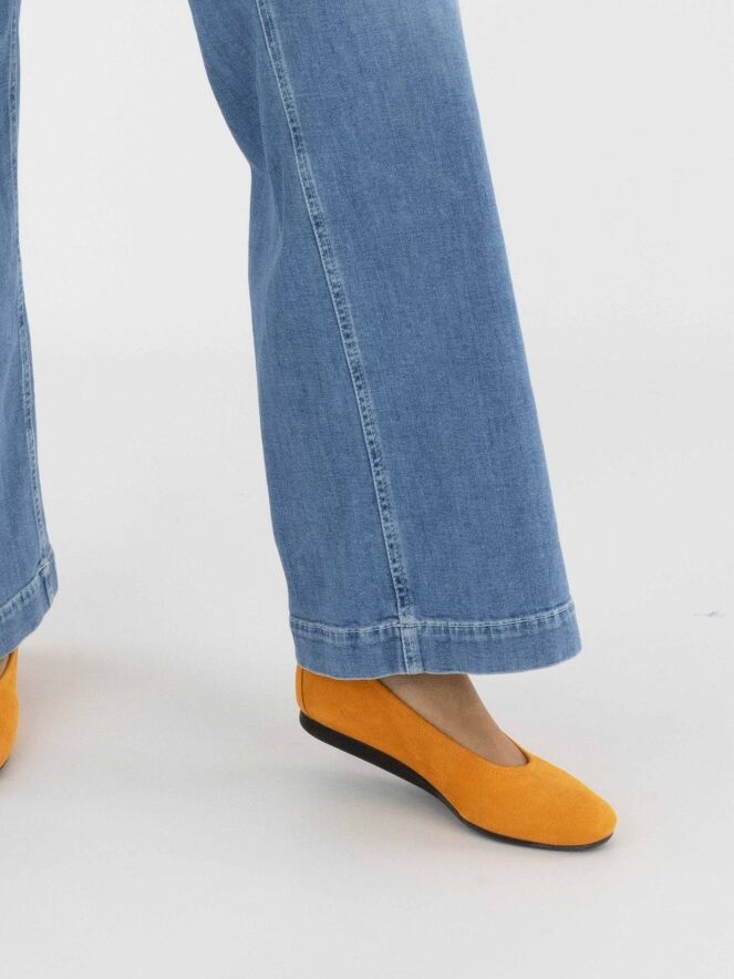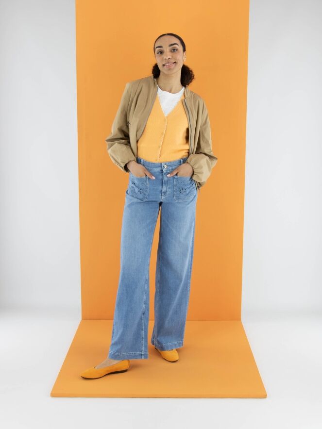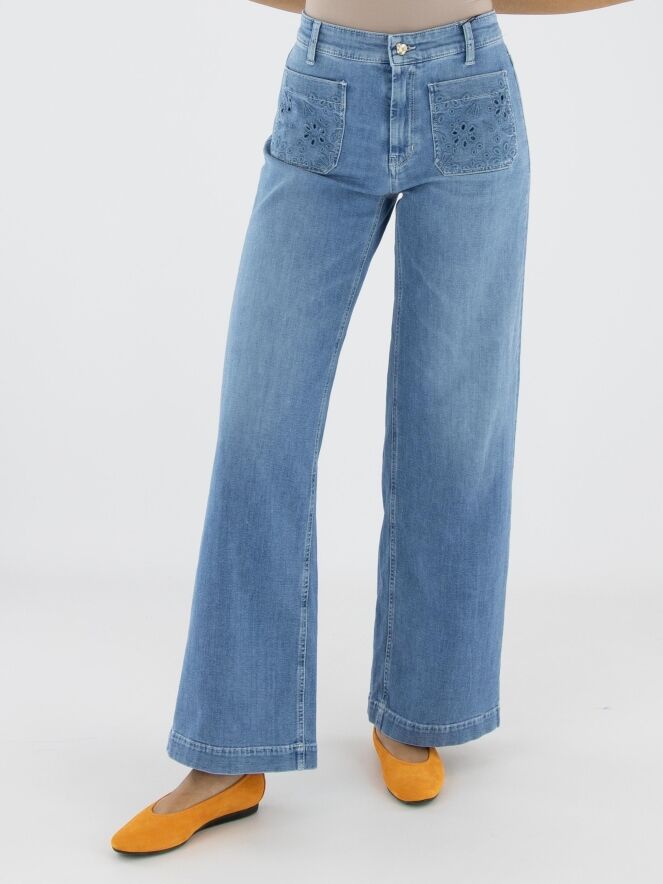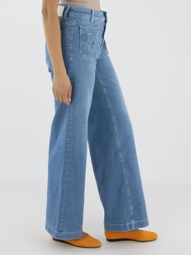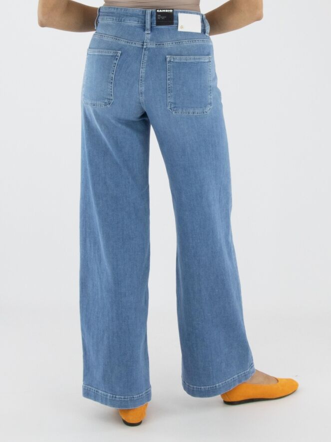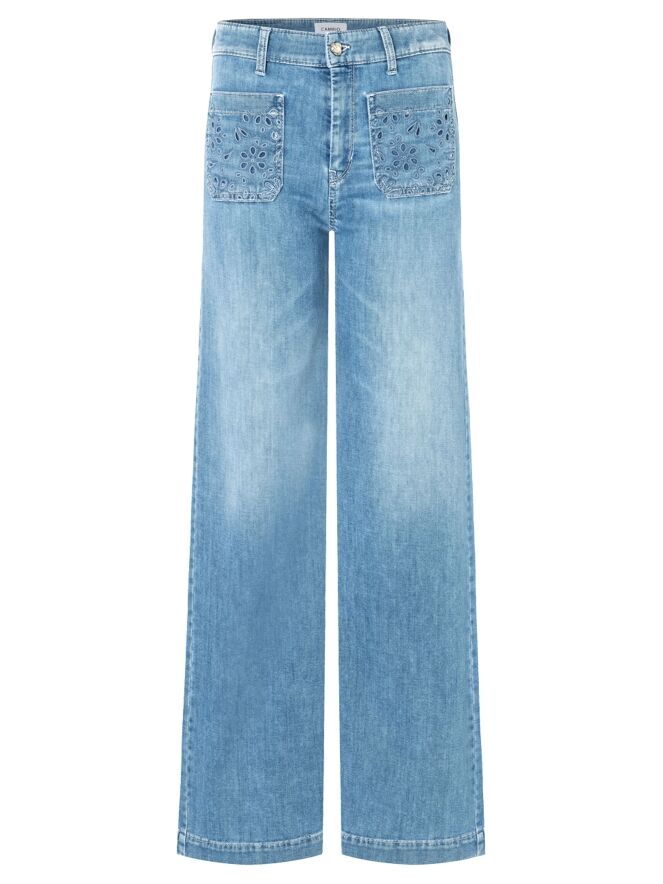 Un jean ample de Cambio dans une teinte denim clair. Les poches avant sont ornées d'un motif en dentelle avec des fleurs. Ce jean peut être lavé à 30 degrés.