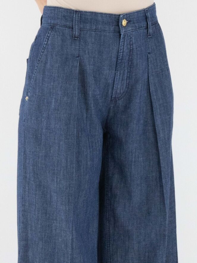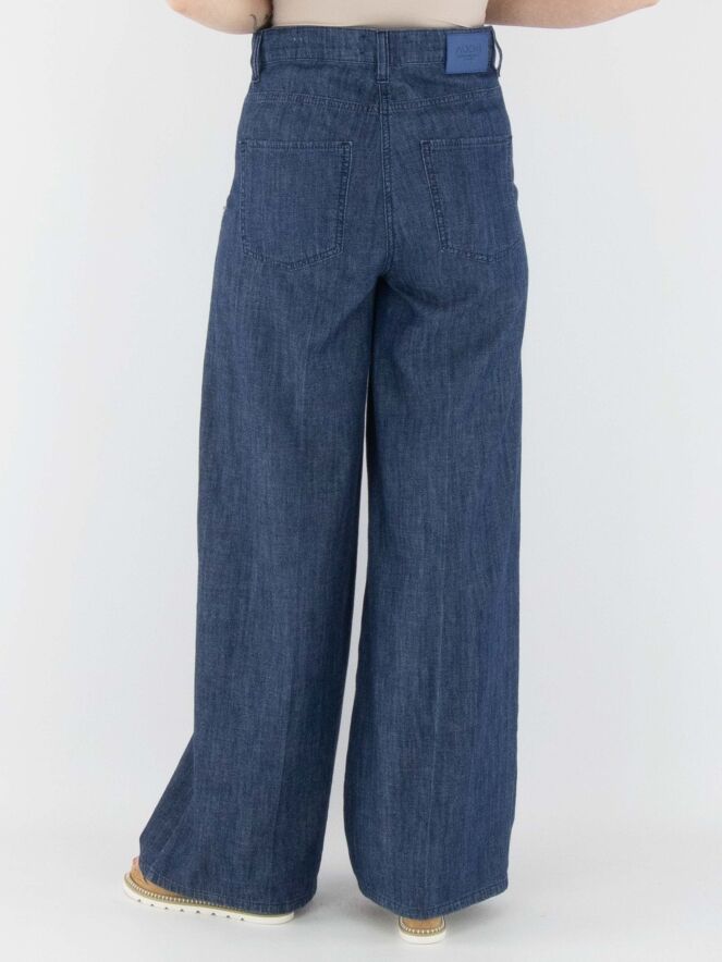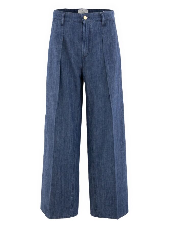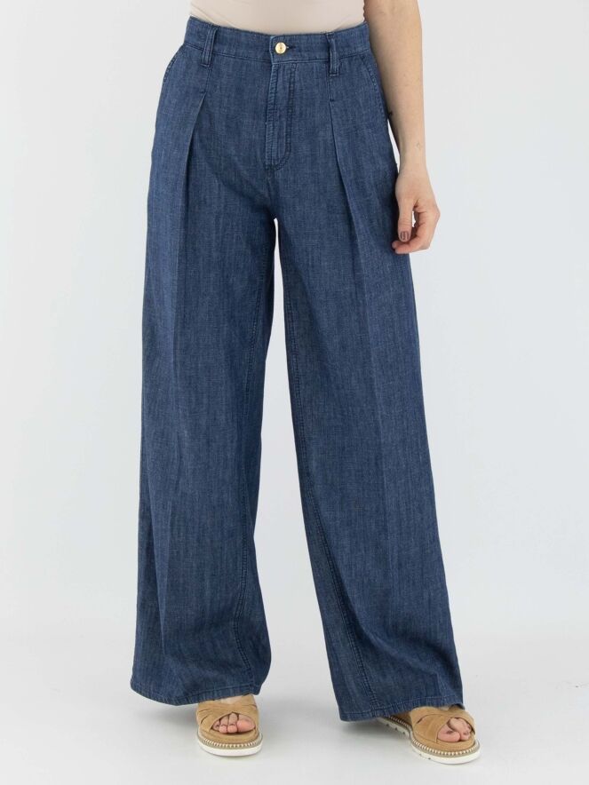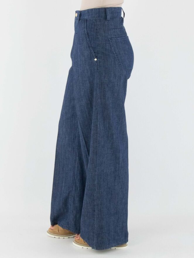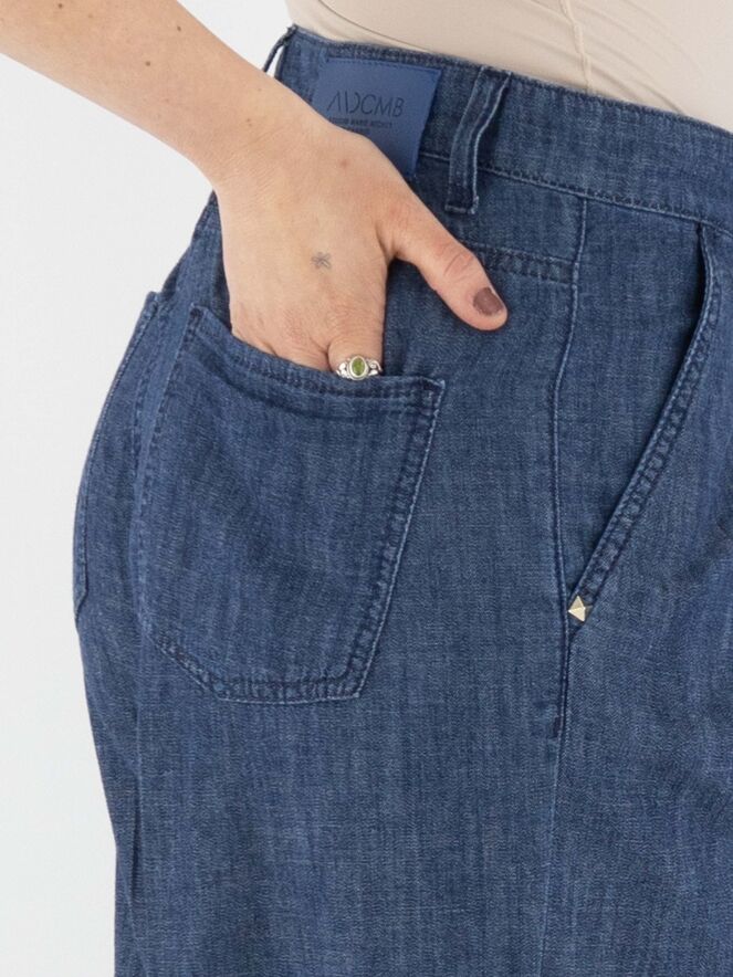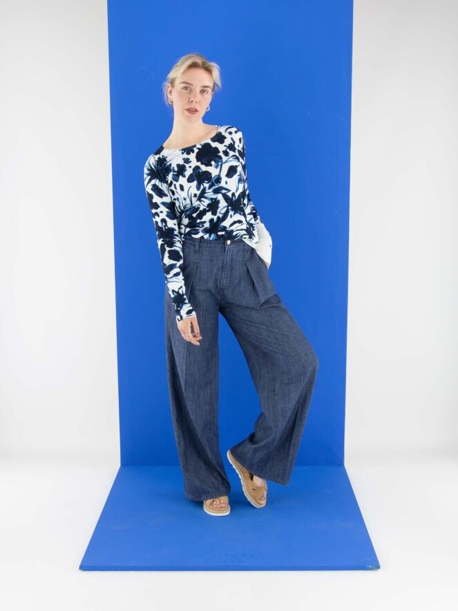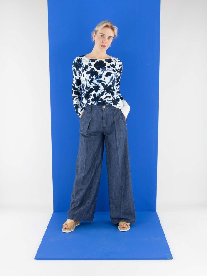 Un pantalon large et chiné avec un effet jean dans une teinte denim. Ce pantalon possède des poches latérales et un pli marqué au centre des jambes. Ce pantalon peut être lavé à 30 degrés.
