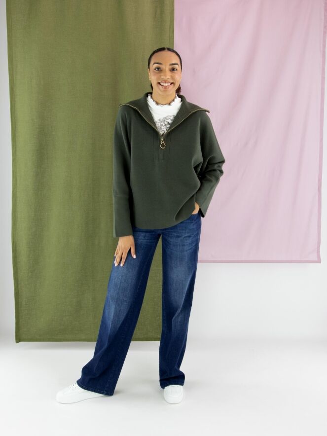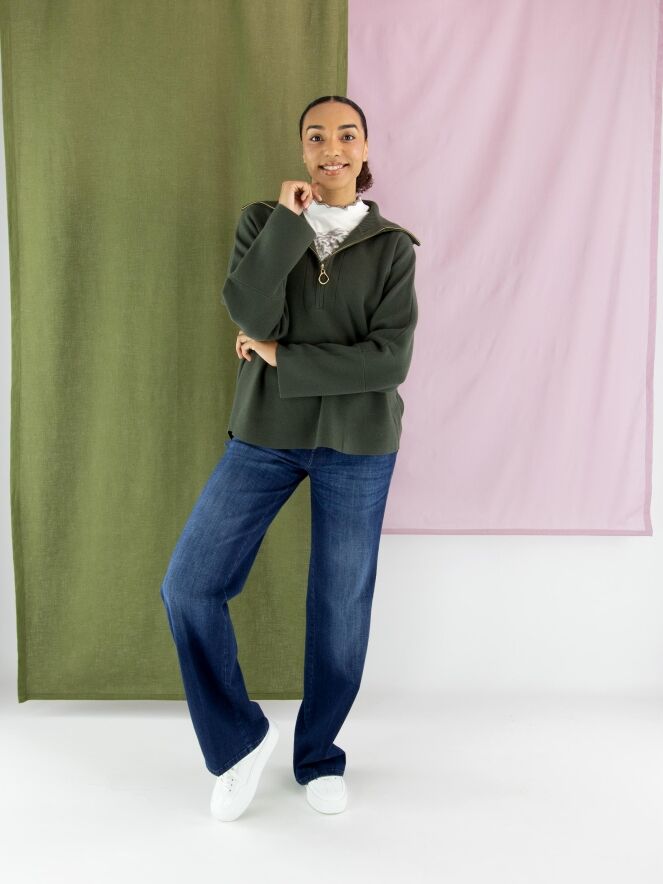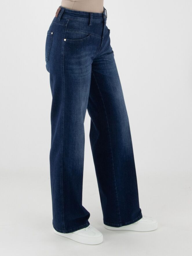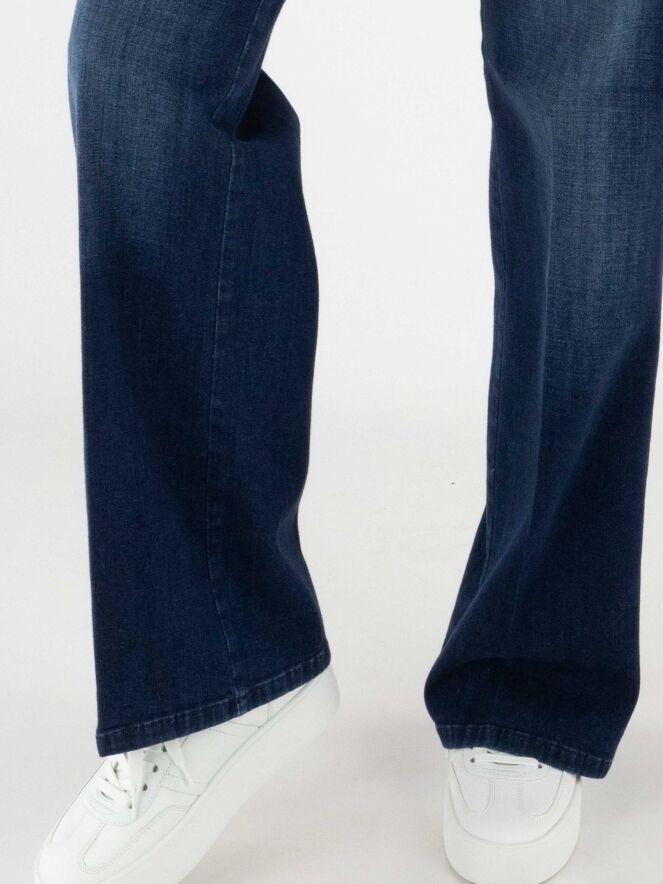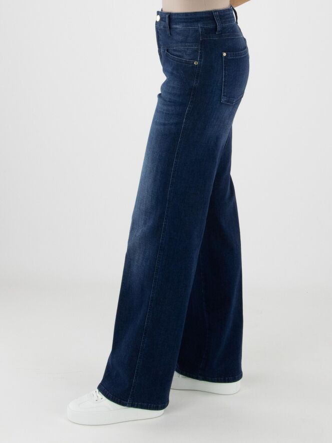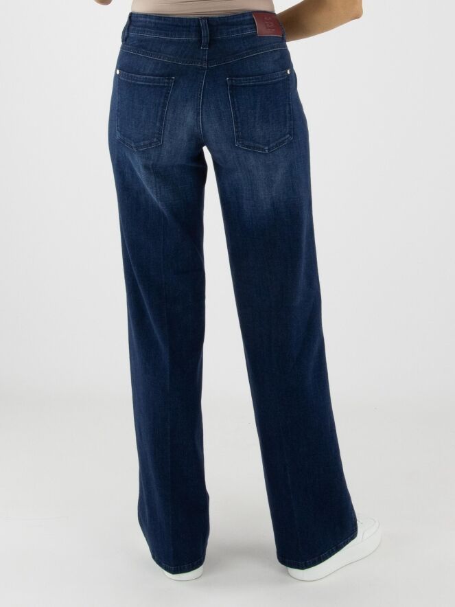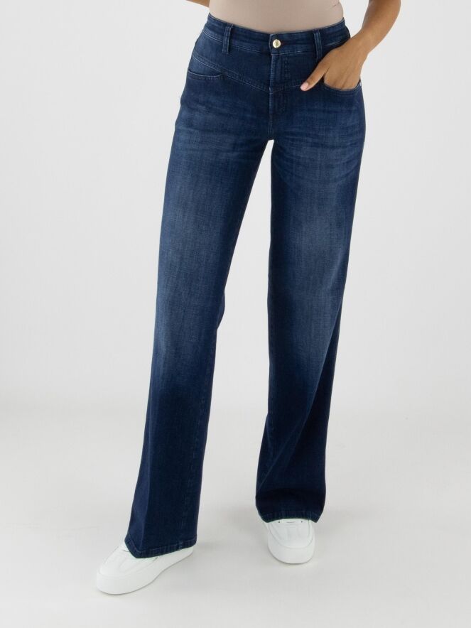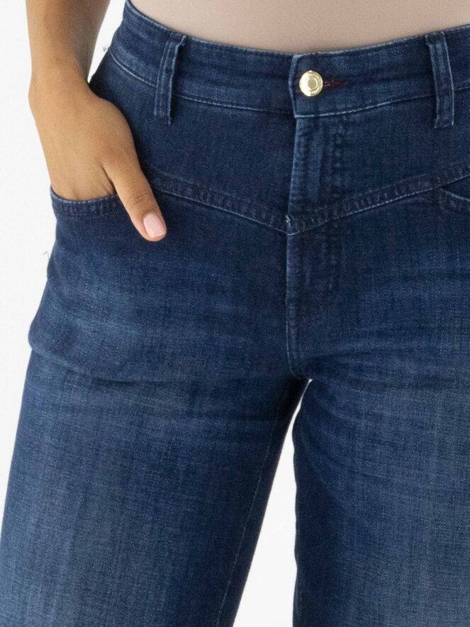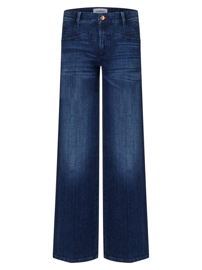 Jean ample délavé de la marque Cambio dans une teinte denim classique. Les poches sont légèrement abaissées avec un bord subtilement en biais. Un pli marqué est visible au centre de chaque jambe. Ce jean peut être lavé à 30 degrés.