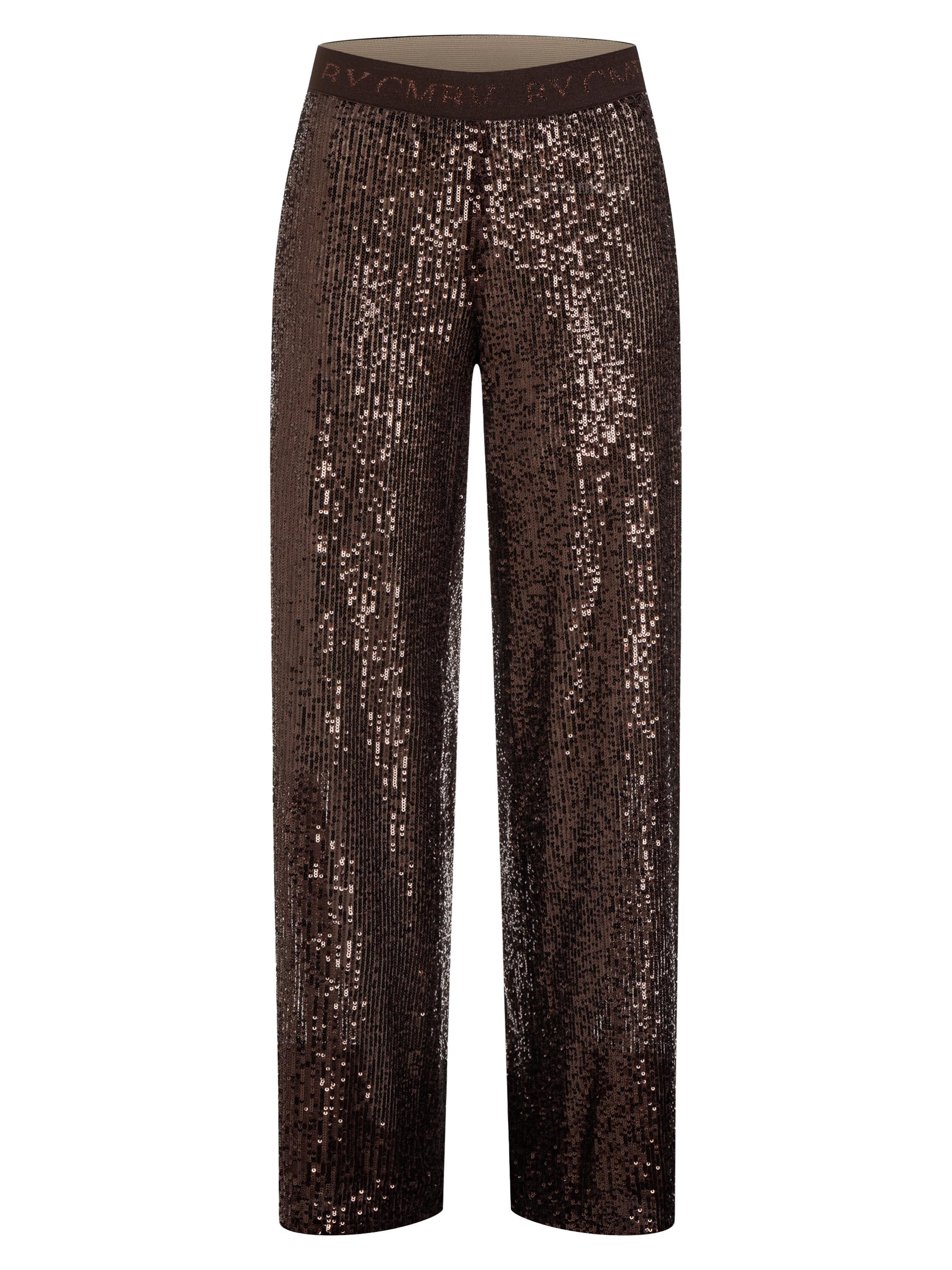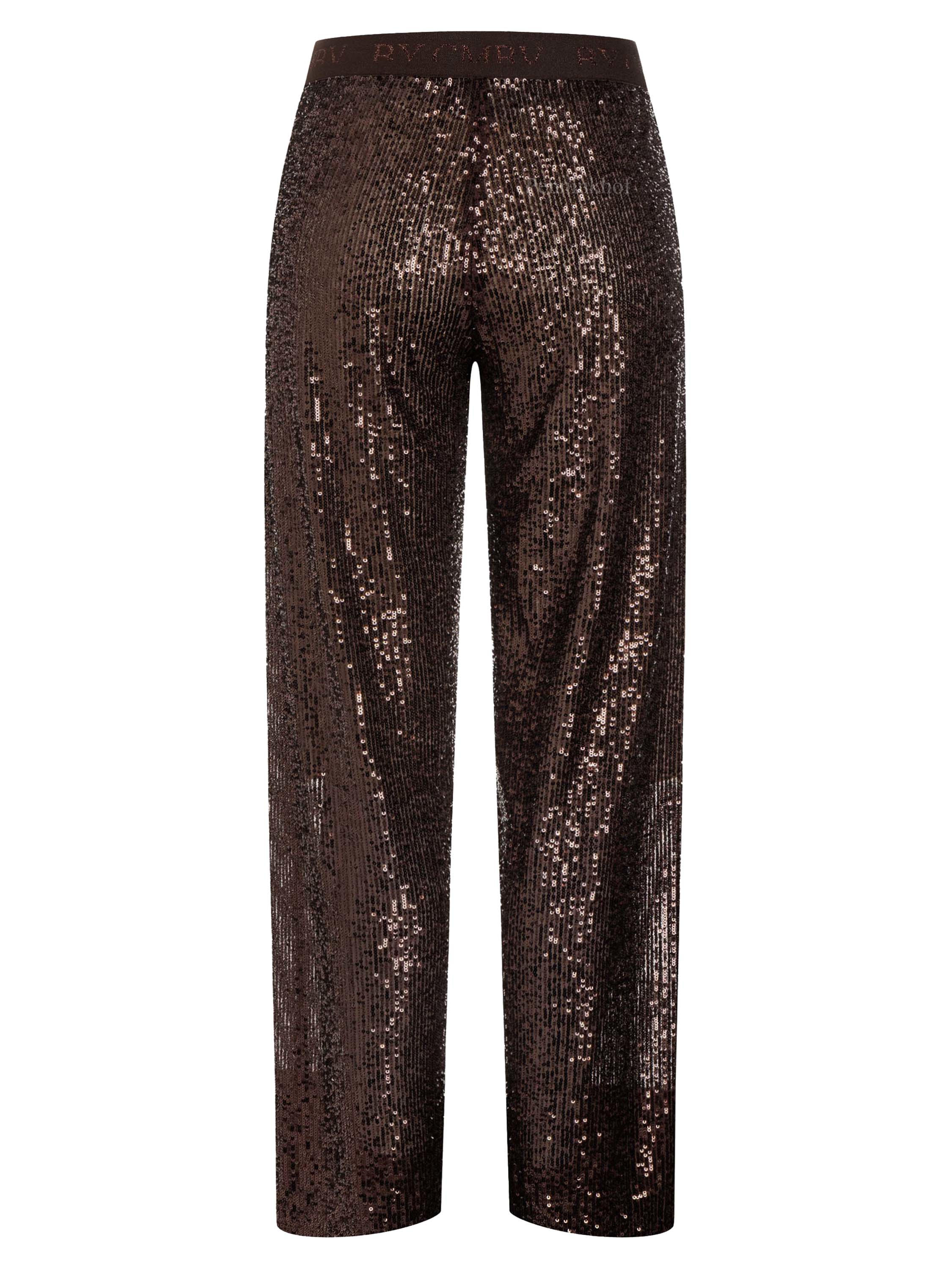Pantalon droit de la marque Cambio, de couleur bronze. Le pantalon est recouvert de paillettes de la même couleur que le tissu. La taille est équipée d'un élastique marron à lettrage brillant. Lavage à la main.