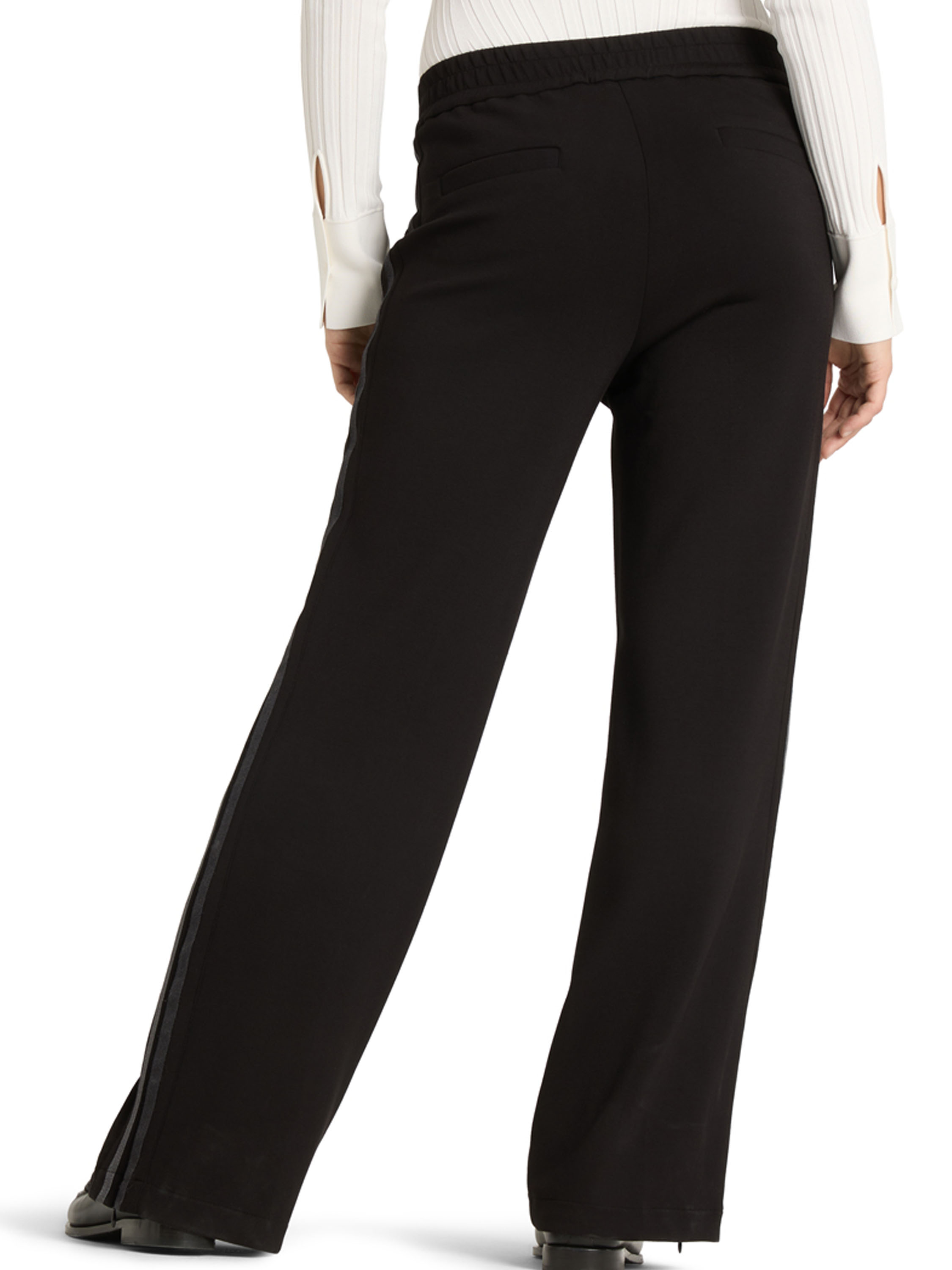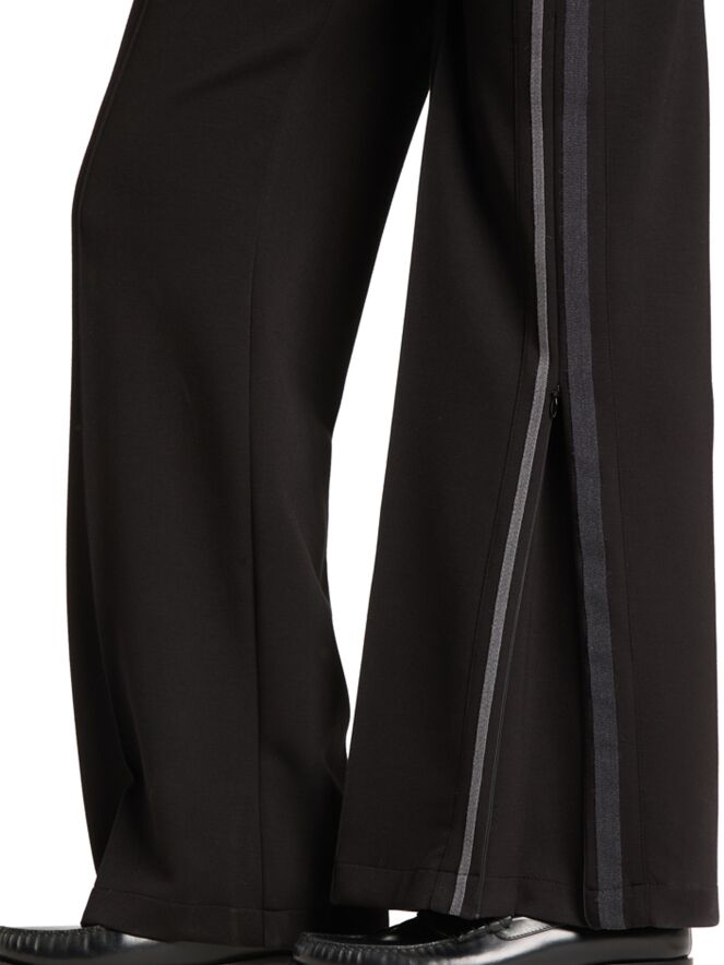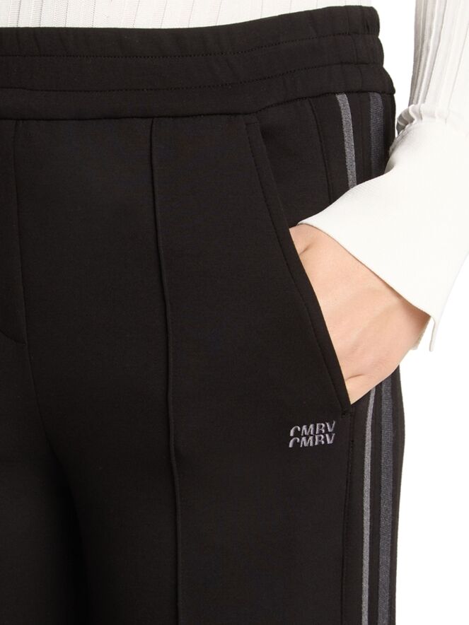 Pantalon de jogging de Cambio en noir. La large ceinture élastique assure un confort optimal, tandis qu’un double galon gris foncé et gris clair le long des jambes apporte une touche sportive et moderne. Des fermetures zippées au bas des jambes peuvent s’ouvrir jusqu’au-dessus du genou, offrant une coupe plus ample. Ce pantalon de créateur exclusif doit être lavé à la main.