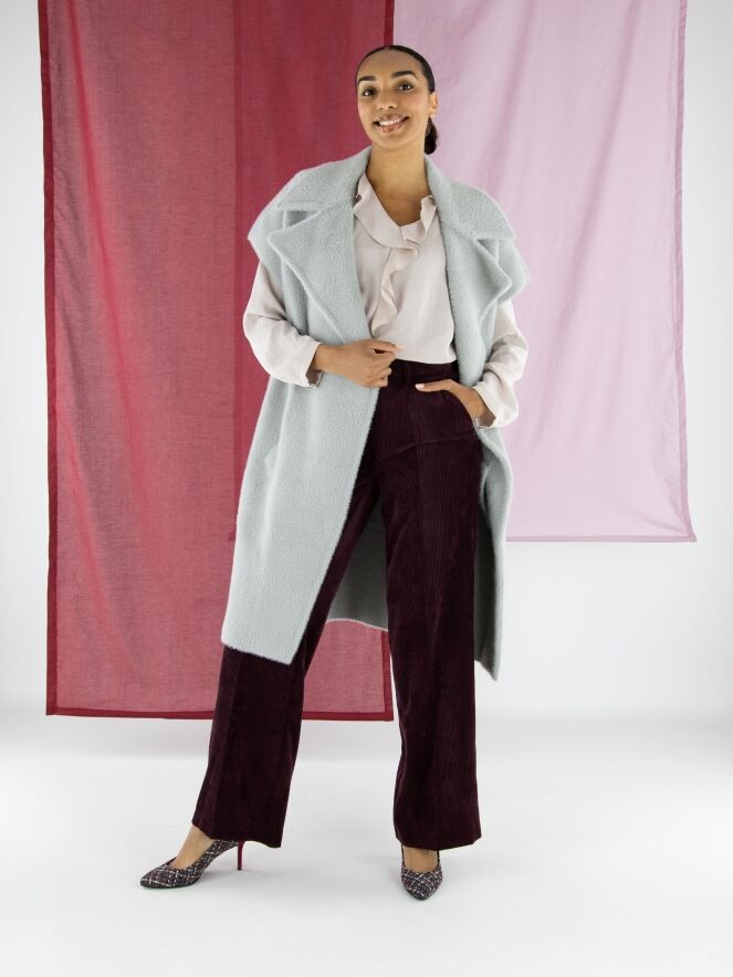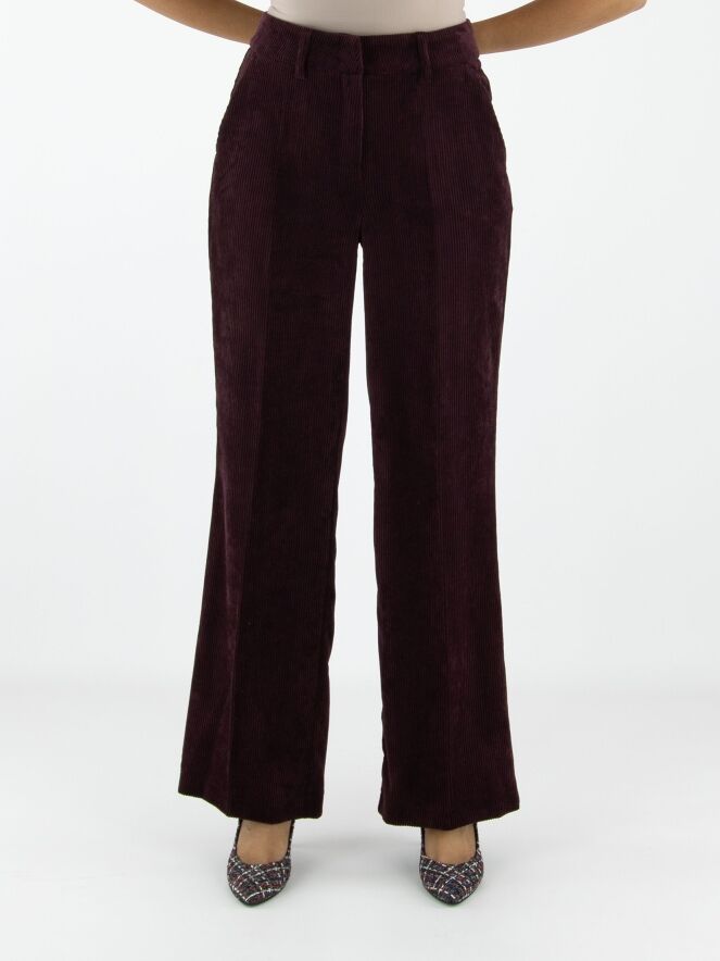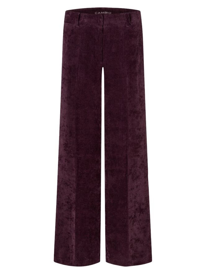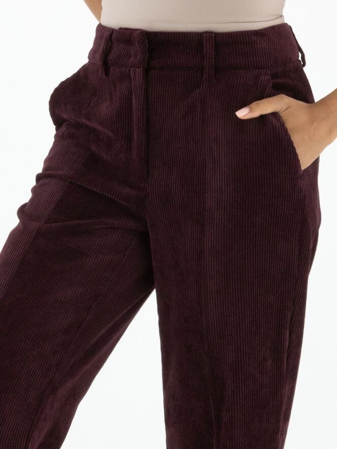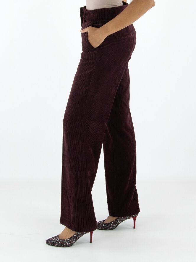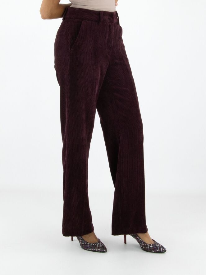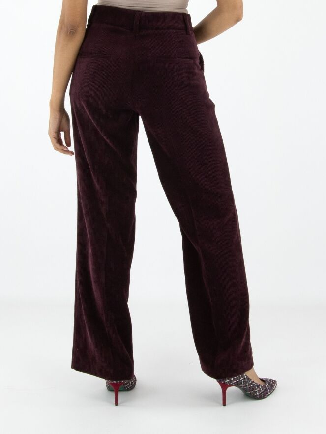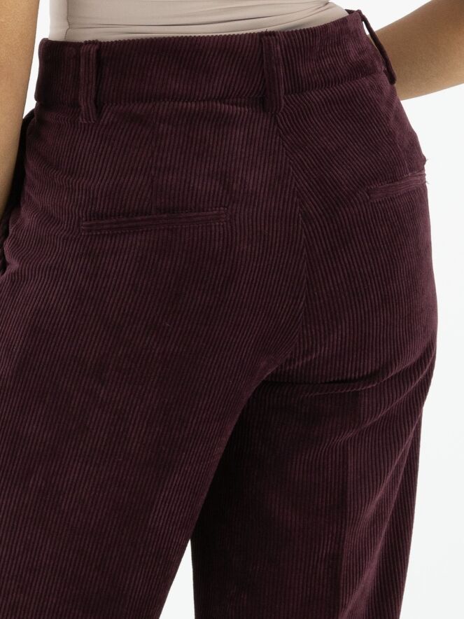 Pantalon droit en velours côtelé de luxe signé Cambio, dans une teinte rouge aubergine. Un pli repassé court au centre des jambes. Le pantalon possède des poches latérales et doit être lavé à la main.