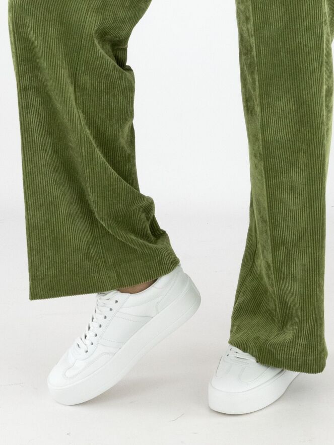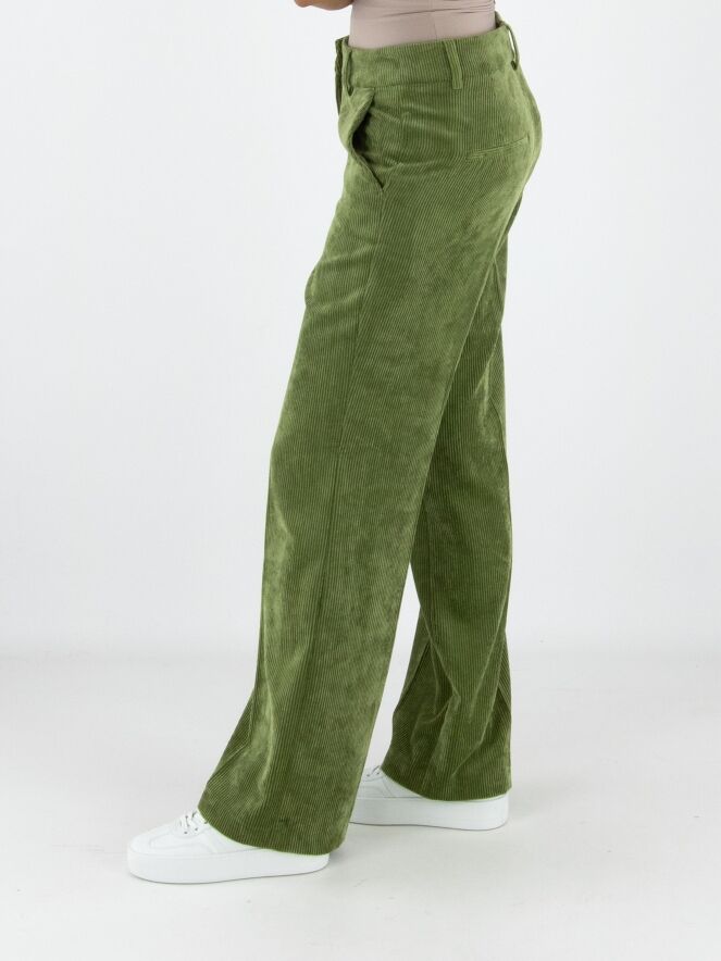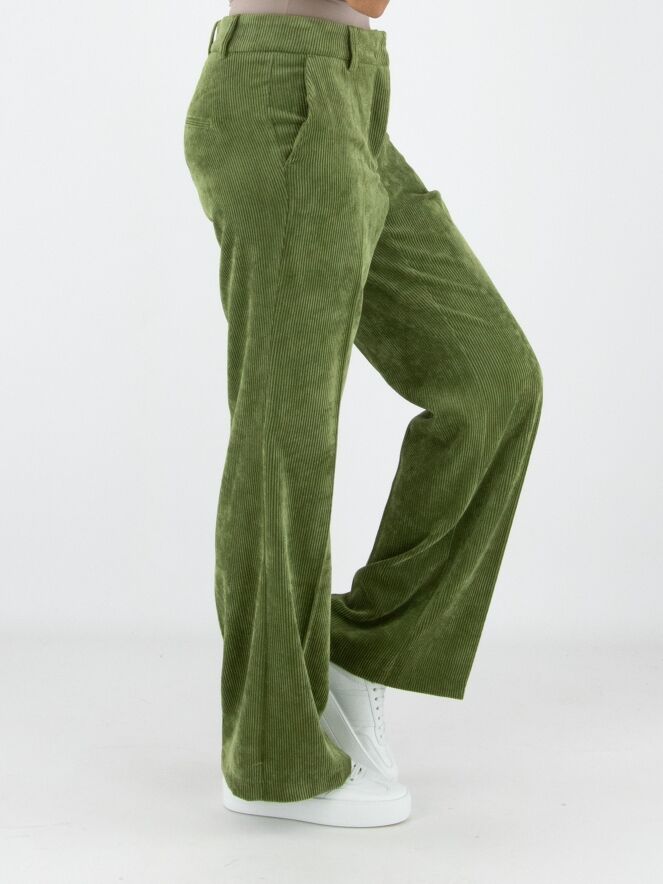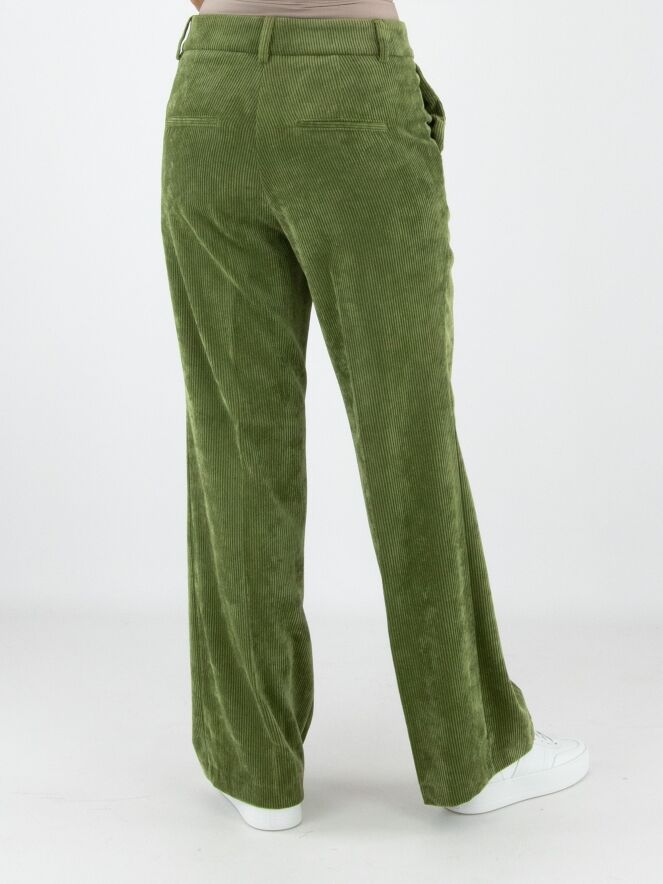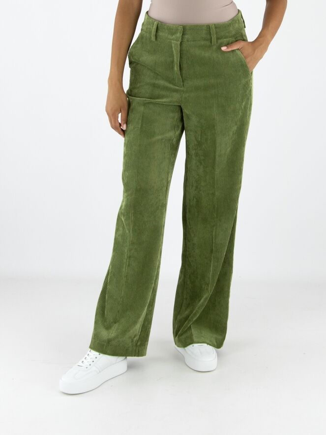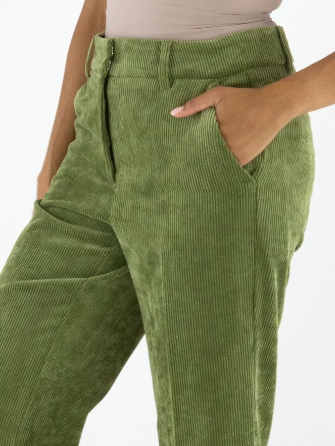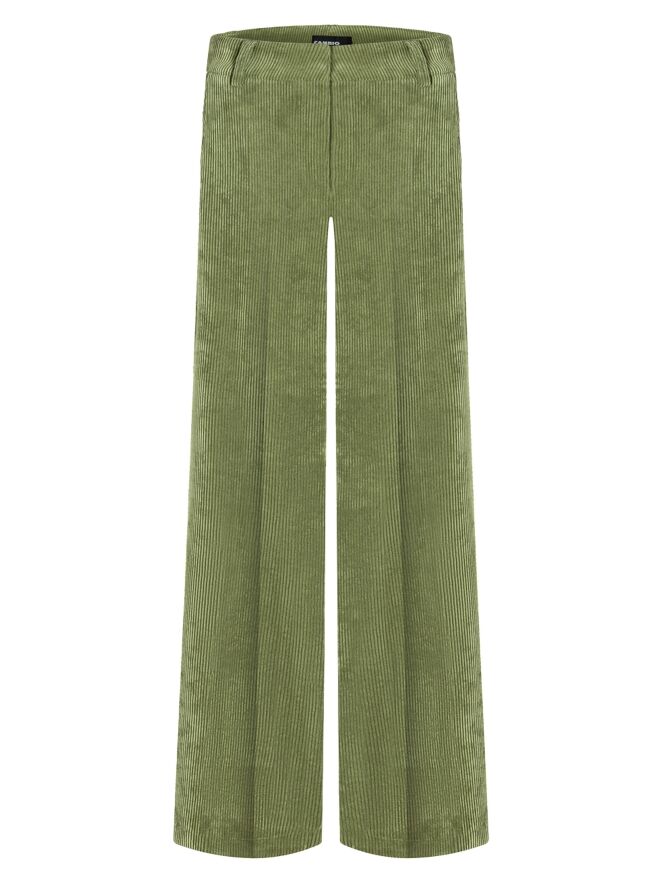 Un pantalon droit luxueux en velours côtelé de la marque Cambio, de couleur verte. Un pli repassé se trouve au centre des jambes. Le pantalon est doté de poches italiennes et peut être lavé à la main.