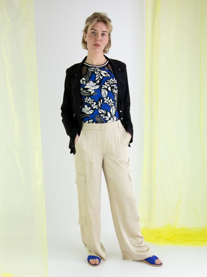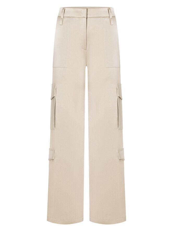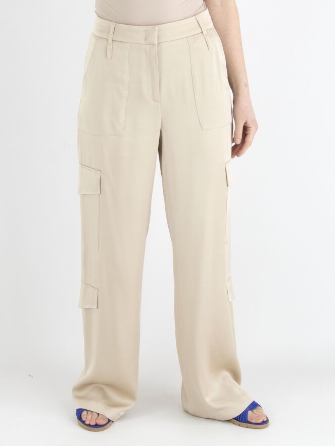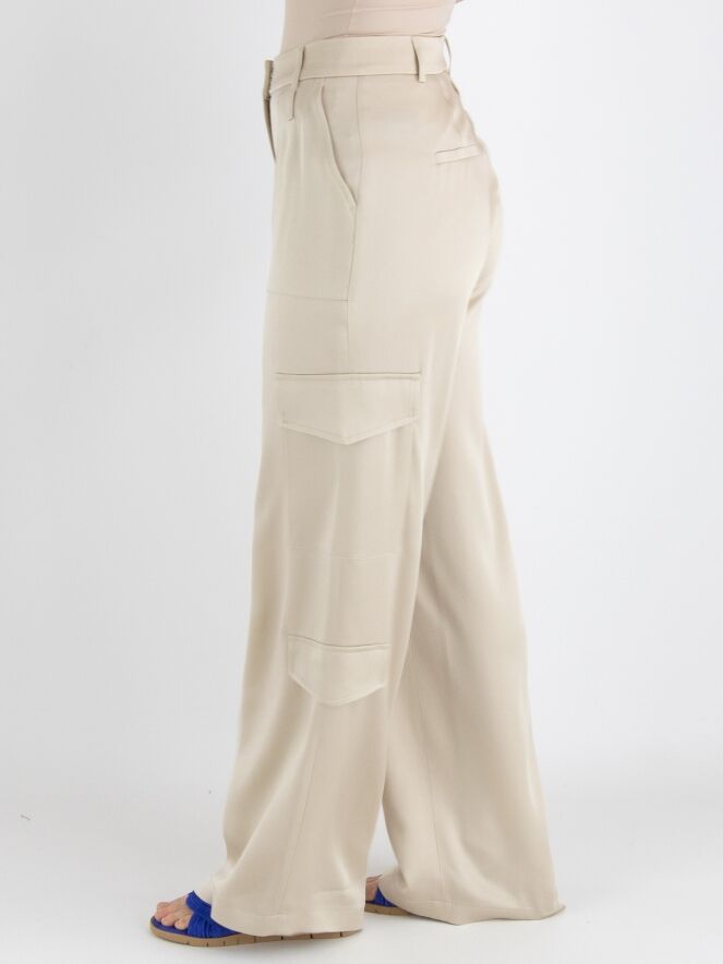 Un large pantalon cargo en satin mat de Cambio en beige. Le pantalon comporte des rabats de poche à la fois sur les jambes supérieures et inférieures. Il y a également des poches latérales sous la taille, et ce pantalon peut être lavé à la main.