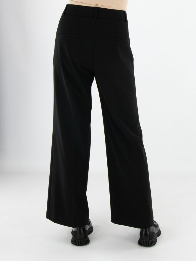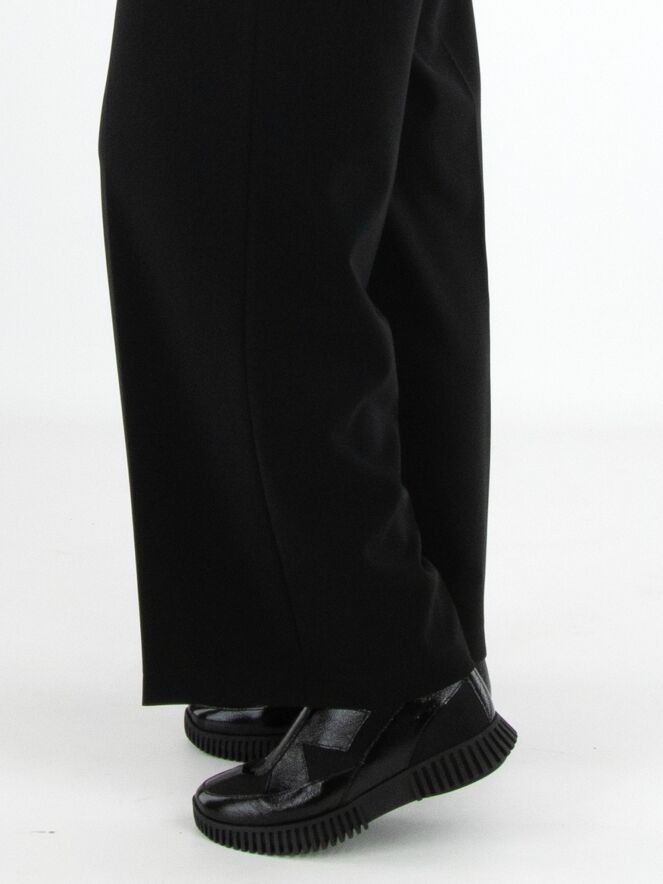 Pantalon Cambio en noir. Sur le côté droit, un panneau croisé part de la couture latérale et est fixé à la taille. Un pli marqué est visible au centre des jambes. Le pantalon est doté de poches fendues et doit être lavé à la main.