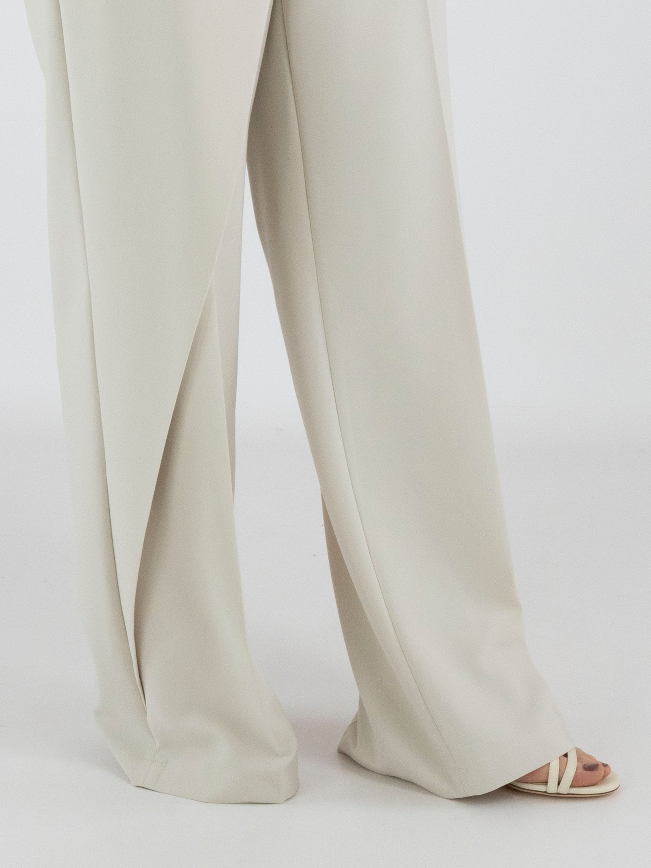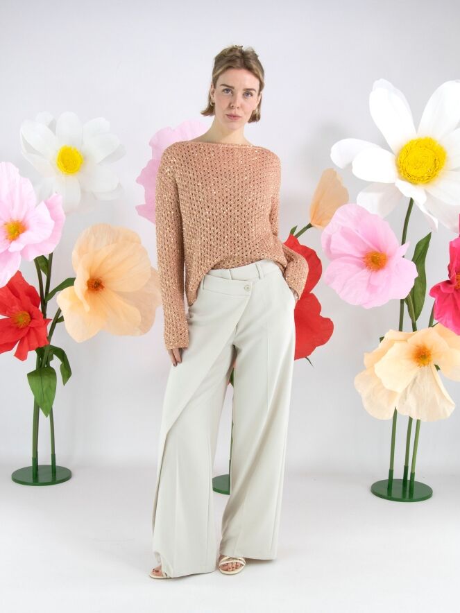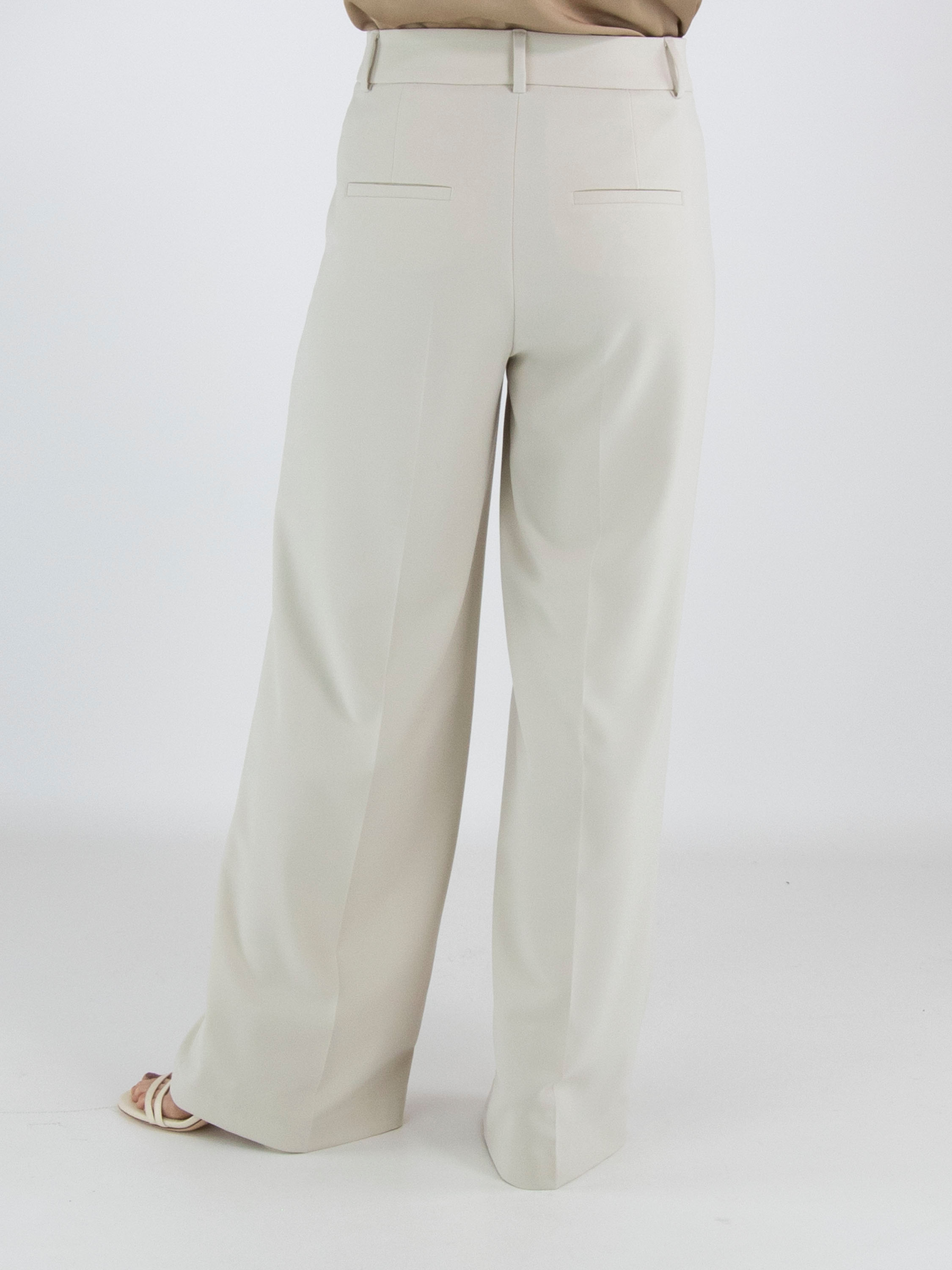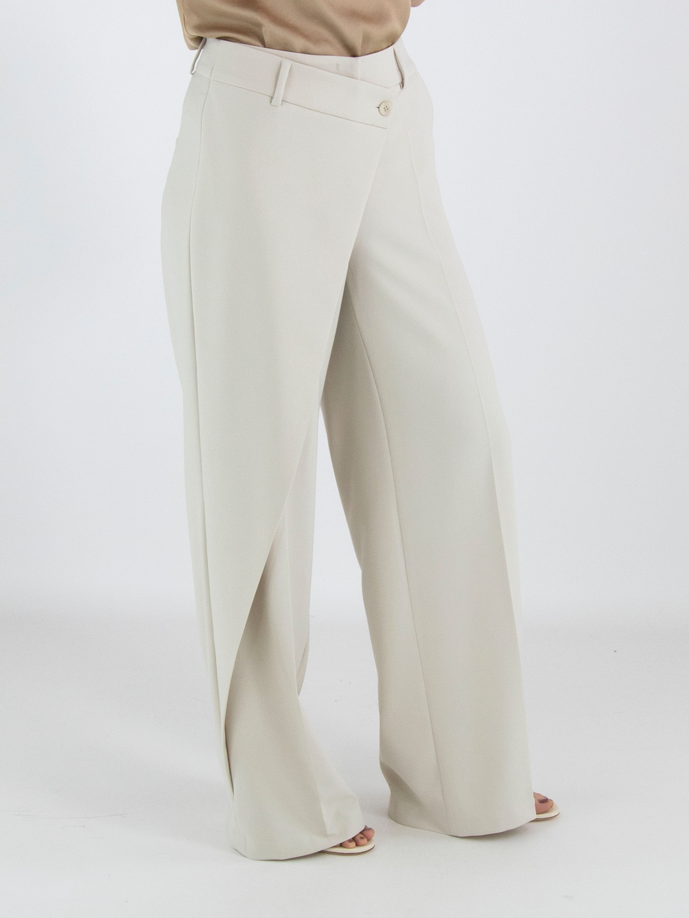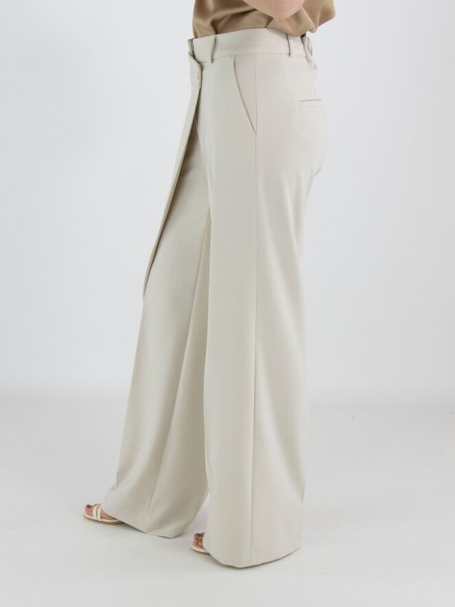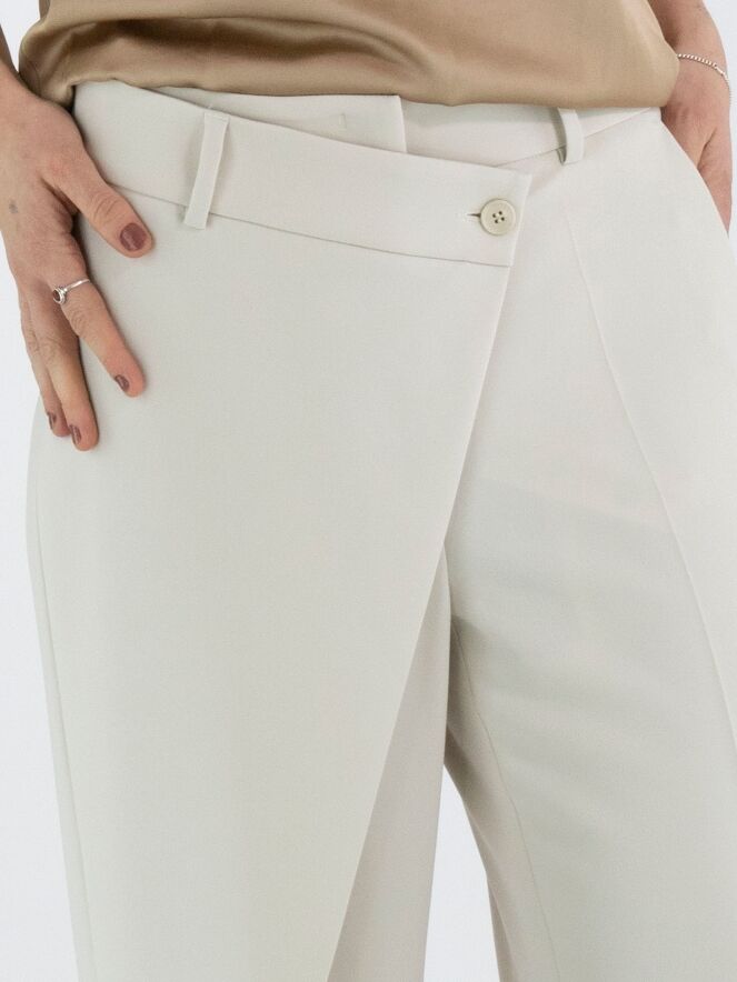 Un pantalon de Cambio en couleur beige. Sur le côté droit, un pan croisé part de la couture latérale et est fixé à la taille. Un pli repassé descend au centre des jambes. Le pantalon possède des poches fendues et peut être lavé à la main.