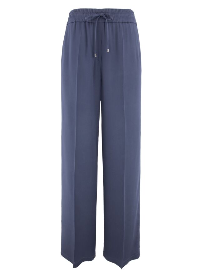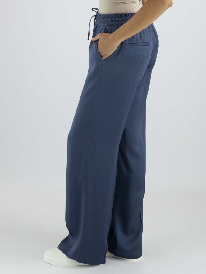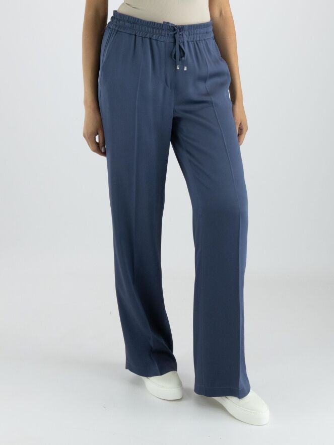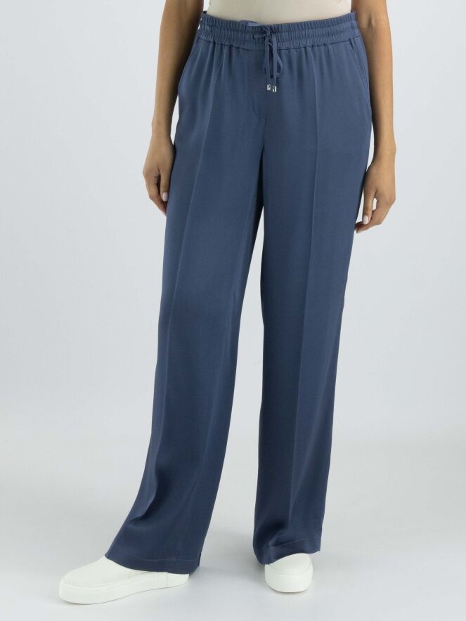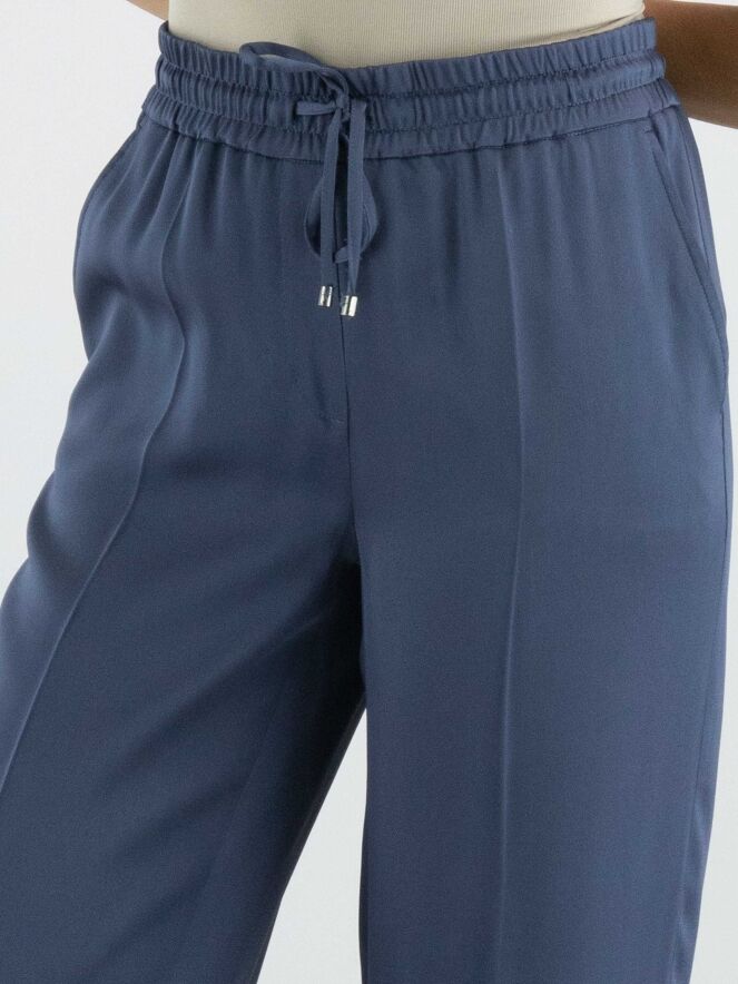 Un pantalon en satin mat luxueux de Cambio en bleu pétrole. La taille comporte un bandeau élastique finement côtelé avec un cordon de serrage dans une coulisse. Le pantalon possède des poches latérales et un pli marqué au centre des jambes. Ce pantalon peut être lavé à la main.