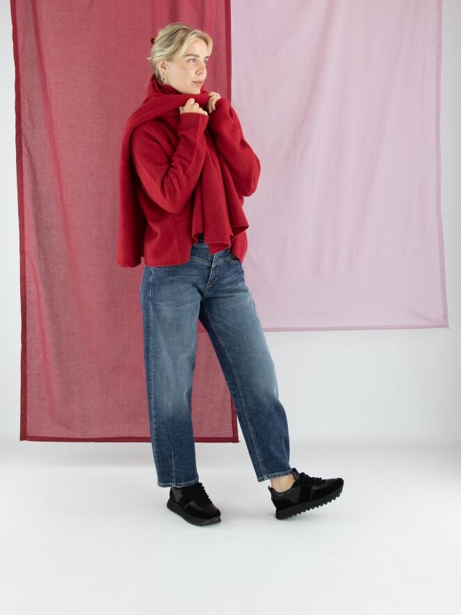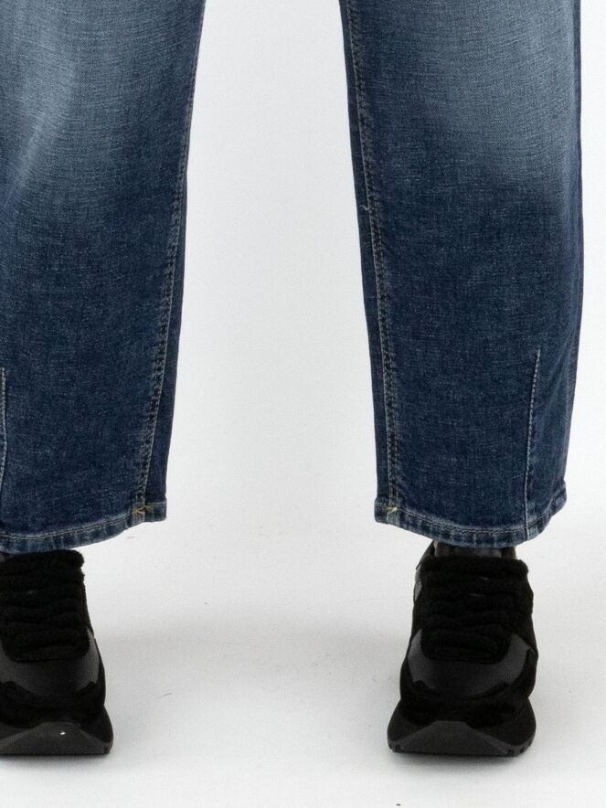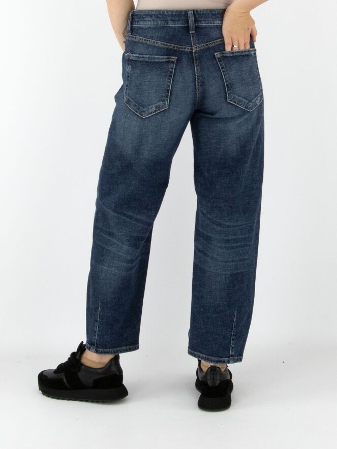 Jean de Cambio en denim foncé. Une couture verticale au bas des jambes souligne la coupe, tandis que les bords des poches avant sont soulignés par une légère ligne diagonale pour une touche d’élégance discrète. Ce jean peut être lavé à 30 degrés.