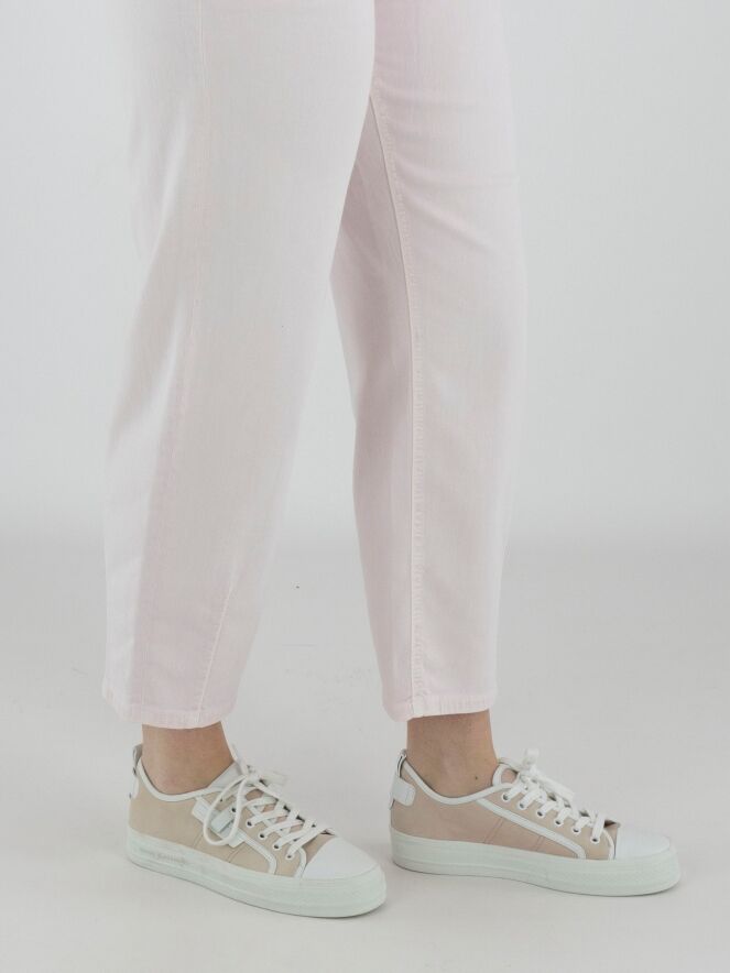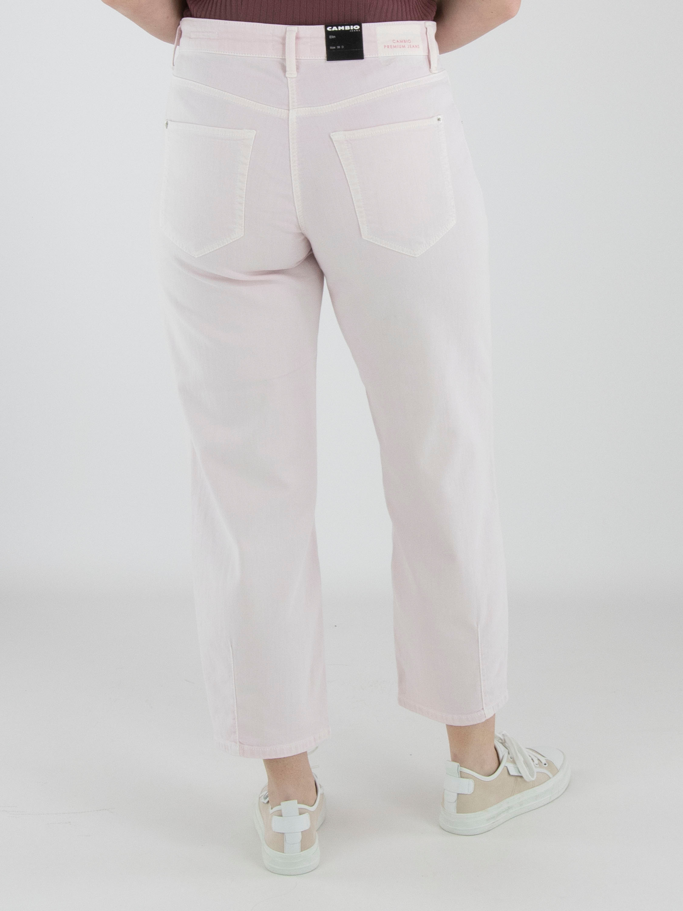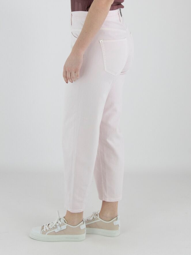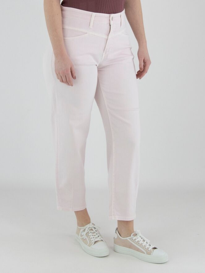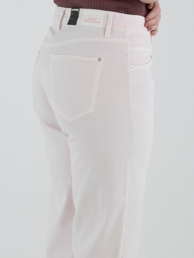 Un jean de Cambio de couleur rose pastel. Les poches à l’avant sont légèrement coupées en diagonale. Ce jean peut être lavé à 30 degrés.
