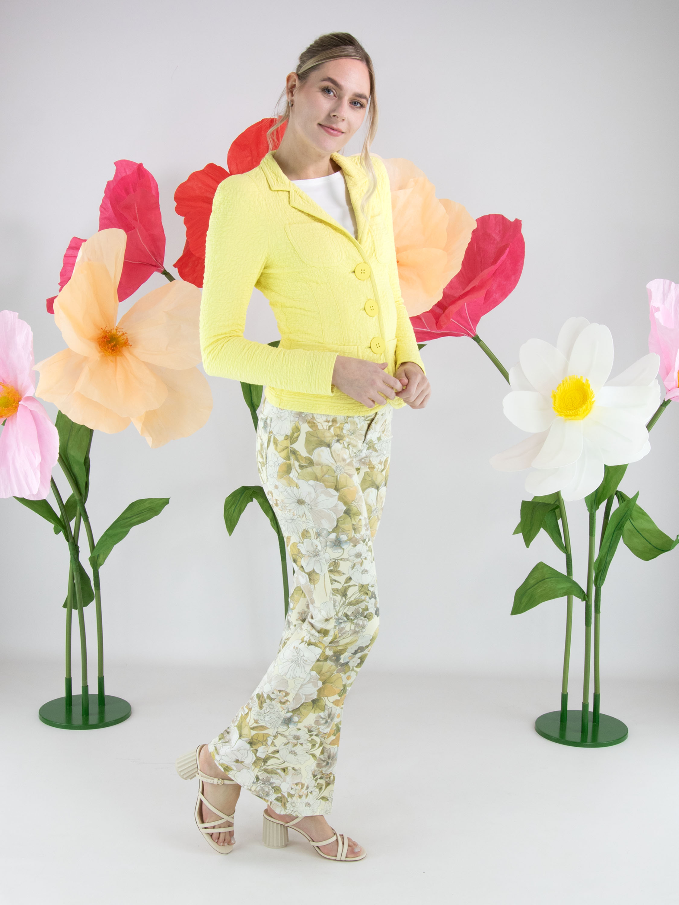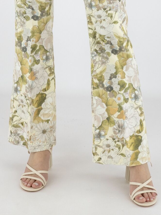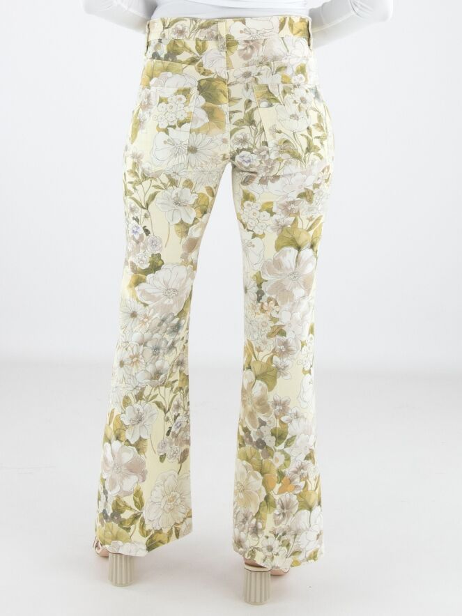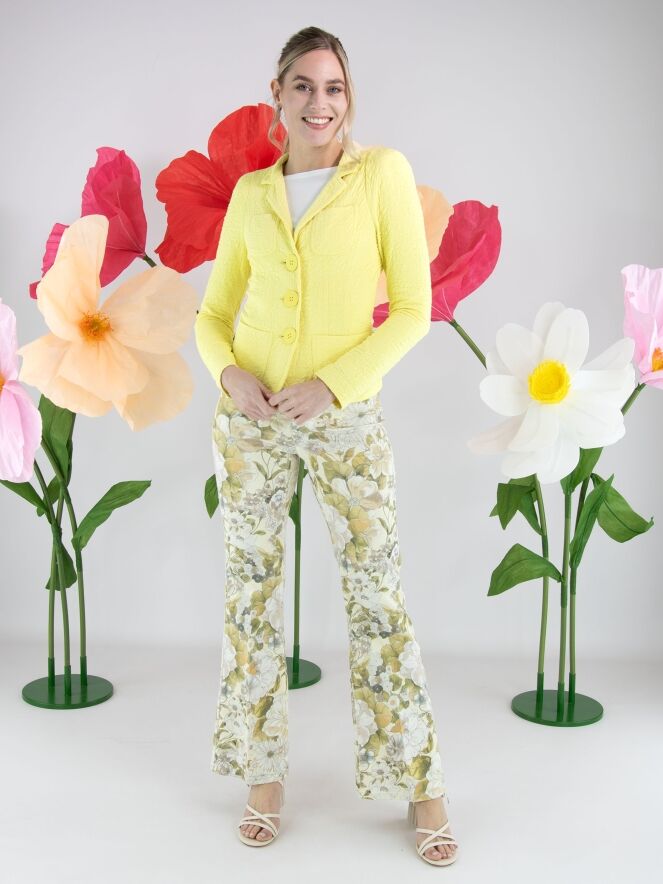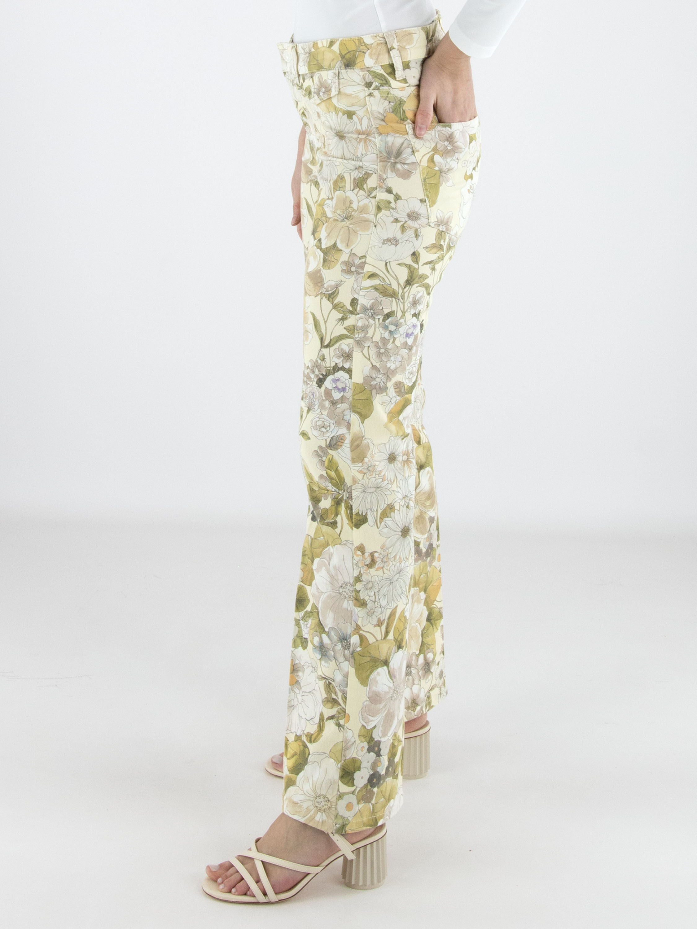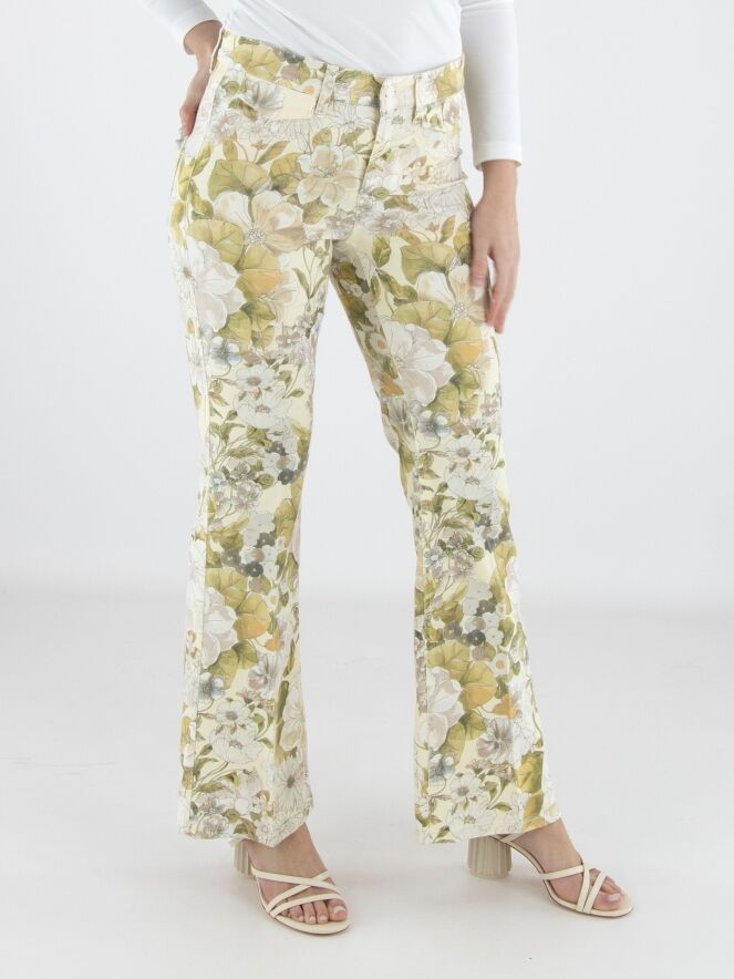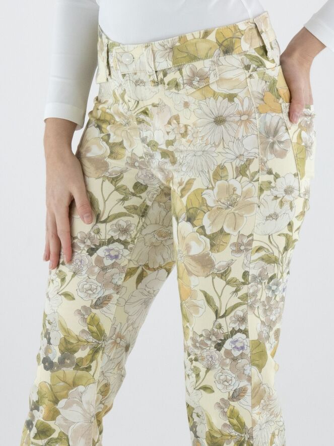 Jean de Cambio orné d’un imprimé floral raffiné dans des tons pastel d’olive et de taupe sur fond vanille. Juste sous la ceinture, deux poches décoratives à rabat apportent une touche féminine et originale. Un pli repassé au centre des jambes souligne une silhouette élégante et élancée. Ce jean de créateur exclusif peut être lavé à 30 degrés.