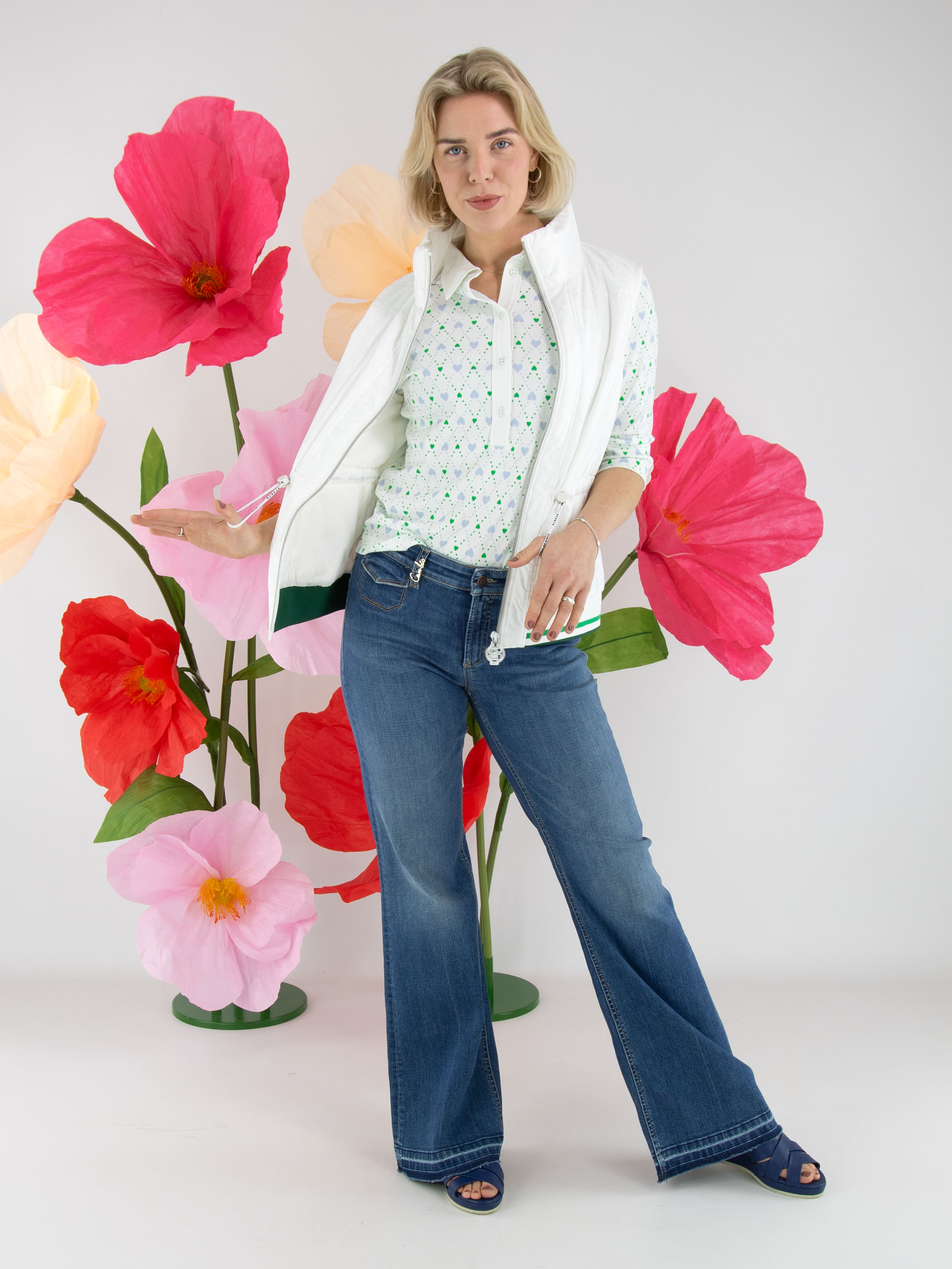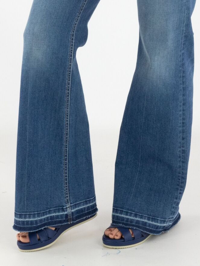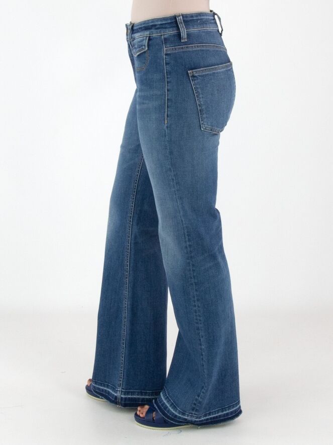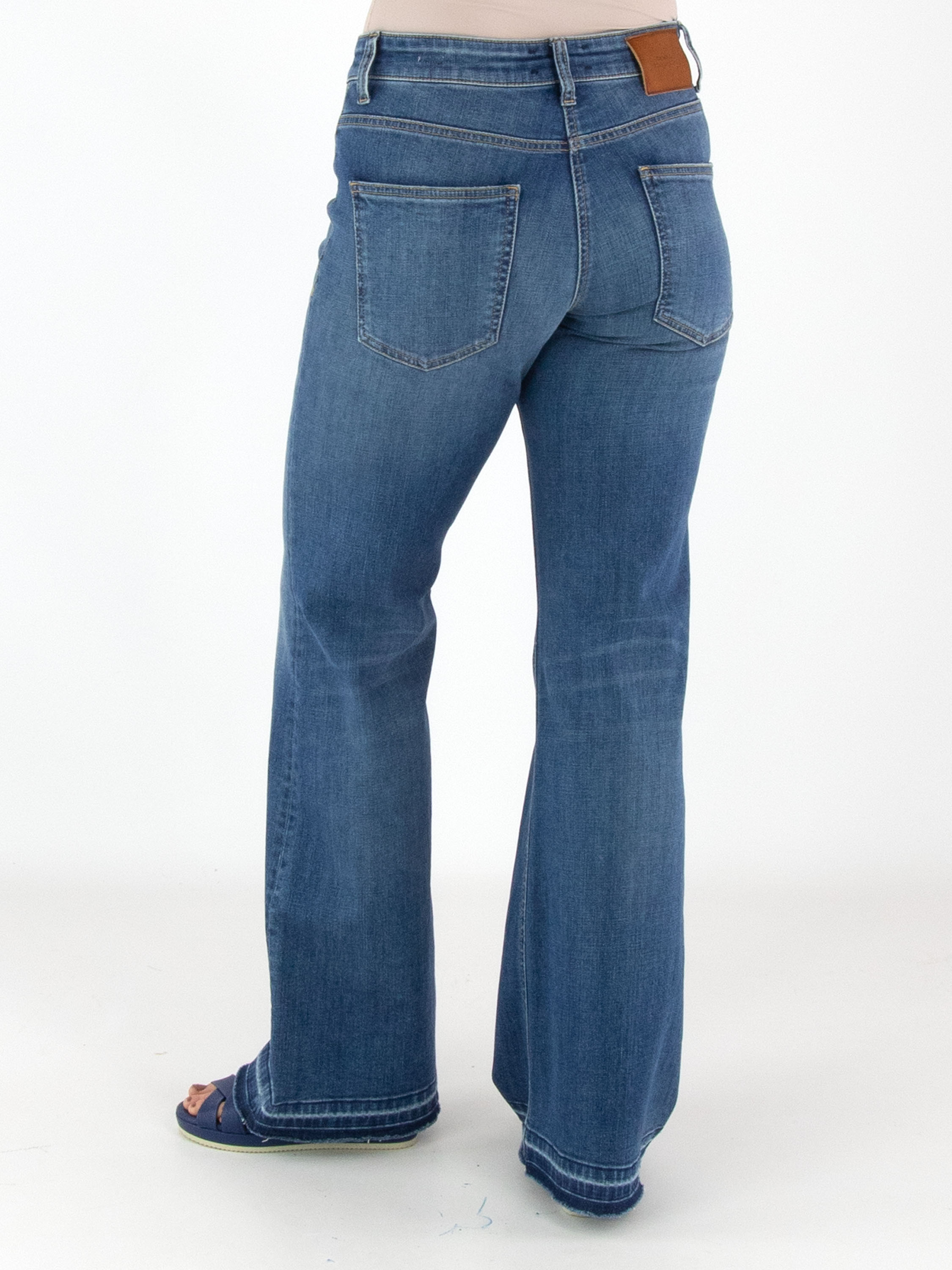 Un jean de Cambio dans une teinte denim classique. Sous la ceinture, deux petites poches décoratives avec rabat sont appliquées. À partir des genoux, les jambes s’évasent légèrement. Le long de l’ourlet, de fines rayures délavées sont visibles. Ce jean peut être lavé à 30 degrés.