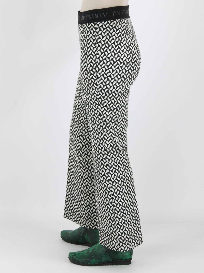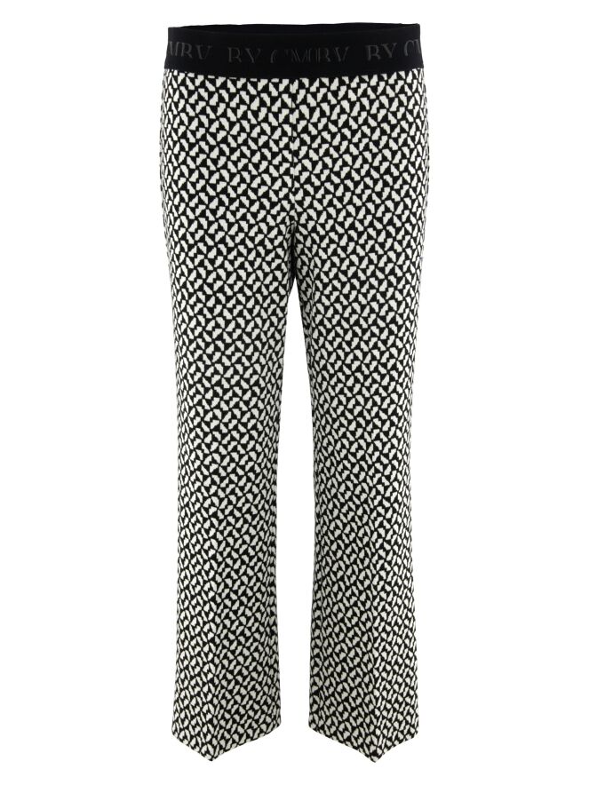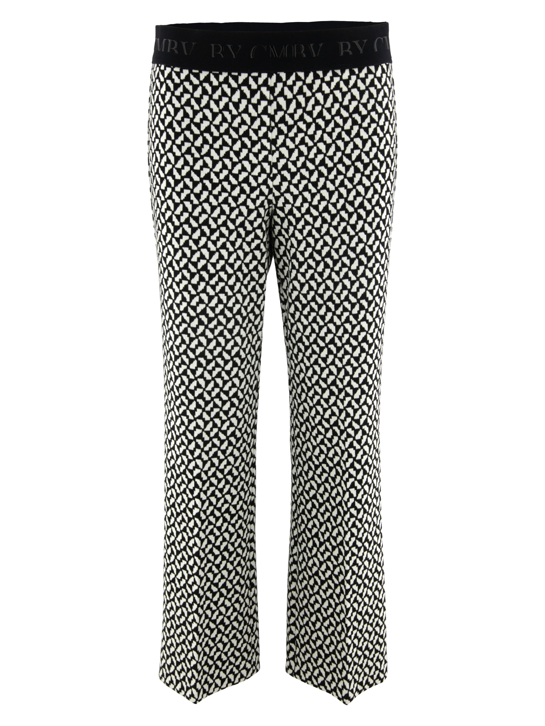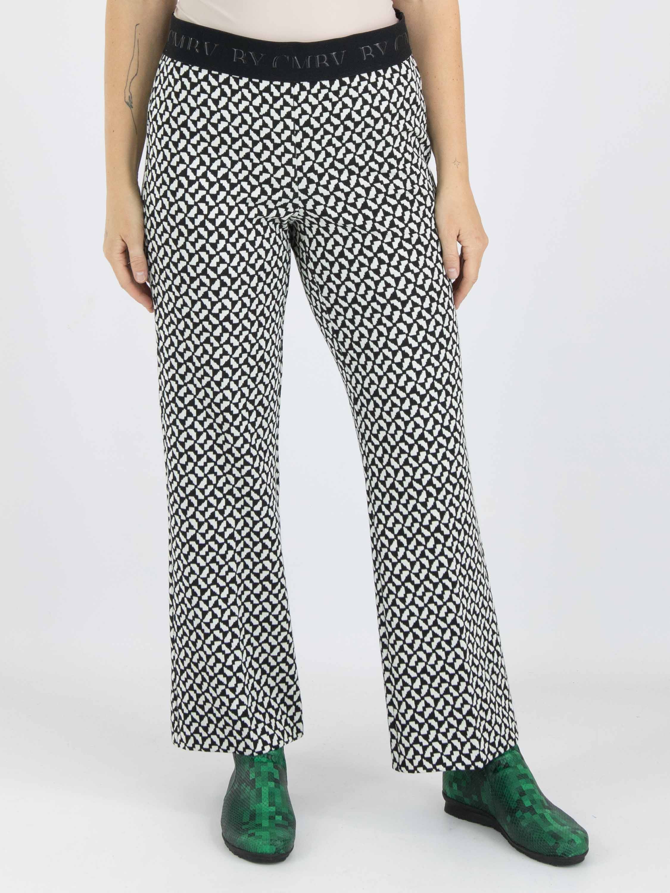 Un pantalon évasé de Cambio avec un imprimé graphique en noir et blanc. La taille est munie d'un élastique noir. Ce pantalon peut être lavé à la main.