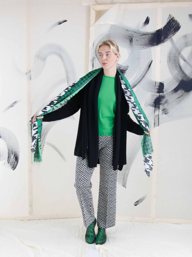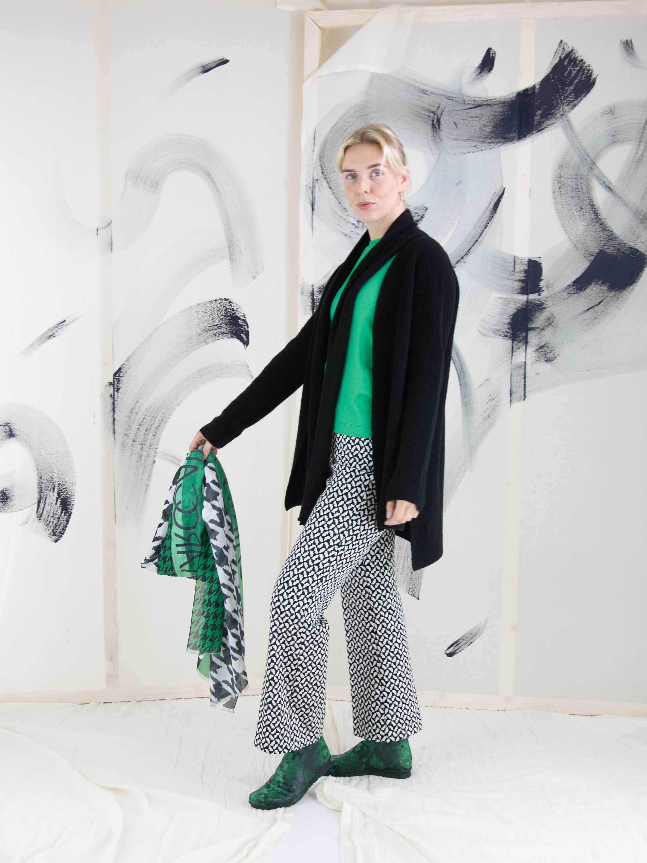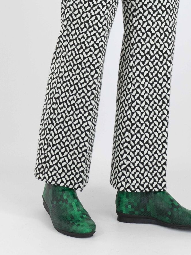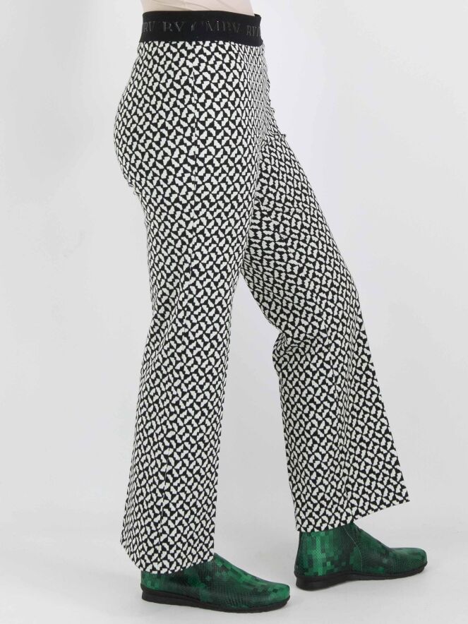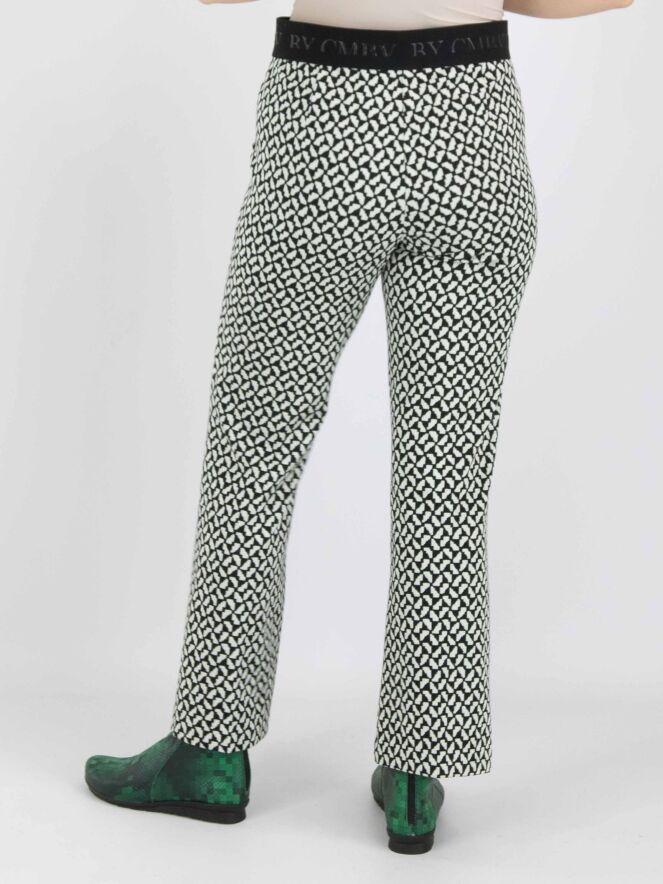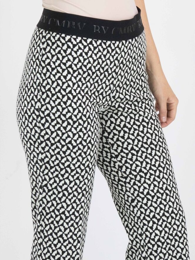 Un pantalon évasé de Cambio avec un imprimé graphique en noir et blanc. La taille est munie d'un élastique noir. Ce pantalon peut être lavé à la main.