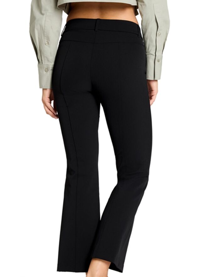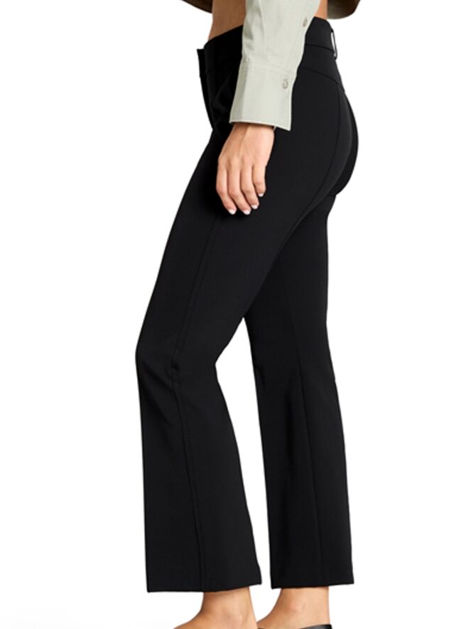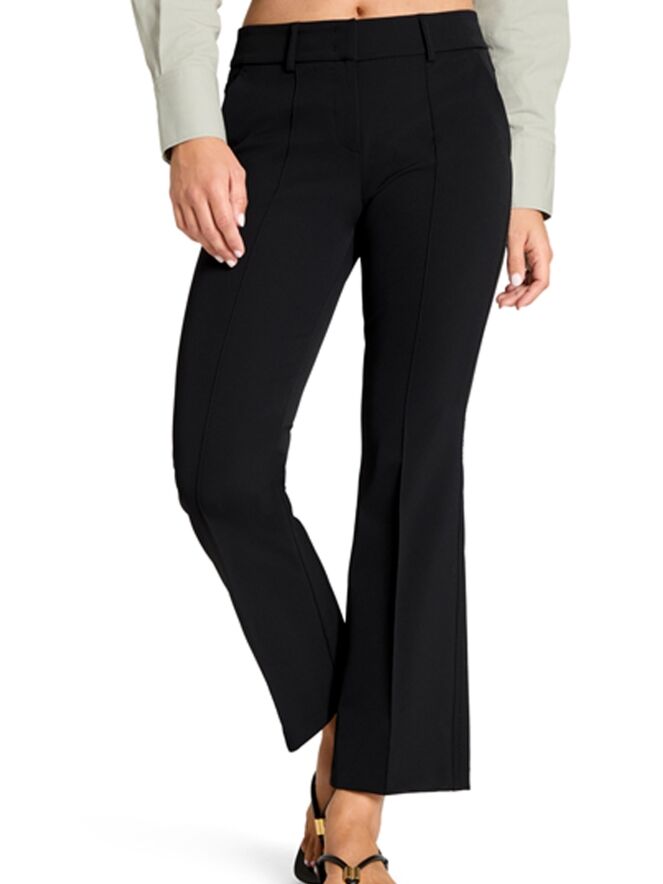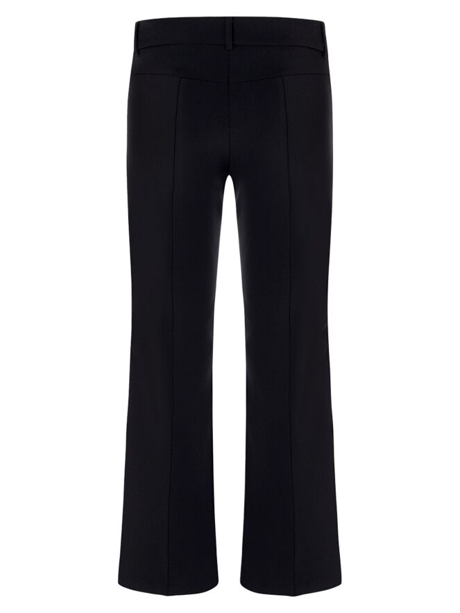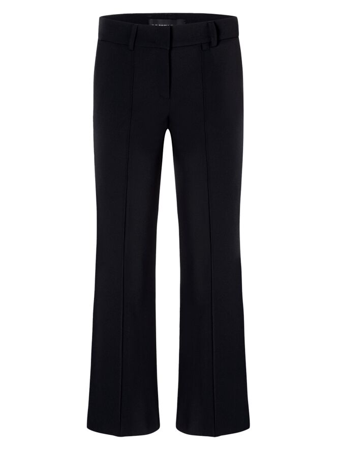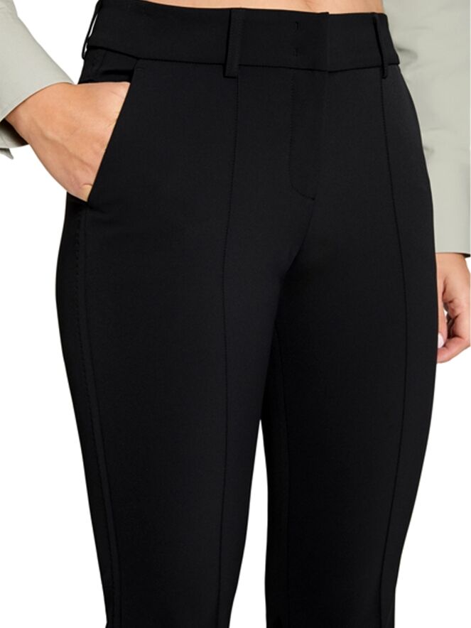 Un pantalon de Cambio en noir. Une couture inversée descend au centre des jambes. Le long des côtés se trouve un galon noir décoratif avec une couture ton sur ton. Le pantalon est doté de poches fendues et peut être lavé à la main.
