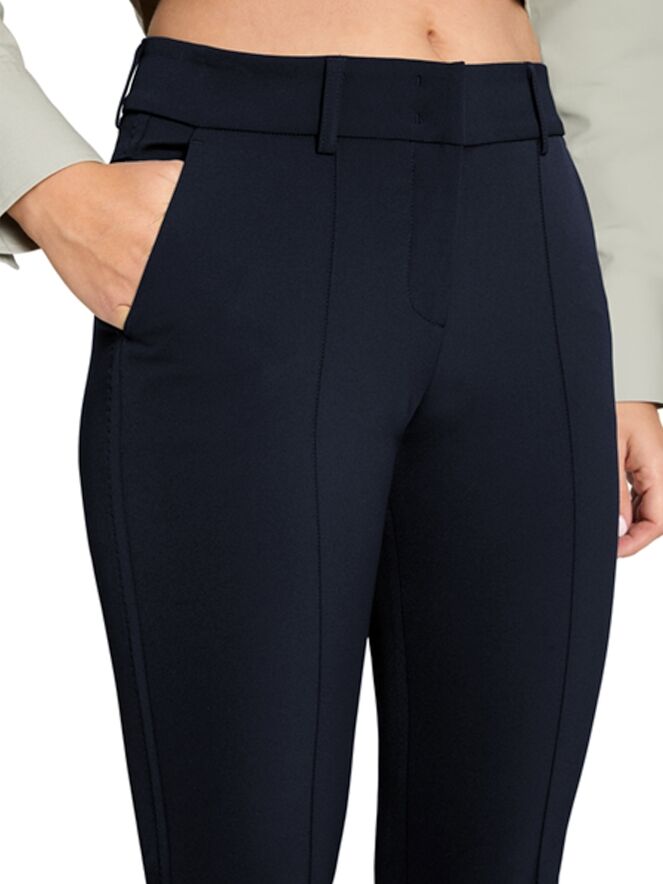 Un pantalon de Cambio en bleu marine. Une couture inversée descend au centre des jambes. Le long des côtés se trouve un galon noir décoratif avec une couture ton sur ton. Le pantalon est doté de poches fendues et peut être lavé à la main.