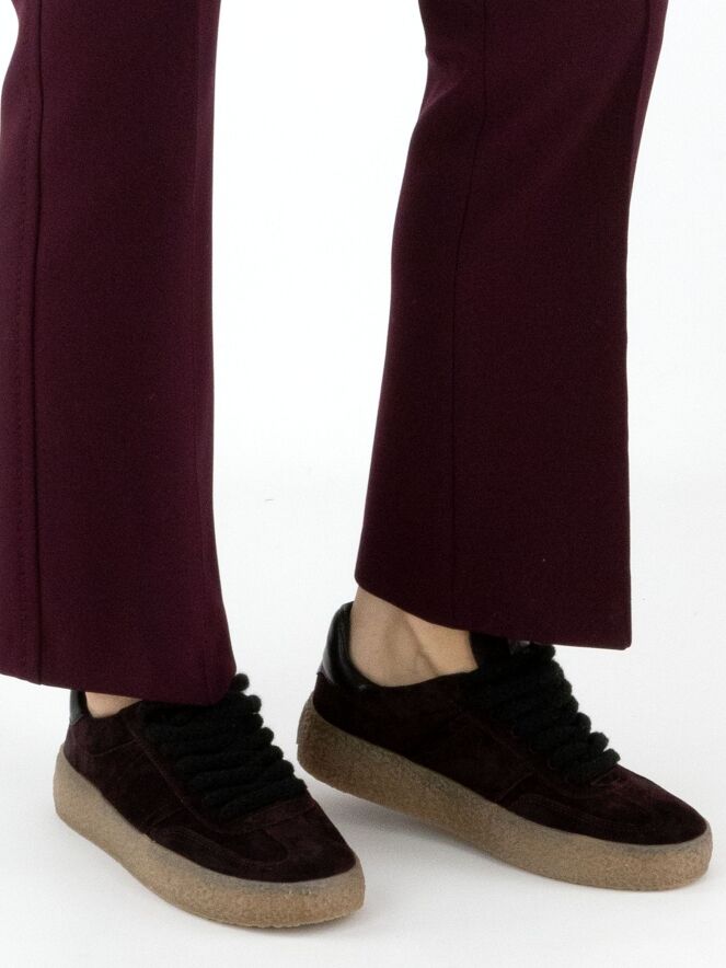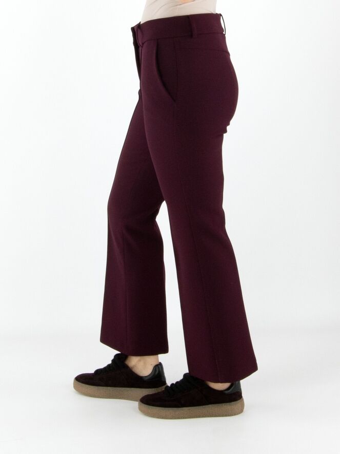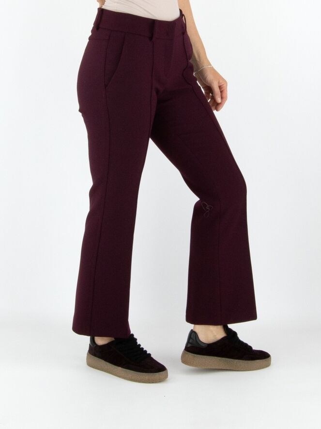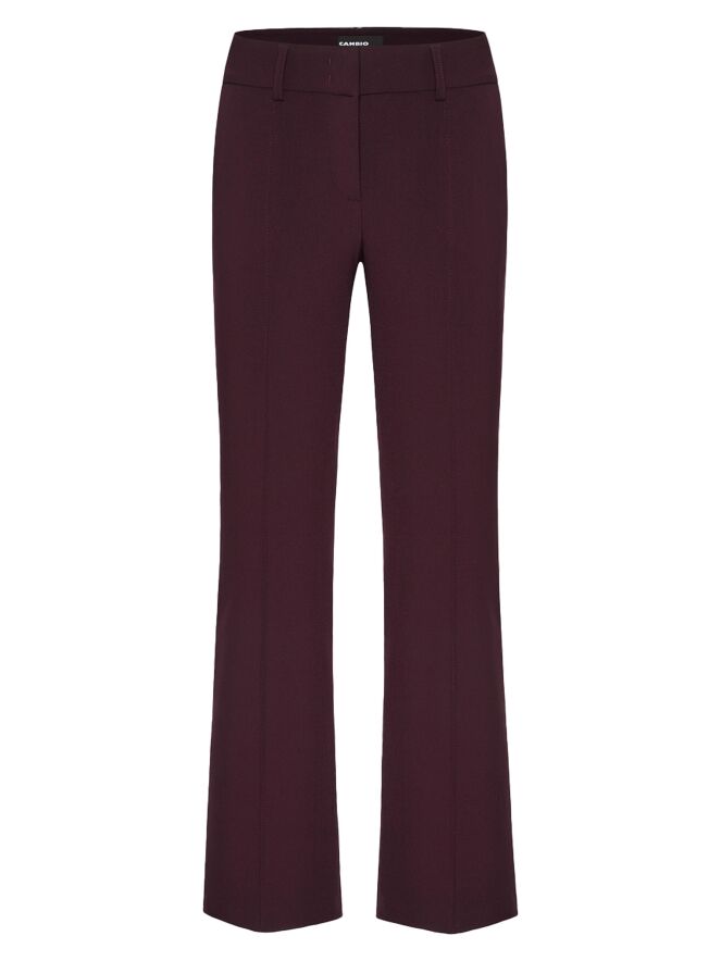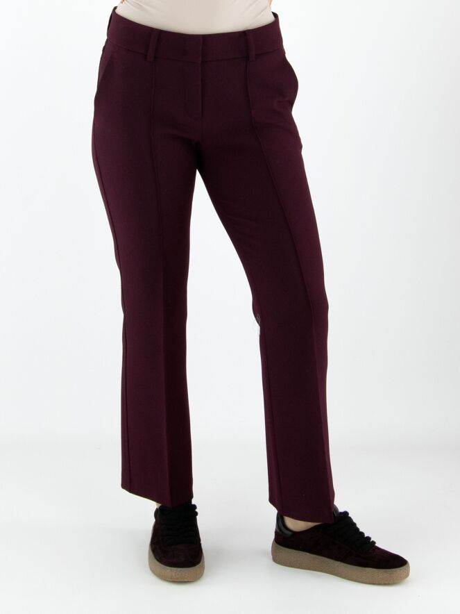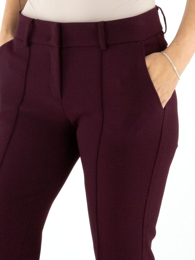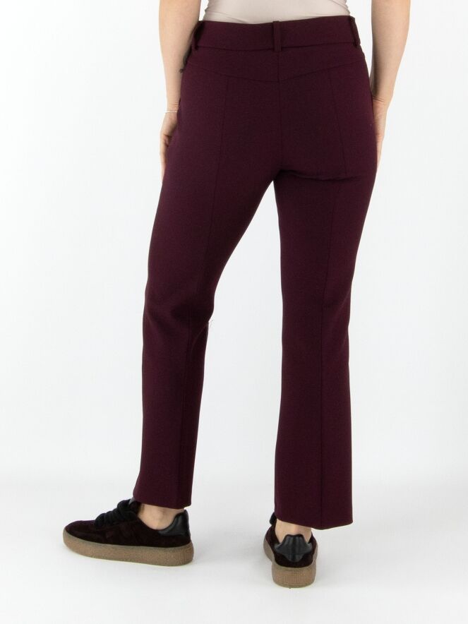 Pantalon Cambio en rouge aubergine. Une couture inversée traverse le centre des jambes. Un fil décoratif est travaillé en passepoil le long des côtés. Le pantalon possède des poches latérales et peut être lavé à 30 degrés.