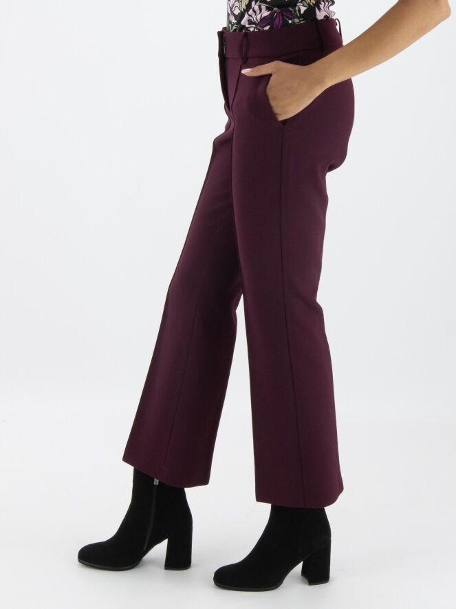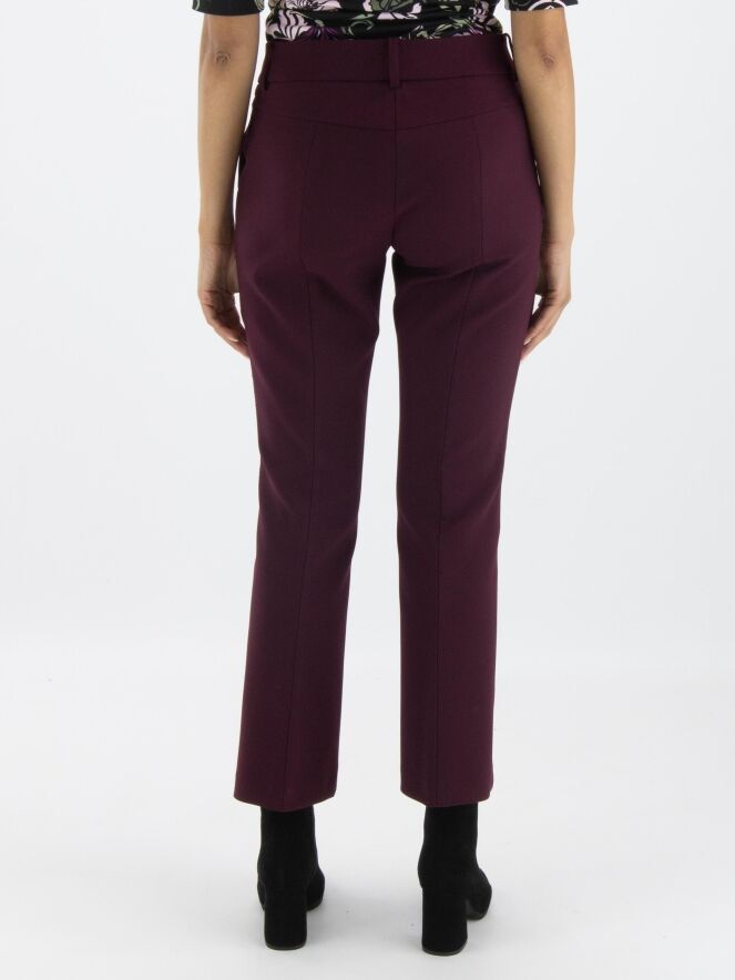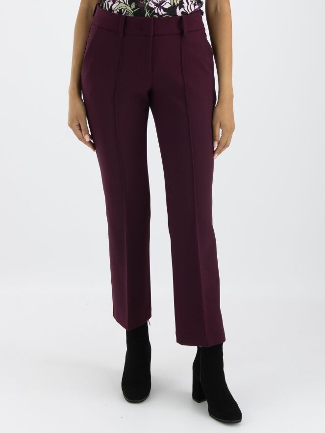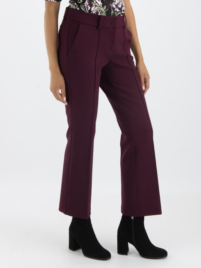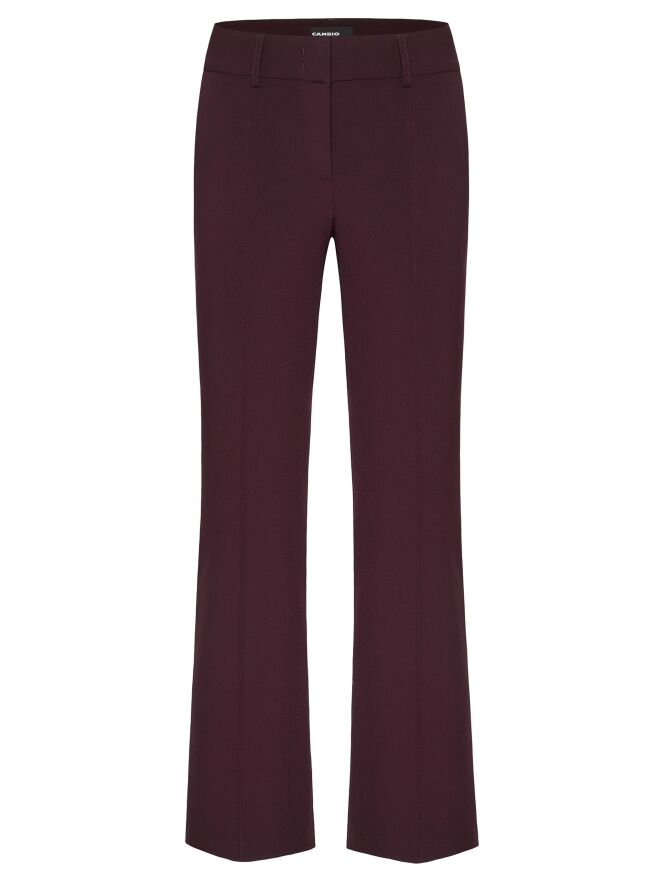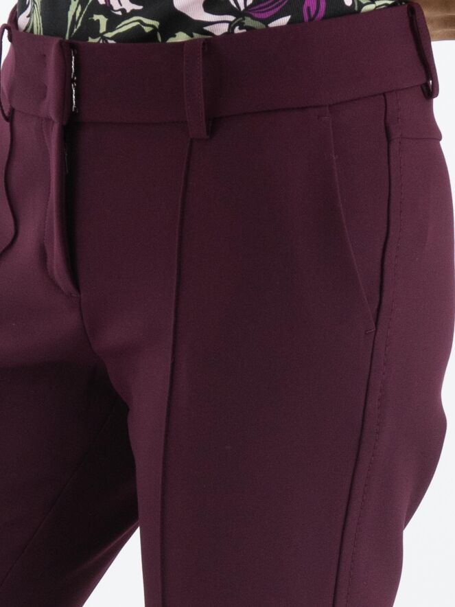 Un pantalon de Cambio en bordeaux. Des coutures décoratives longent les côtés, avec une couture supplémentaire au centre des jambes. Le pantalon a des poches latérales et peut être lavé à 30 degrés.