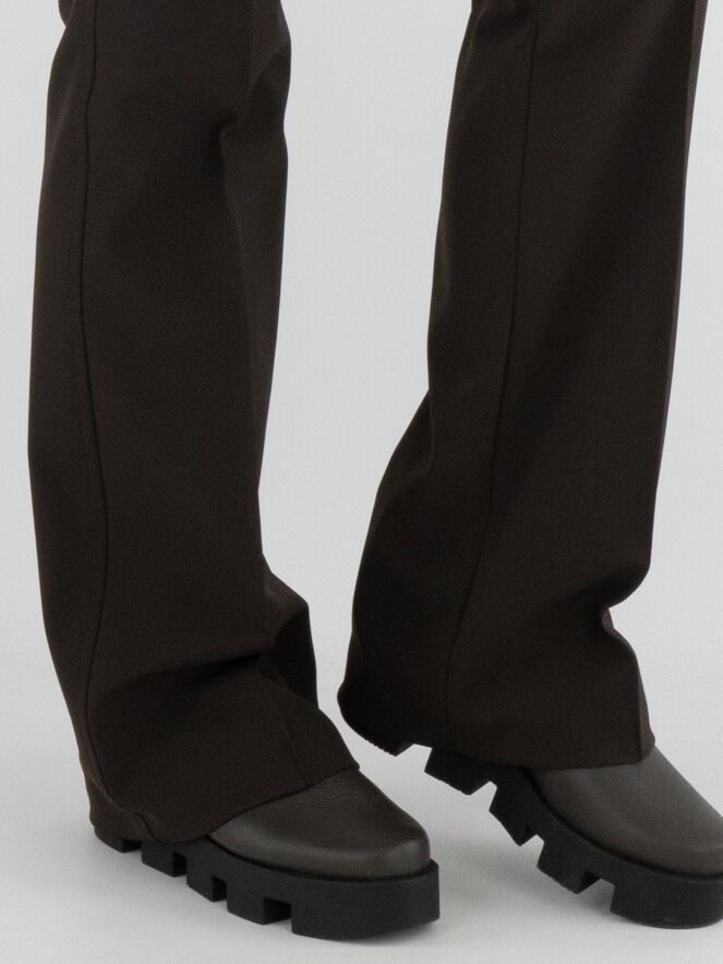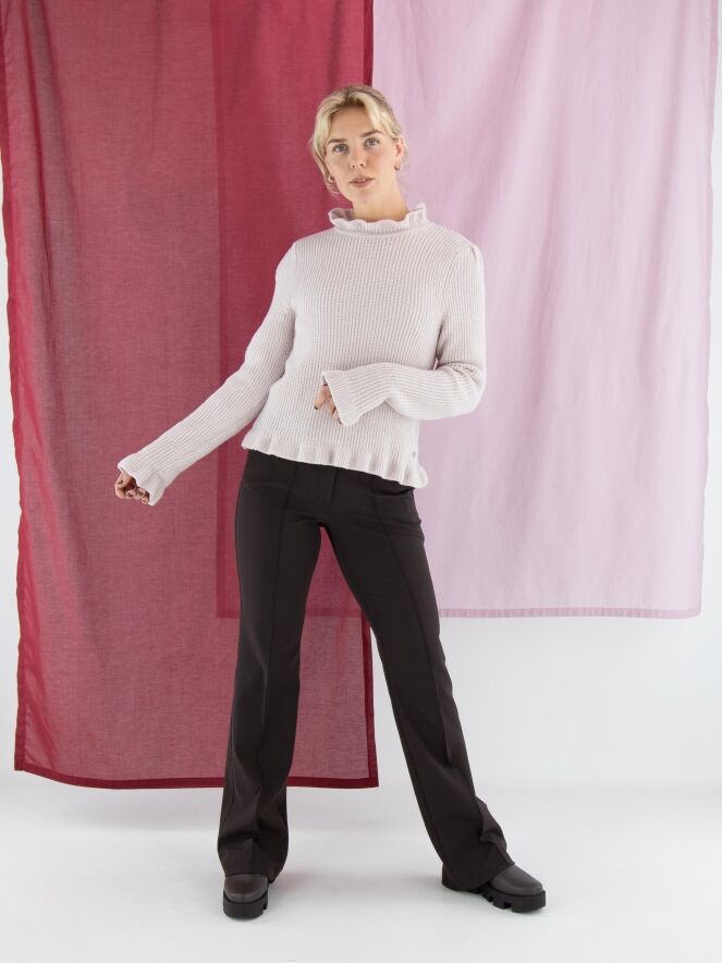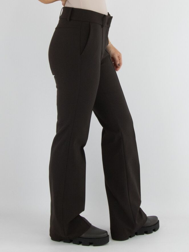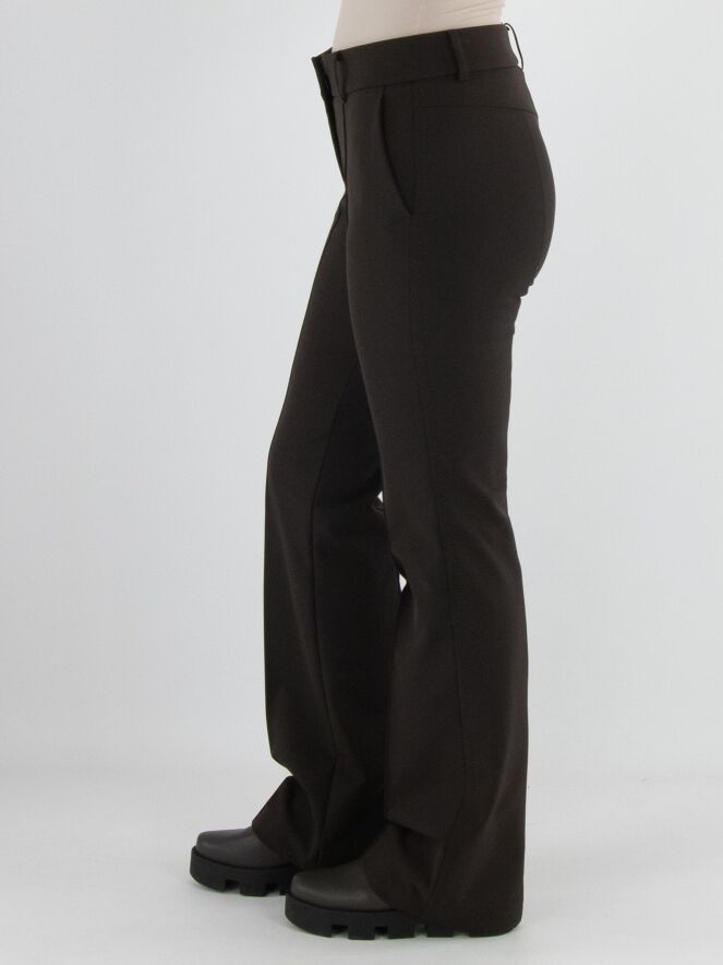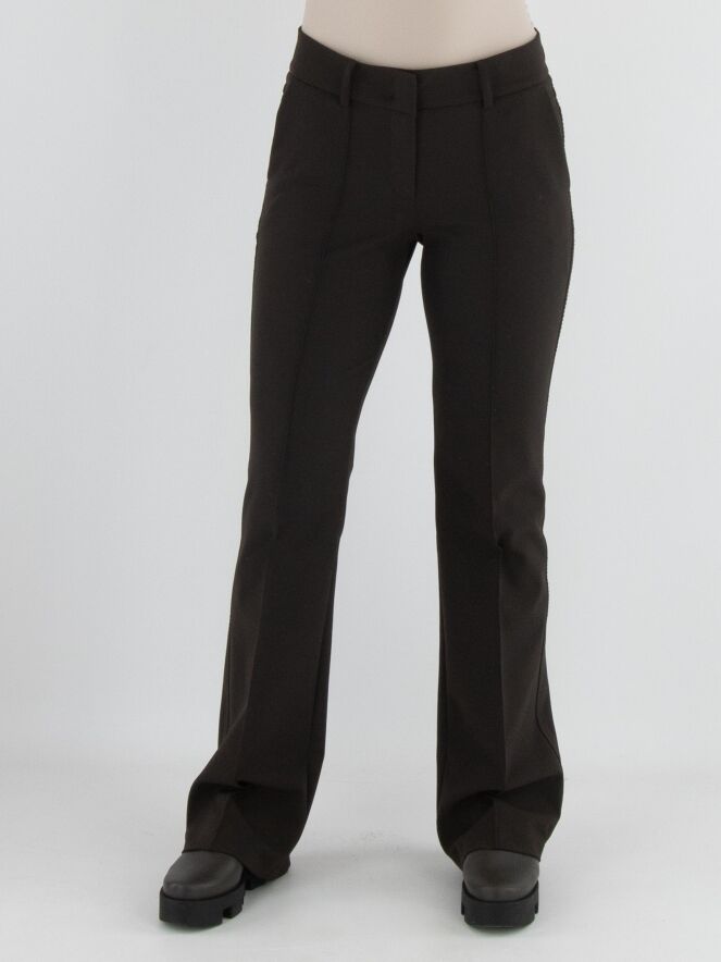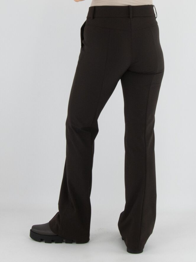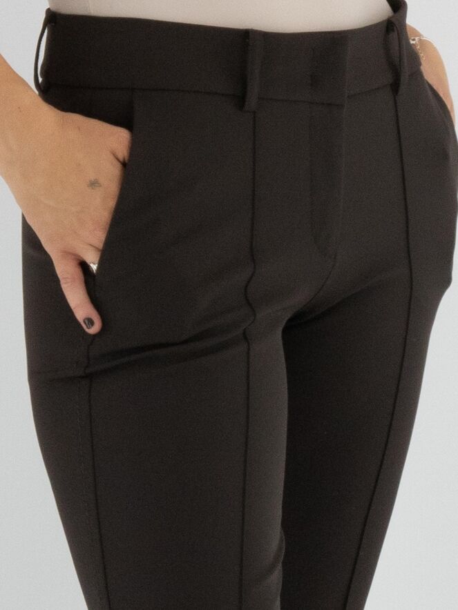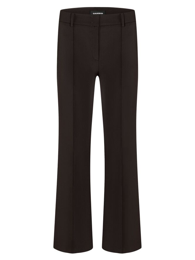 Pantalon Cambio dans une teinte moka. Une couture centrale parcourt les jambes, avec un fil décoratif le long des côtés extérieurs. Le pantalon possède des poches italiennes et peut être lavé à 30 degrés.