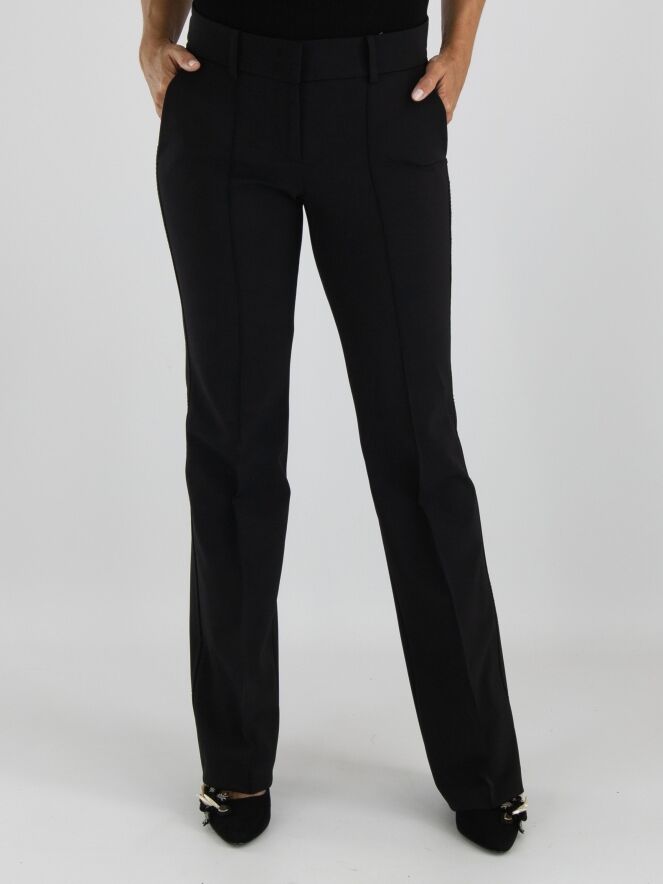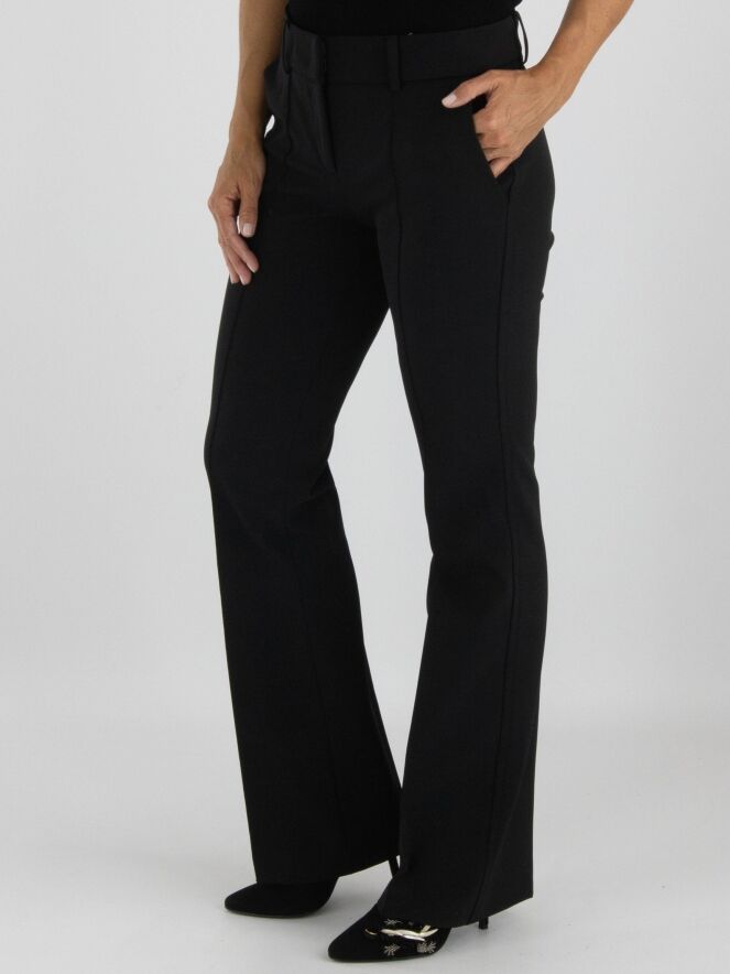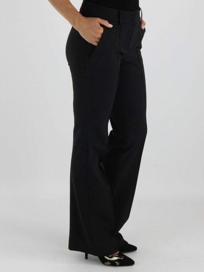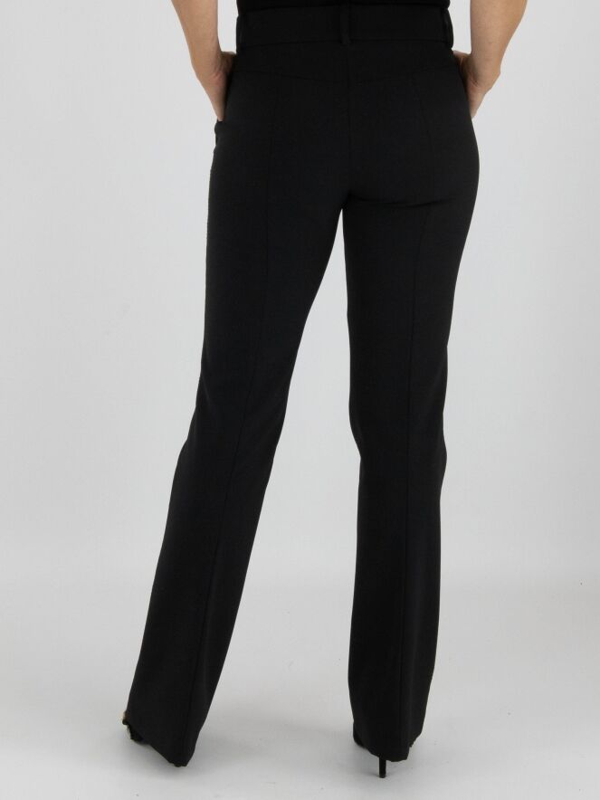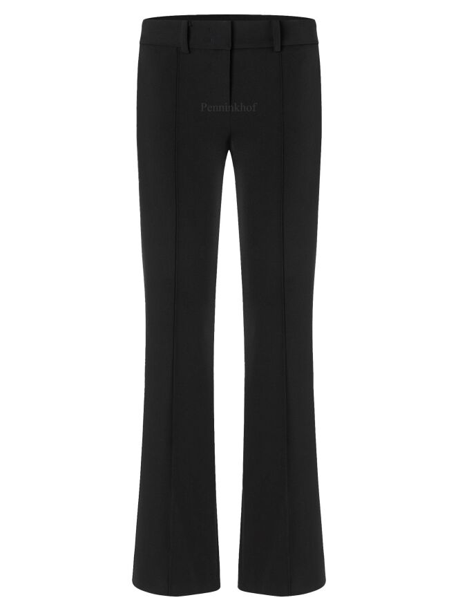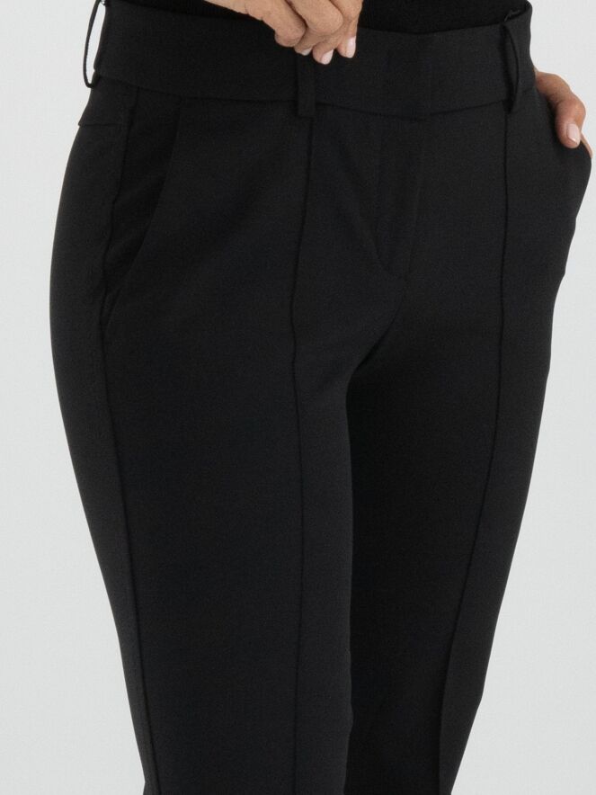 Pantalon de Cambio en noir. Le long des côtés se trouve un passepoil avec une couture décorative surpiquée. Au milieu des jambes, il y a une couture surpiquée et le pantalon a des poches latérales. Ce pantalon peut être lavé à 30 degrés.