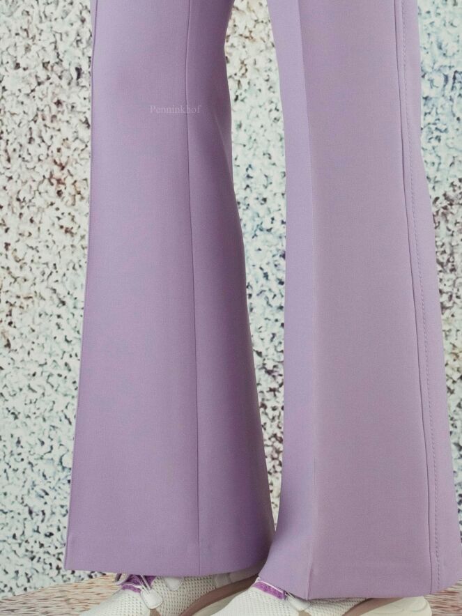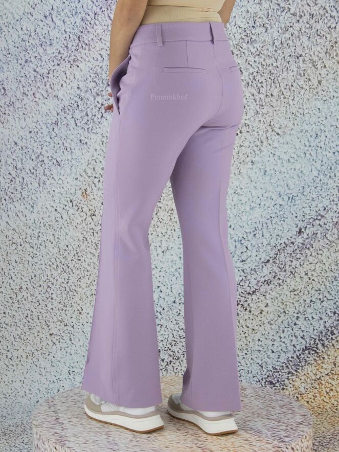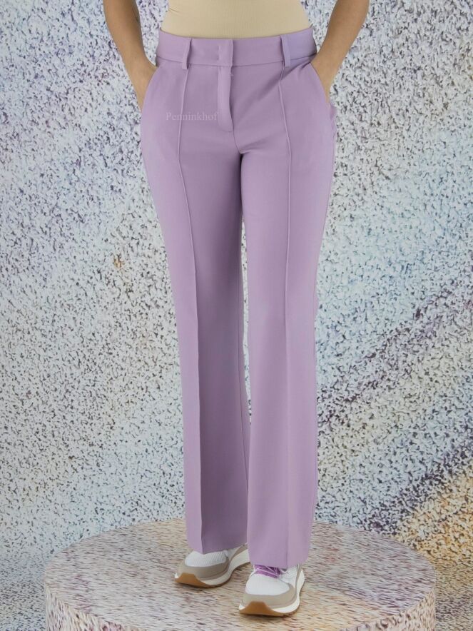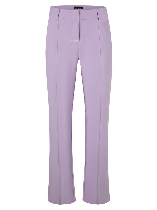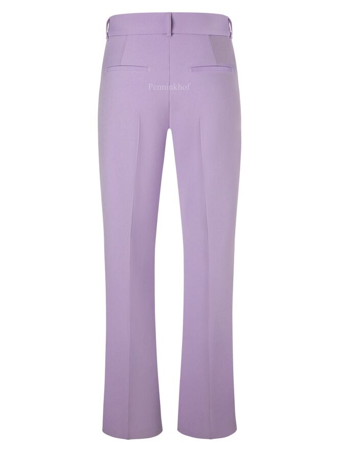 Pantalon évasé de la marque Cambio, de couleur lilas. Il est orné d'une couture décorative latérale et d'un pli de repassage sur l'avant de la jambe. Le pantalon est doté de poches latérales. Lavage à la main.