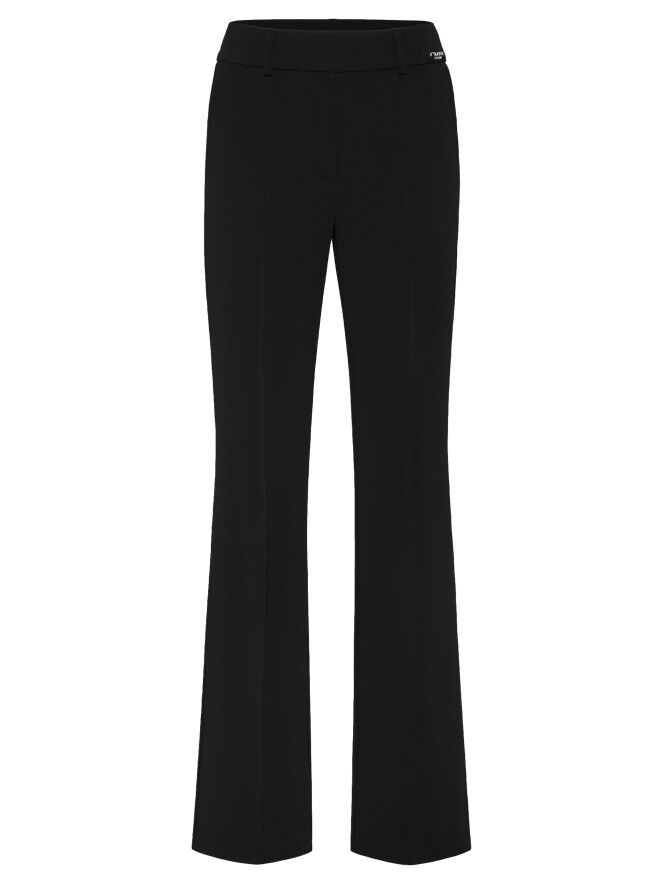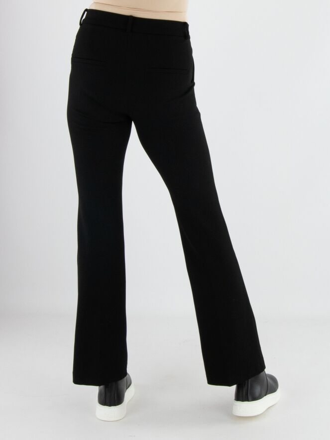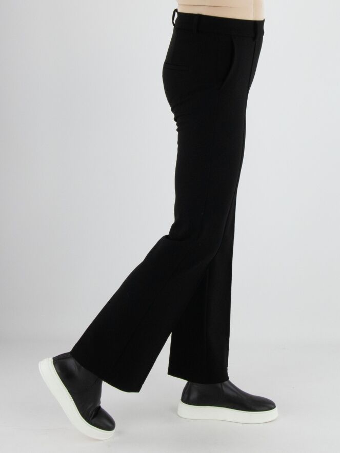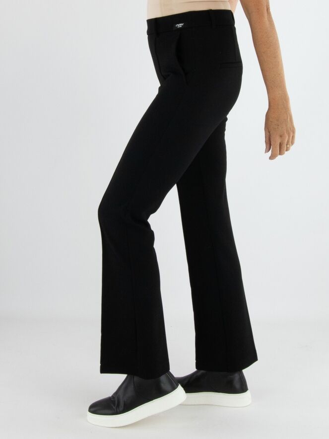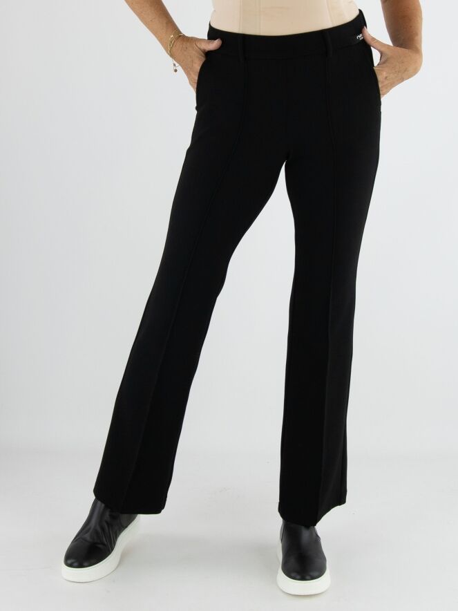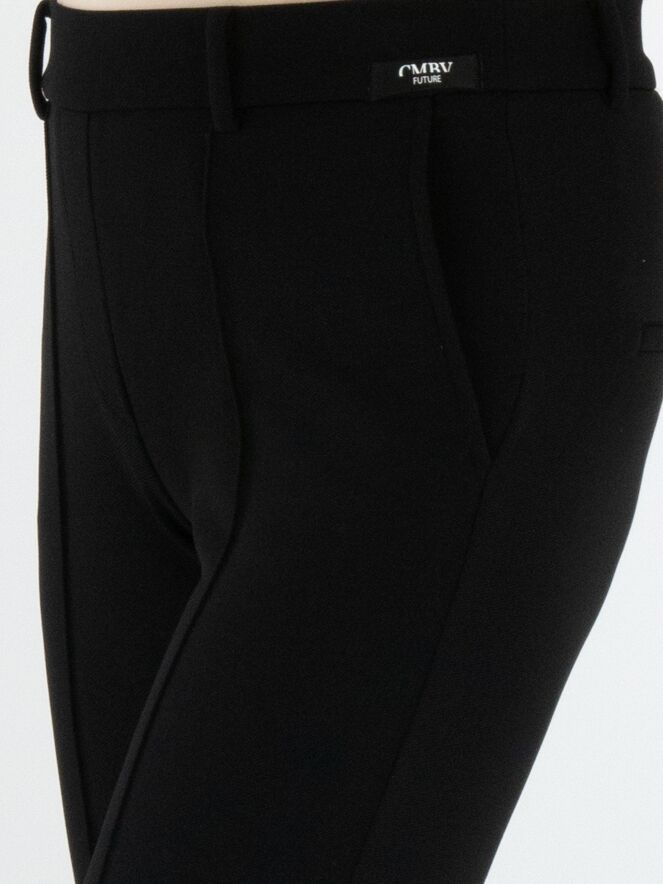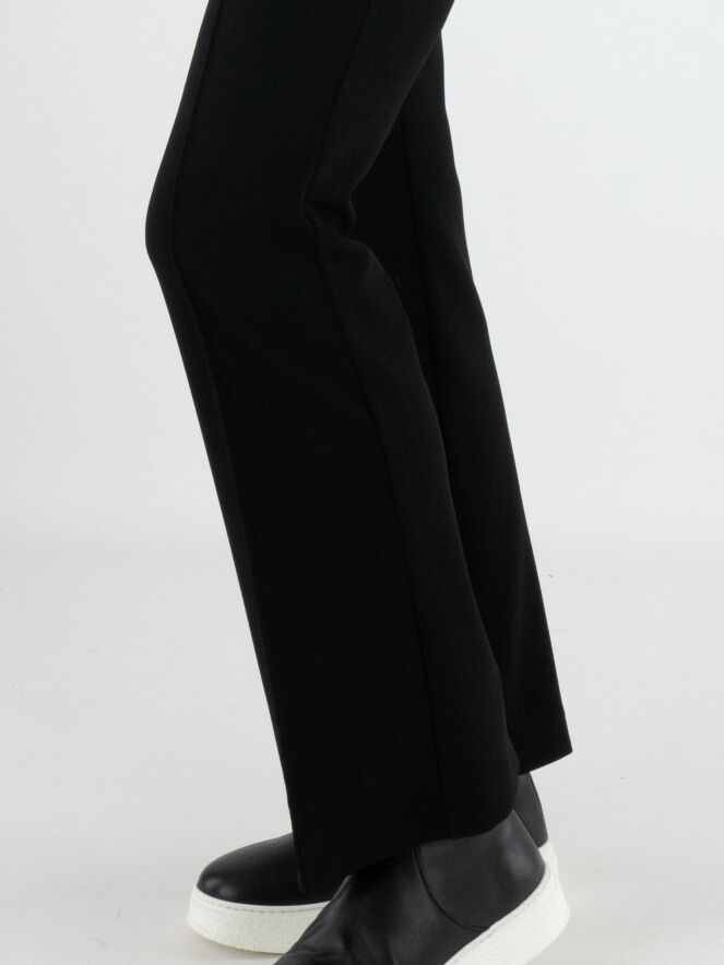 Pantalon de la marque Cambio en noir. La taille est élastiquée. Une couture inversée traverse le centre des jambes. Le pantalon est doté de poches fendues et doit être lavé à la main.