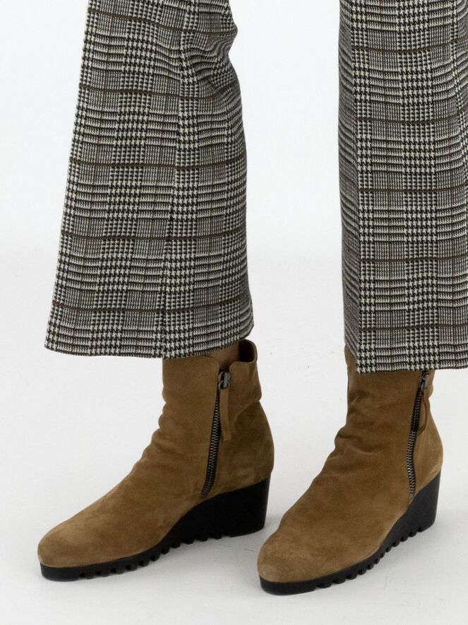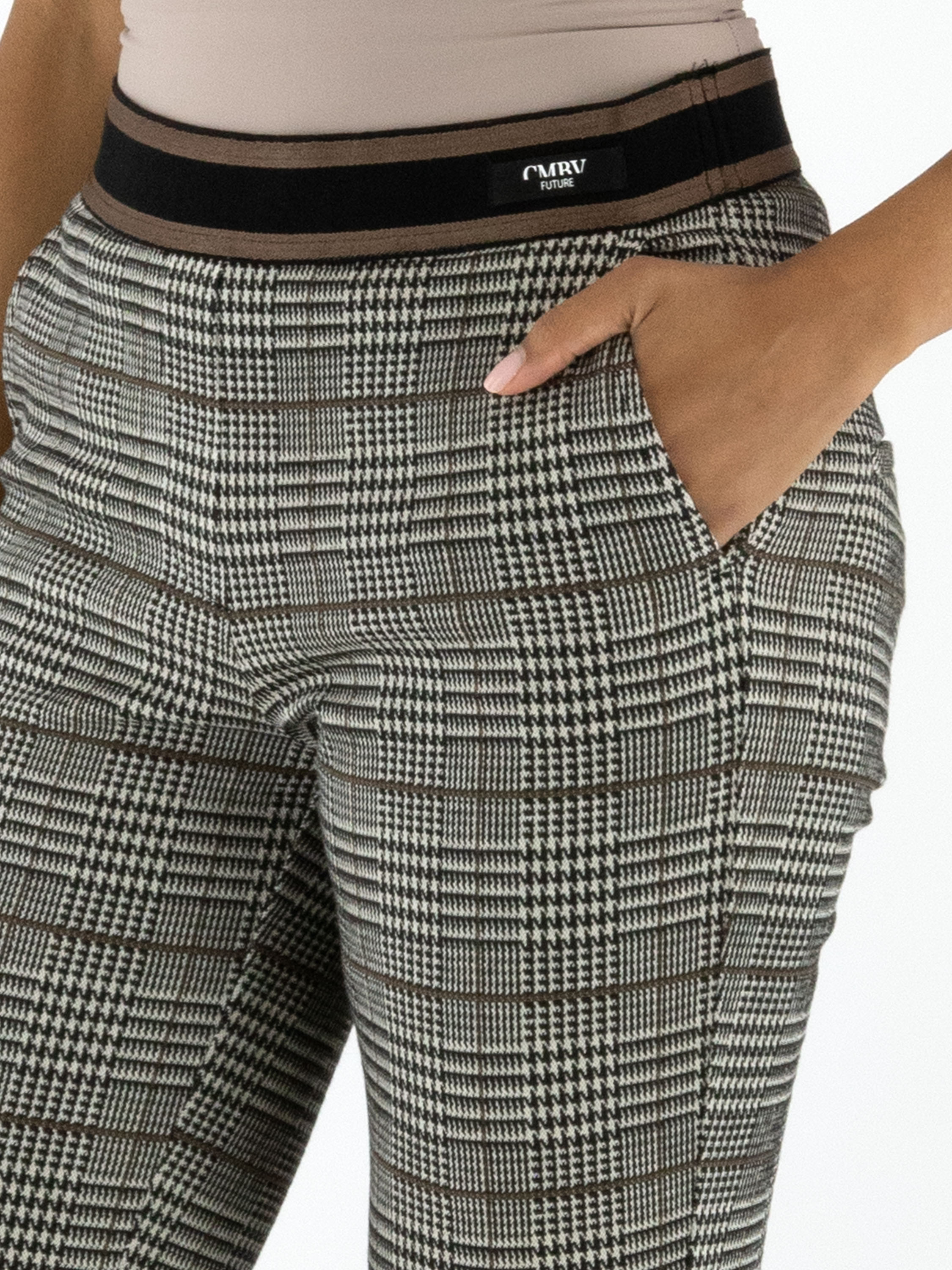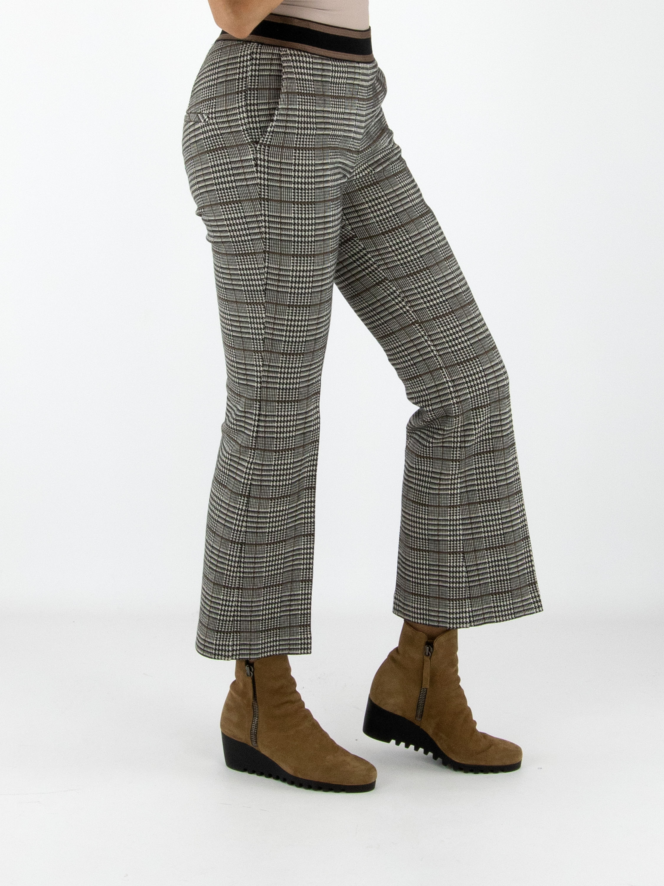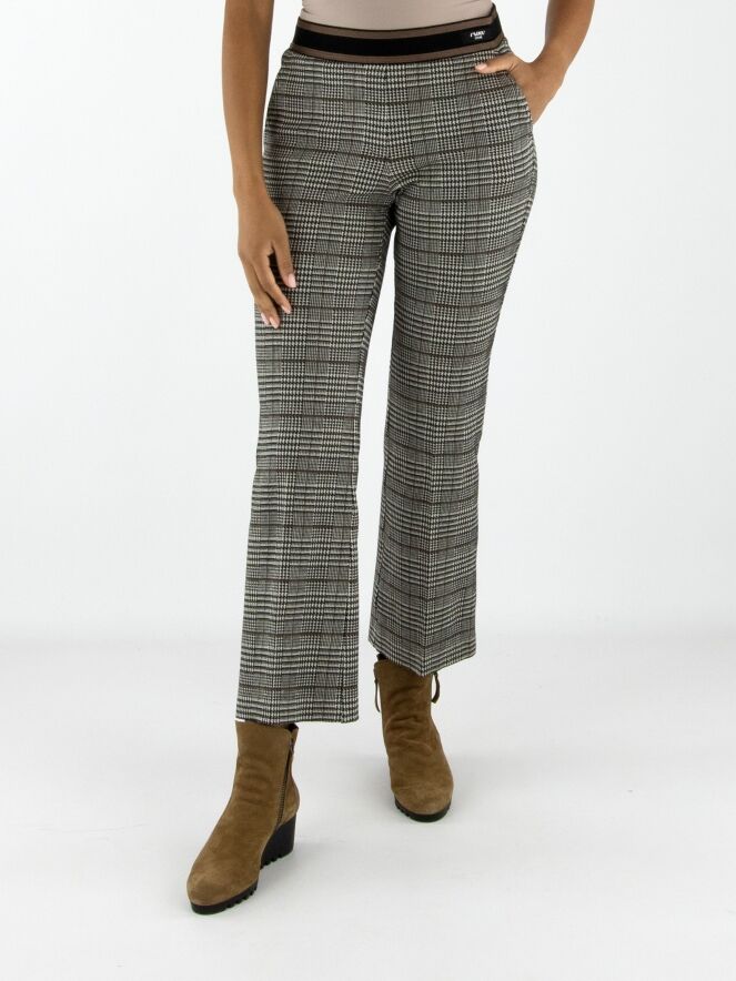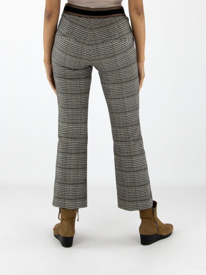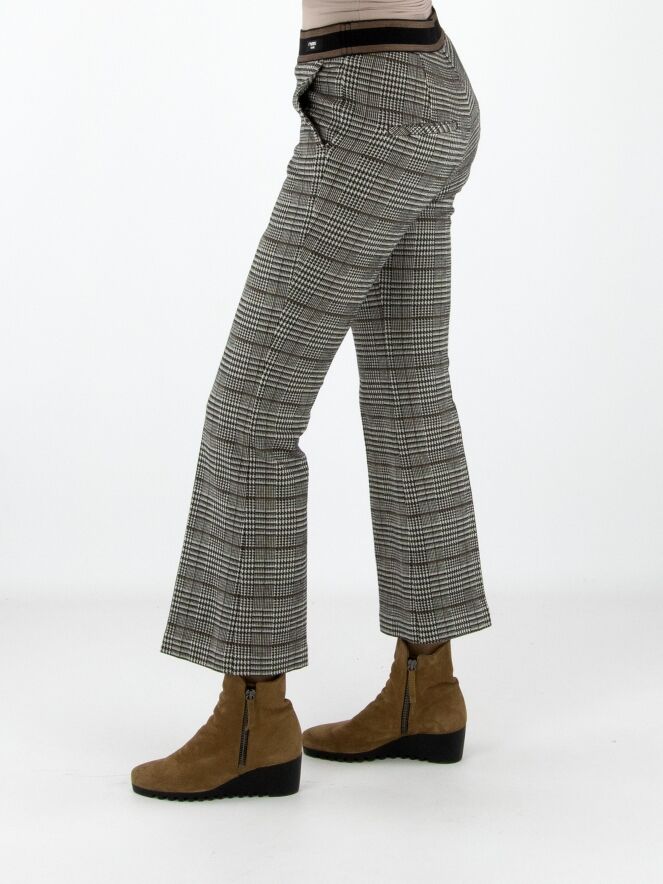 Pantalon évasé de la marque Cambio dans un motif Prince-de-Galles aux tons de blanc cassé, noir et brun moka. La taille est élastiquée avec un motif à rayures. Un pli marqué traverse le centre des jambes. Ce pantalon doit être lavé à la main.