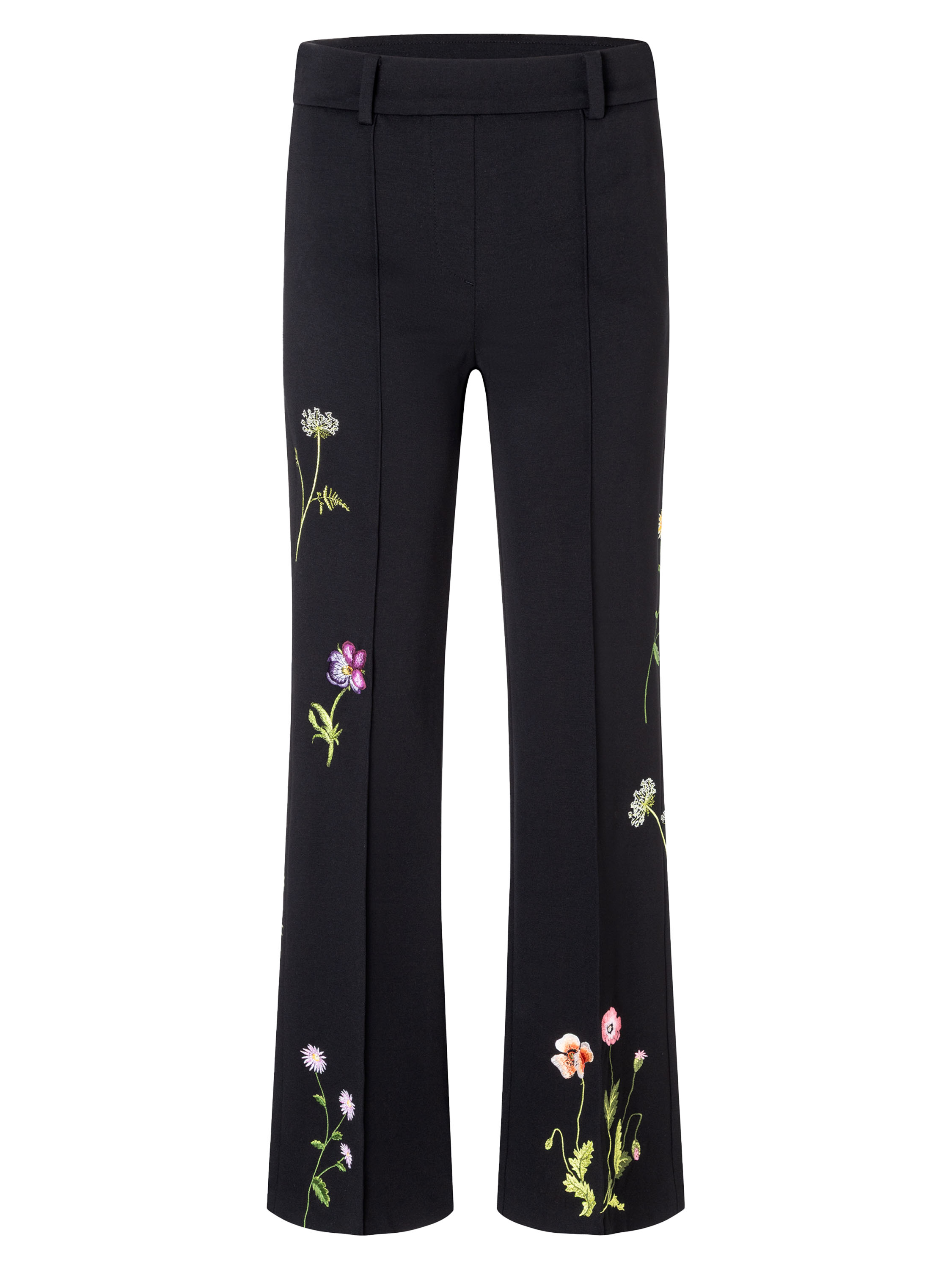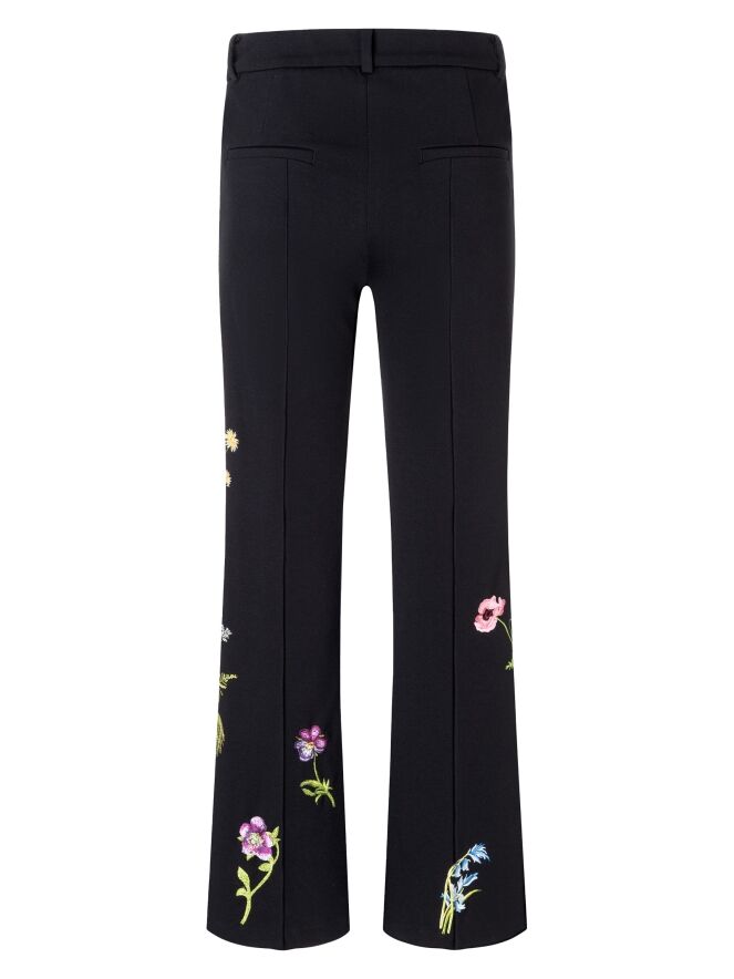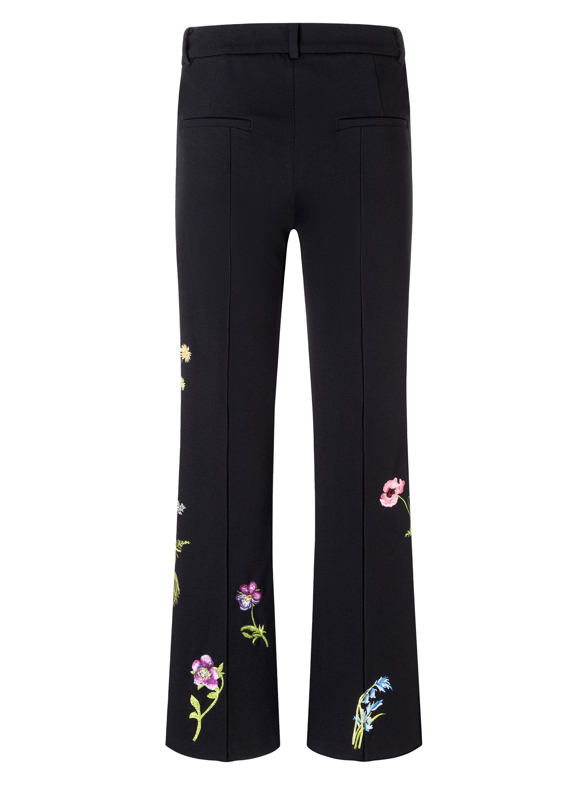 Un pantalon de Cambio de couleur noire avec plusieurs fleurs fraîches brodées sur les jambes. La taille est dotée d’une bande élastique. Une couture inversée court au centre des jambes. Le pantalon possède des poches fendues et peut être lavé à la main.