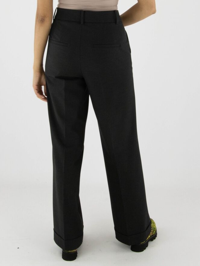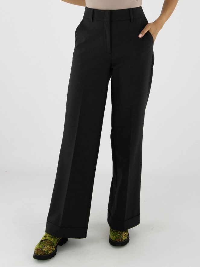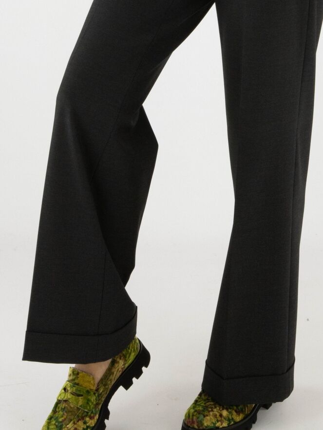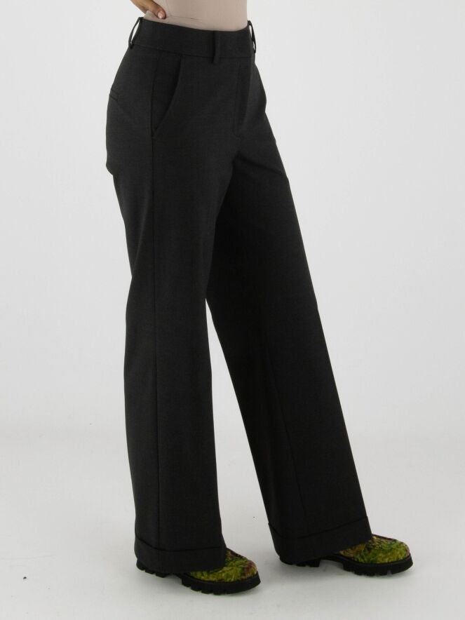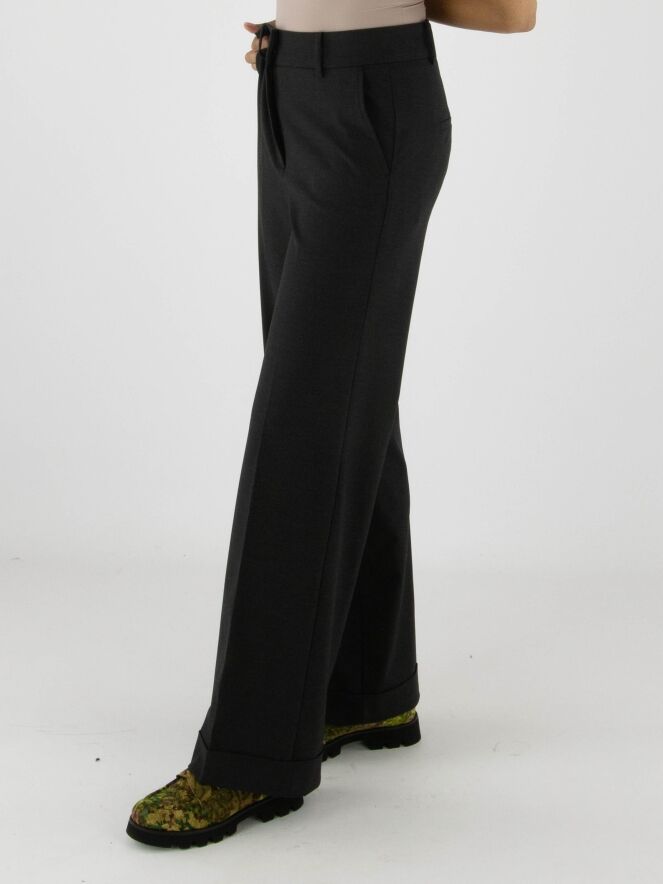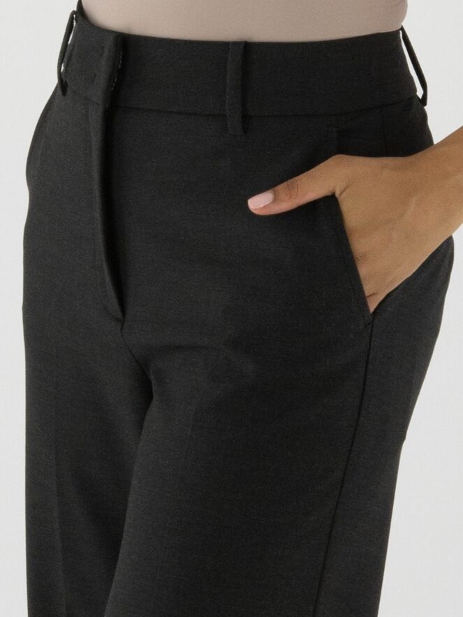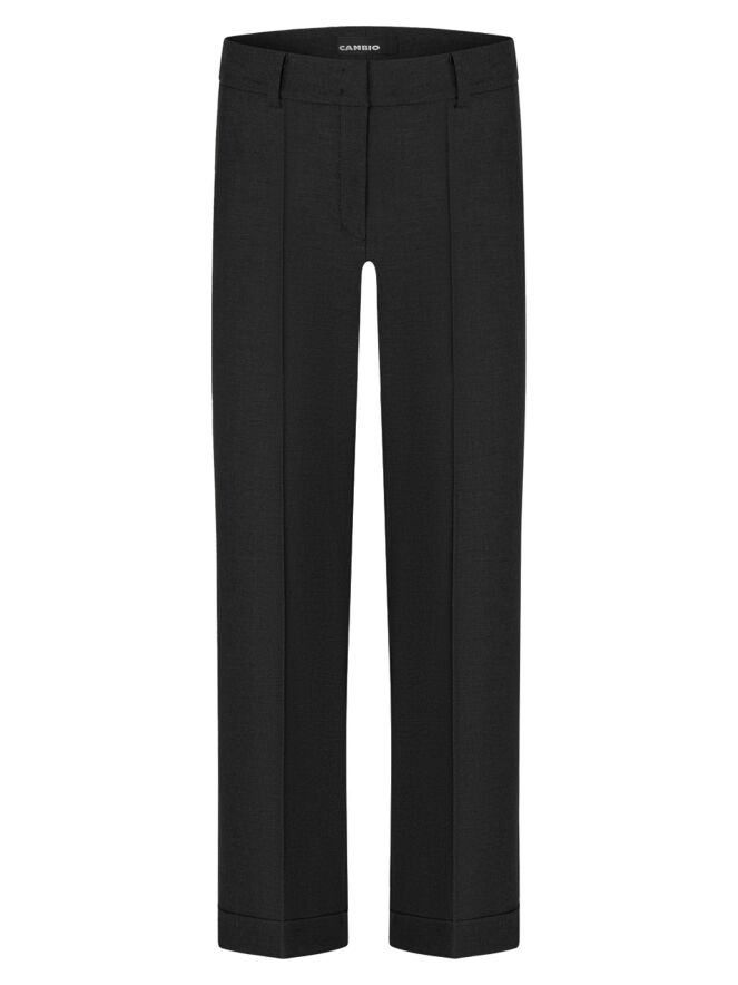 Pantalon de la marque Cambio en gris anthracite. Un pli marqué traverse le centre des jambes. Le pantalon possède des poches latérales et une coupe droite. Ce pantalon peut être lavé à 30 degrés.
