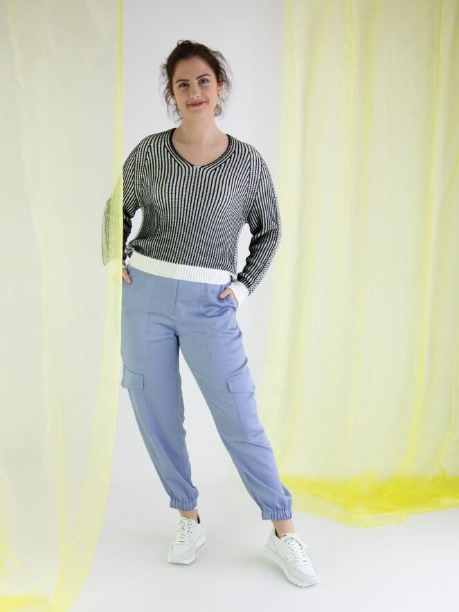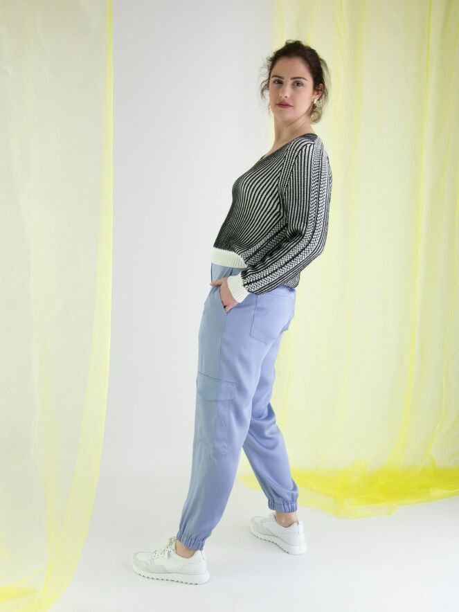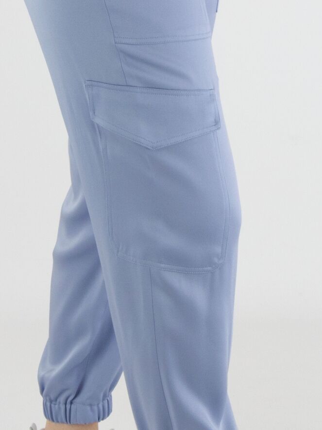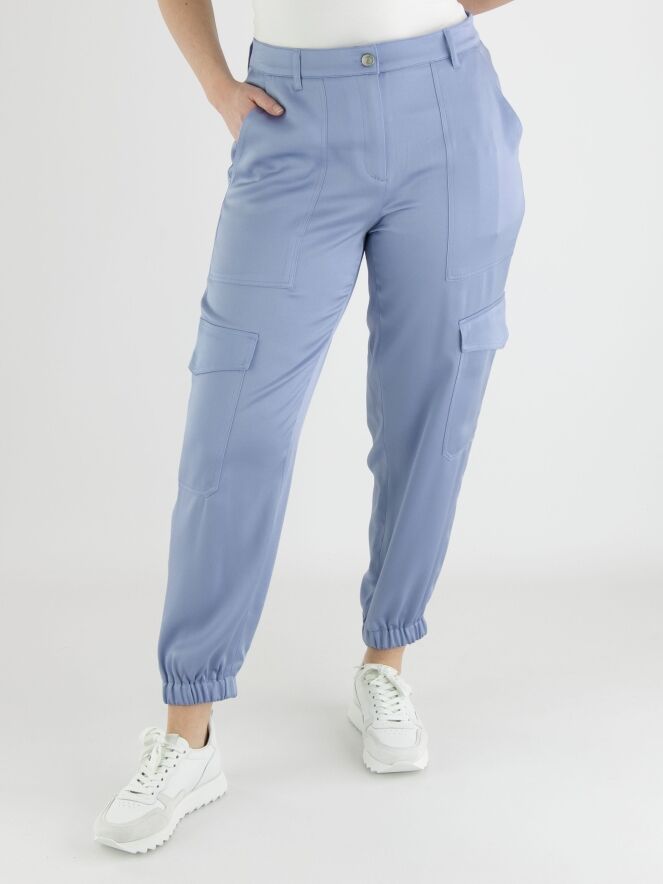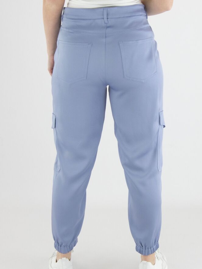 Un pantalon cargo en satin mat de Cambio dans un bleu lavande. Il y a un poignet élastique finement plissé en bas. Le pantalon est doté de poches latérales et peut être lavé à la main.