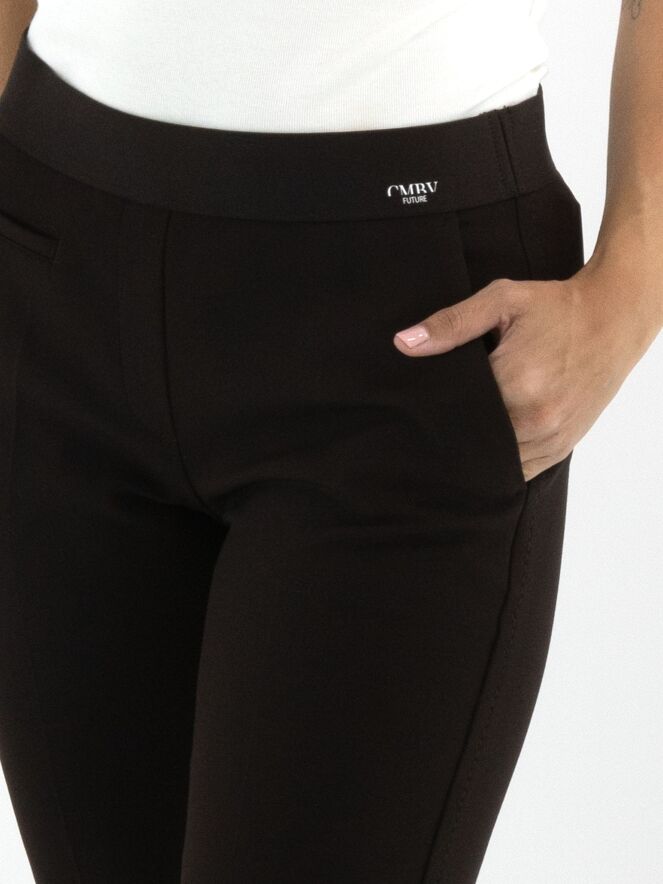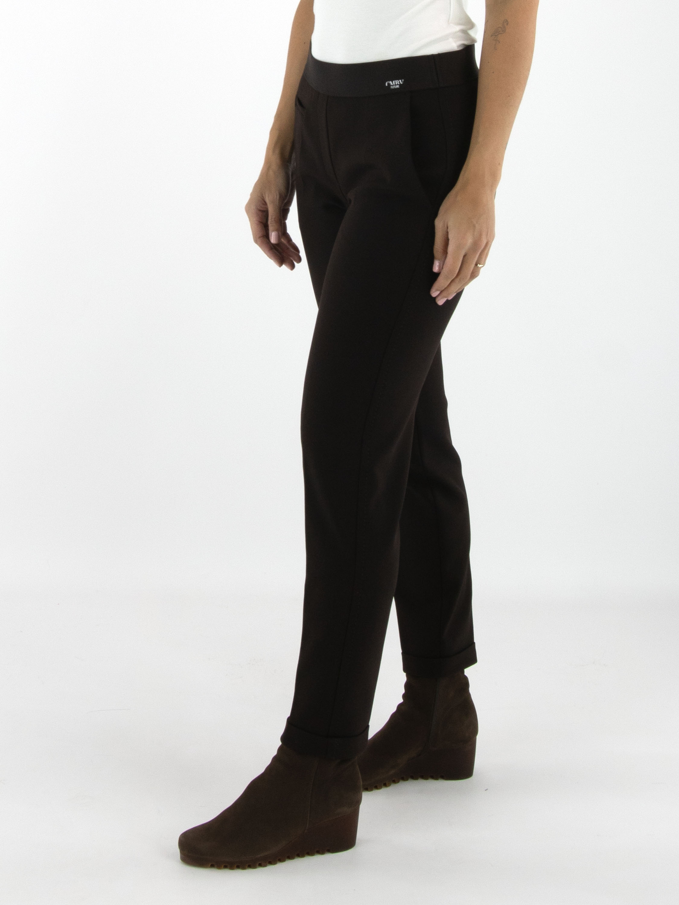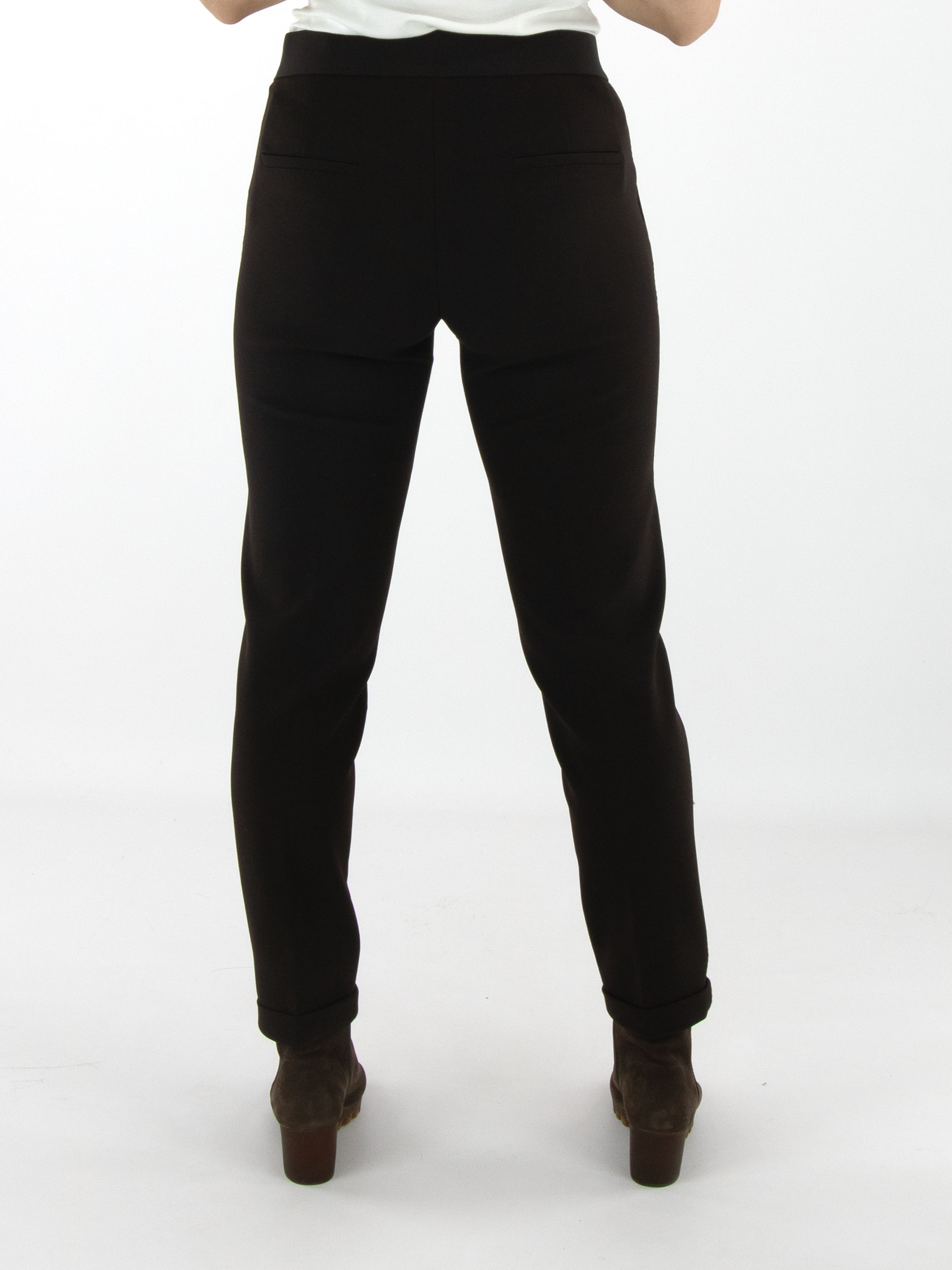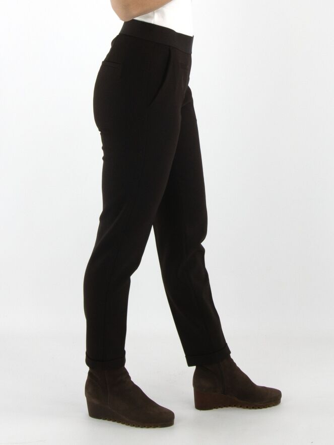 Un pantalon de Cambio en brun moka. La taille est dotée d’une ceinture élastique. Un pli marqué descend au centre de chaque jambe. Le pantalon possède des poches latérales et une couture décorative façon passepoil longe les côtés. Ce pantalon peut être lavé à la main.